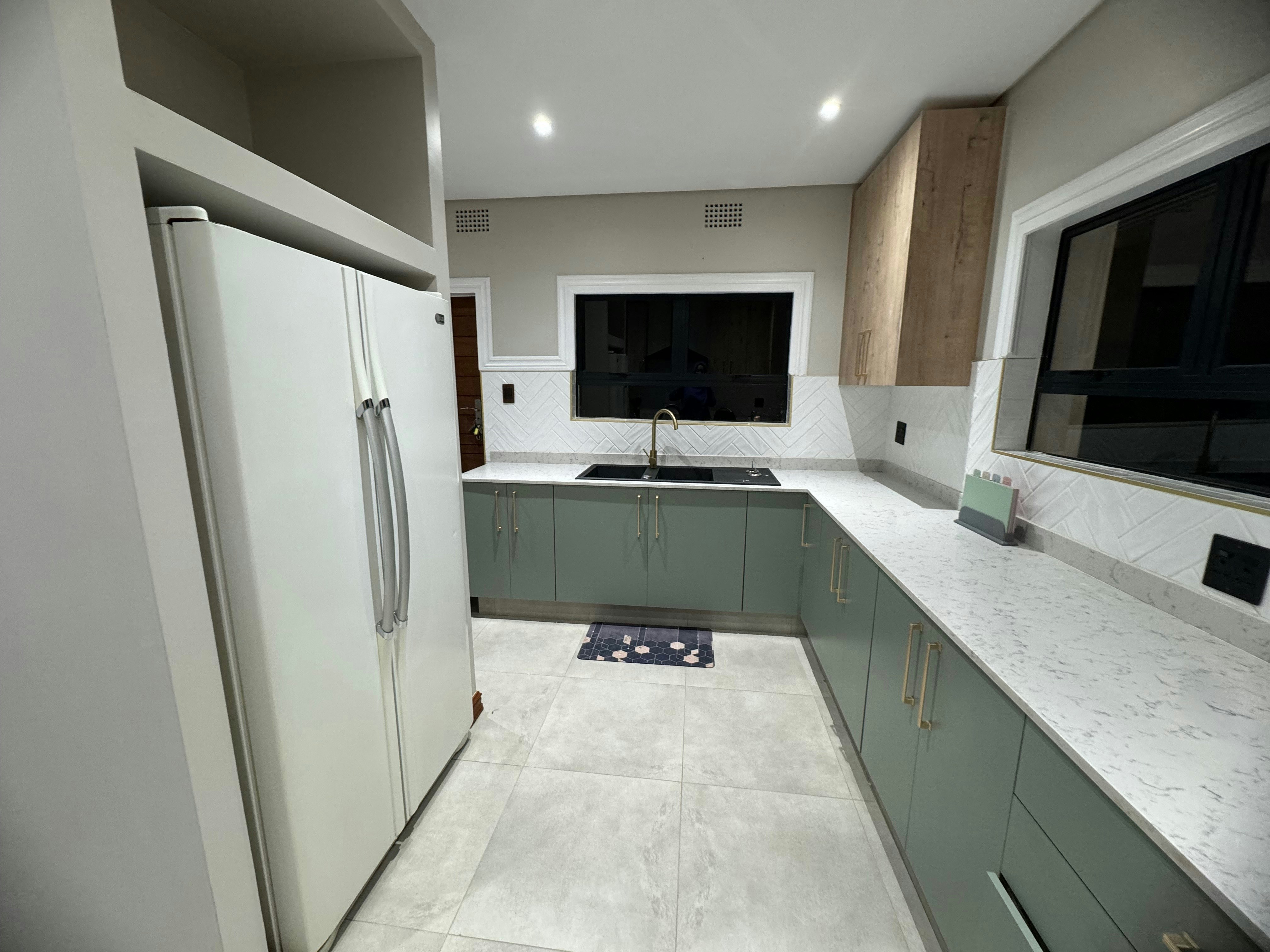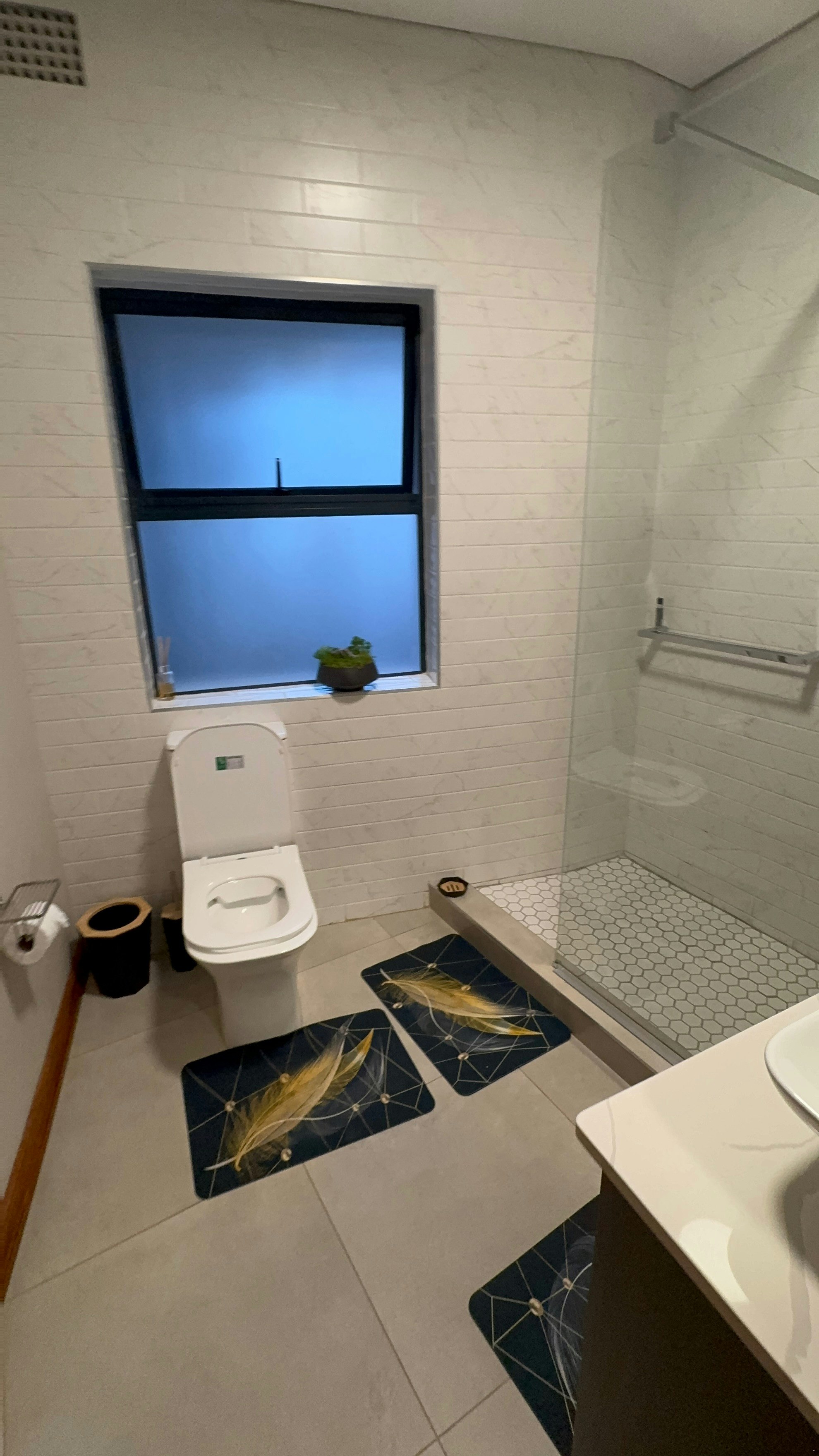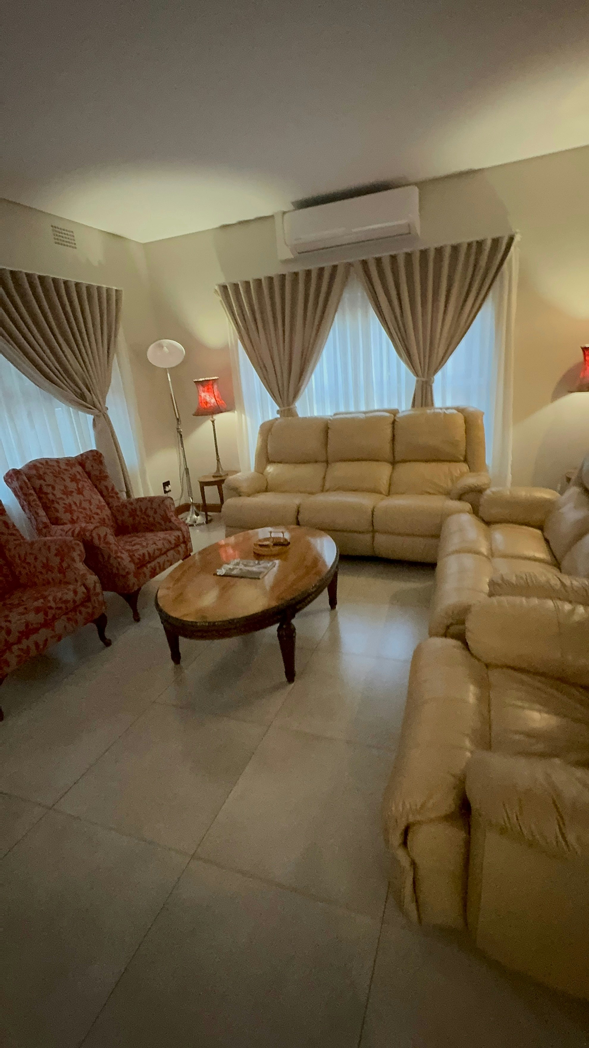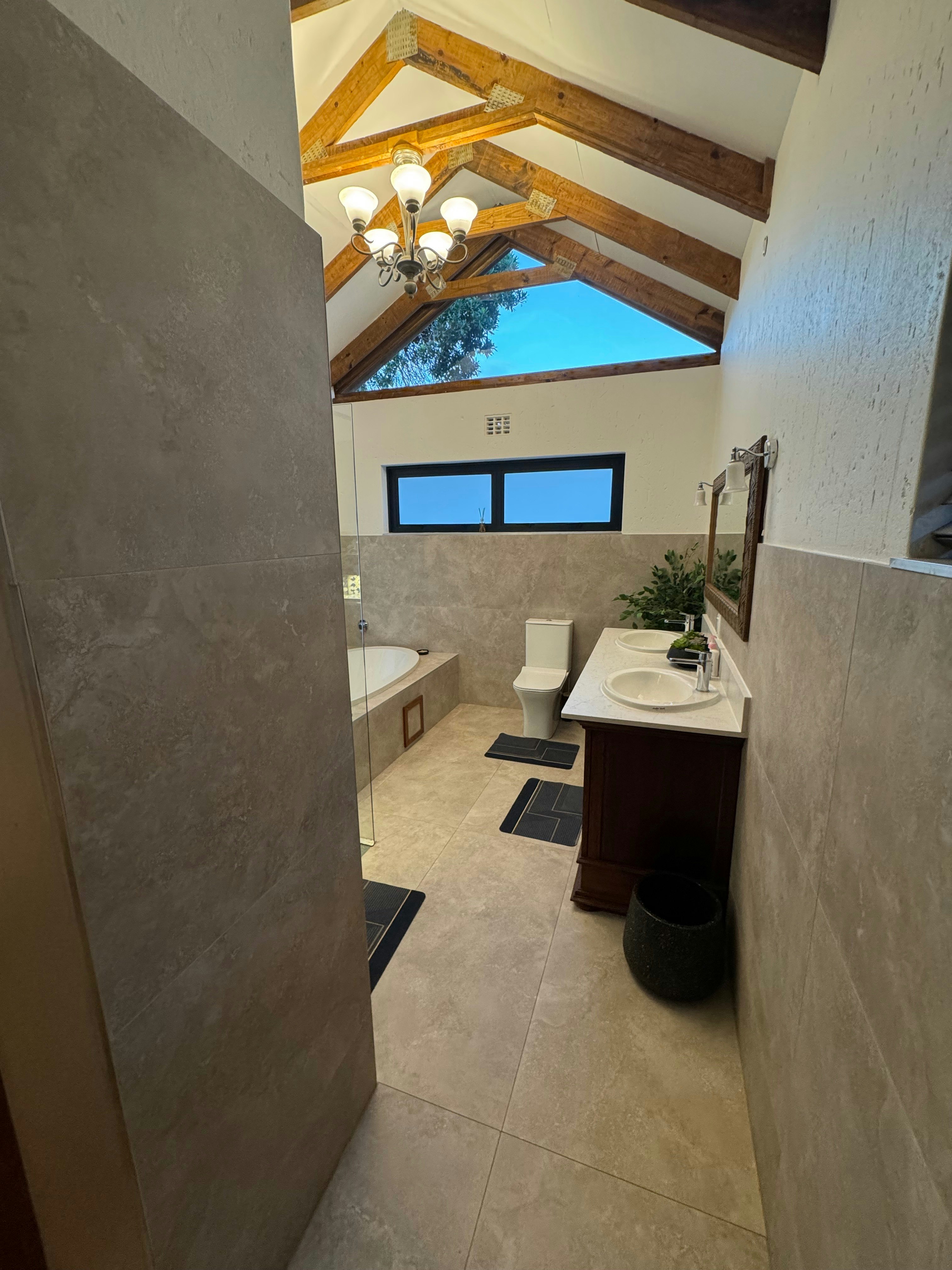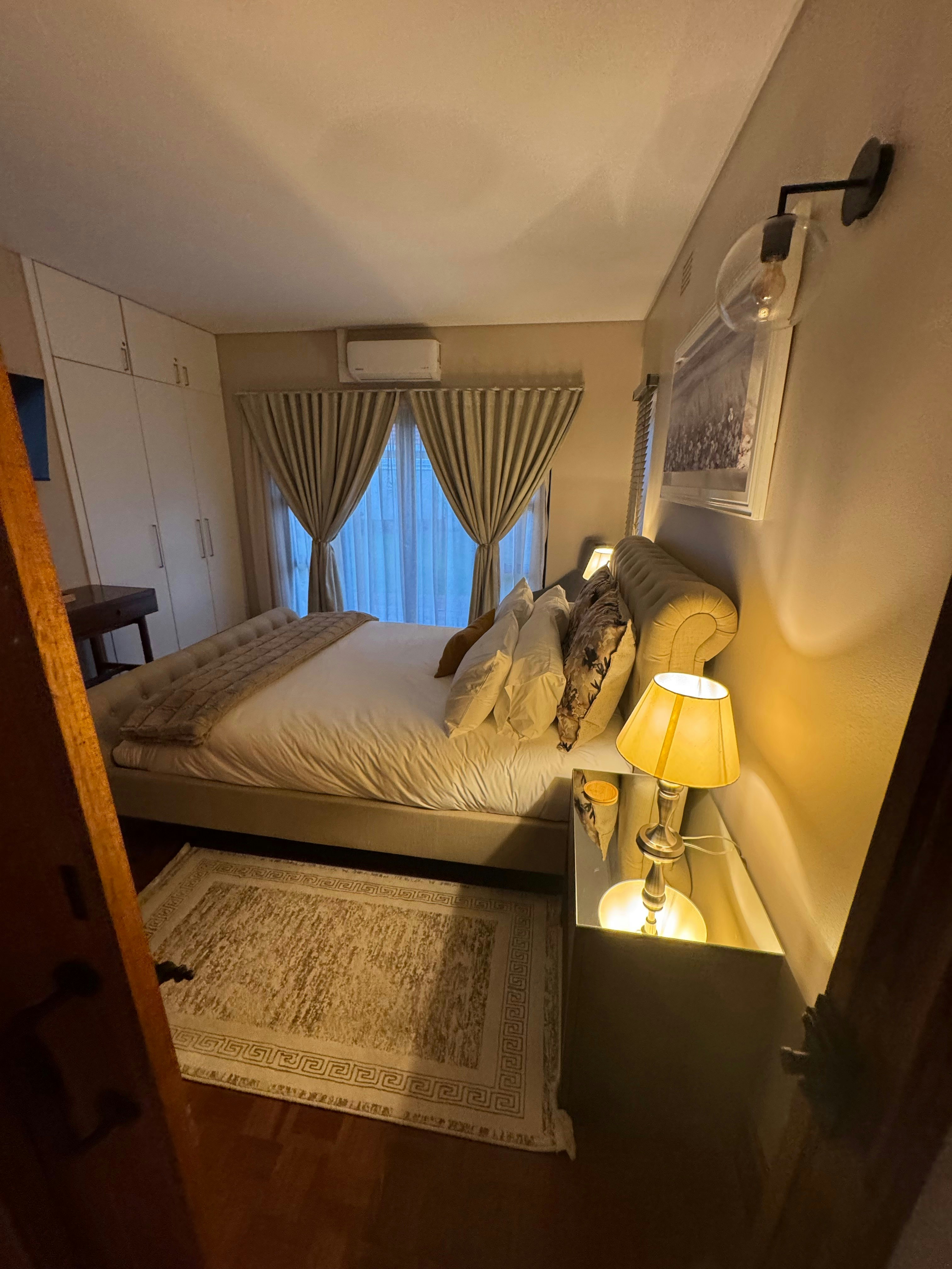 This house can accommodate 6 guests and comprises 3 tastefully furnished bedrooms and 3 bathrooms. The main bedroom is furnished with a queen-size bed. It has an en-suite bathroom fitted with a bath, shower, basin, and toilet. The second bedroom has a queen-size bed, while the third bedroom has 2 single beds. The 2 bathrooms are located opposite these rooms. Linen and towels are provided. The room has a TV and a bar fridge and has a power backup system that doesn't allow you to lose power during loadshedding.