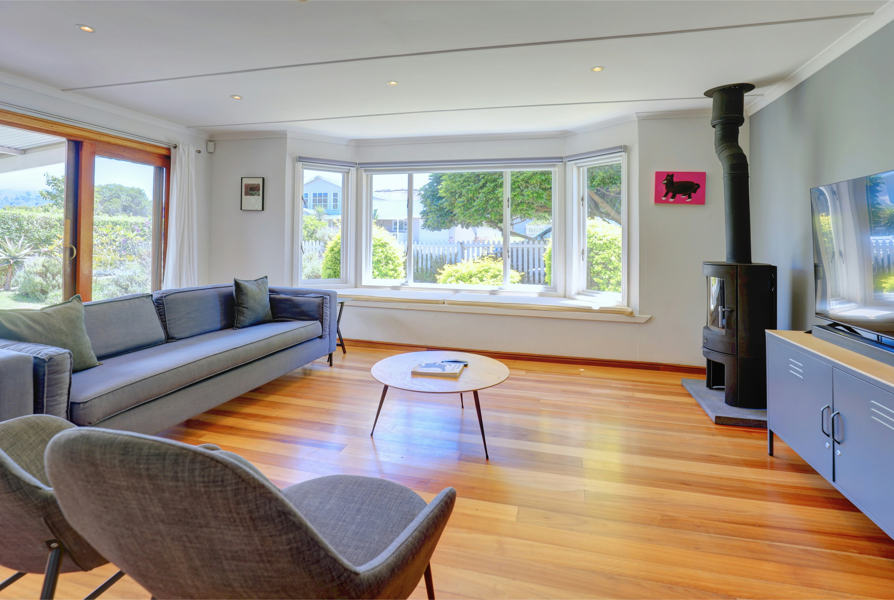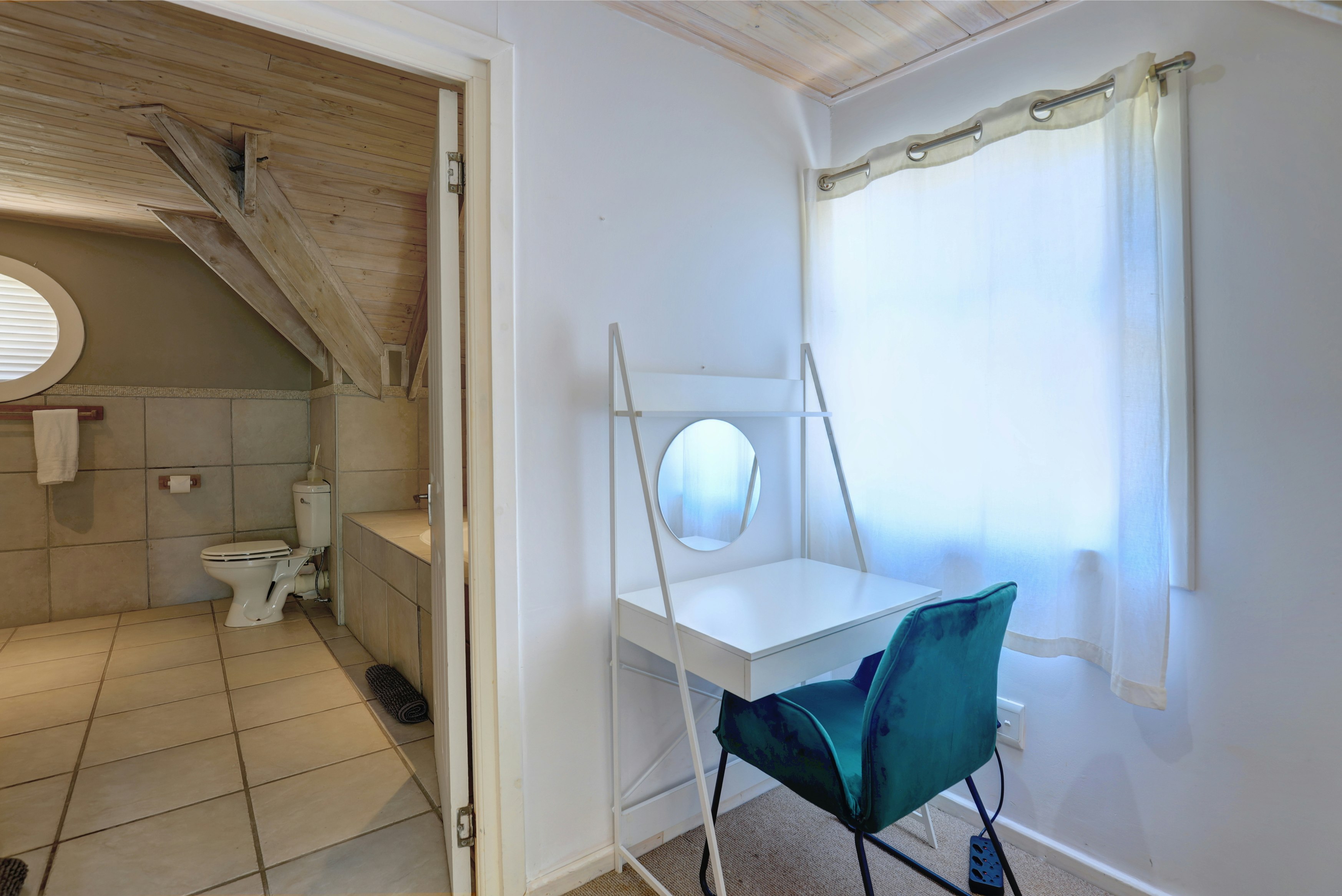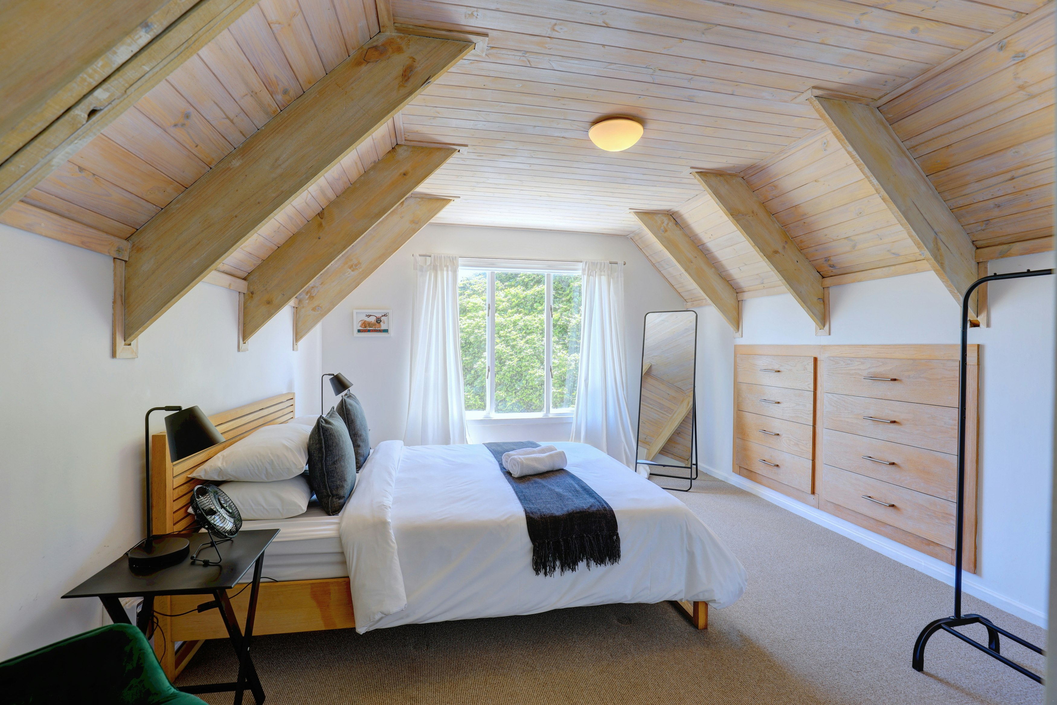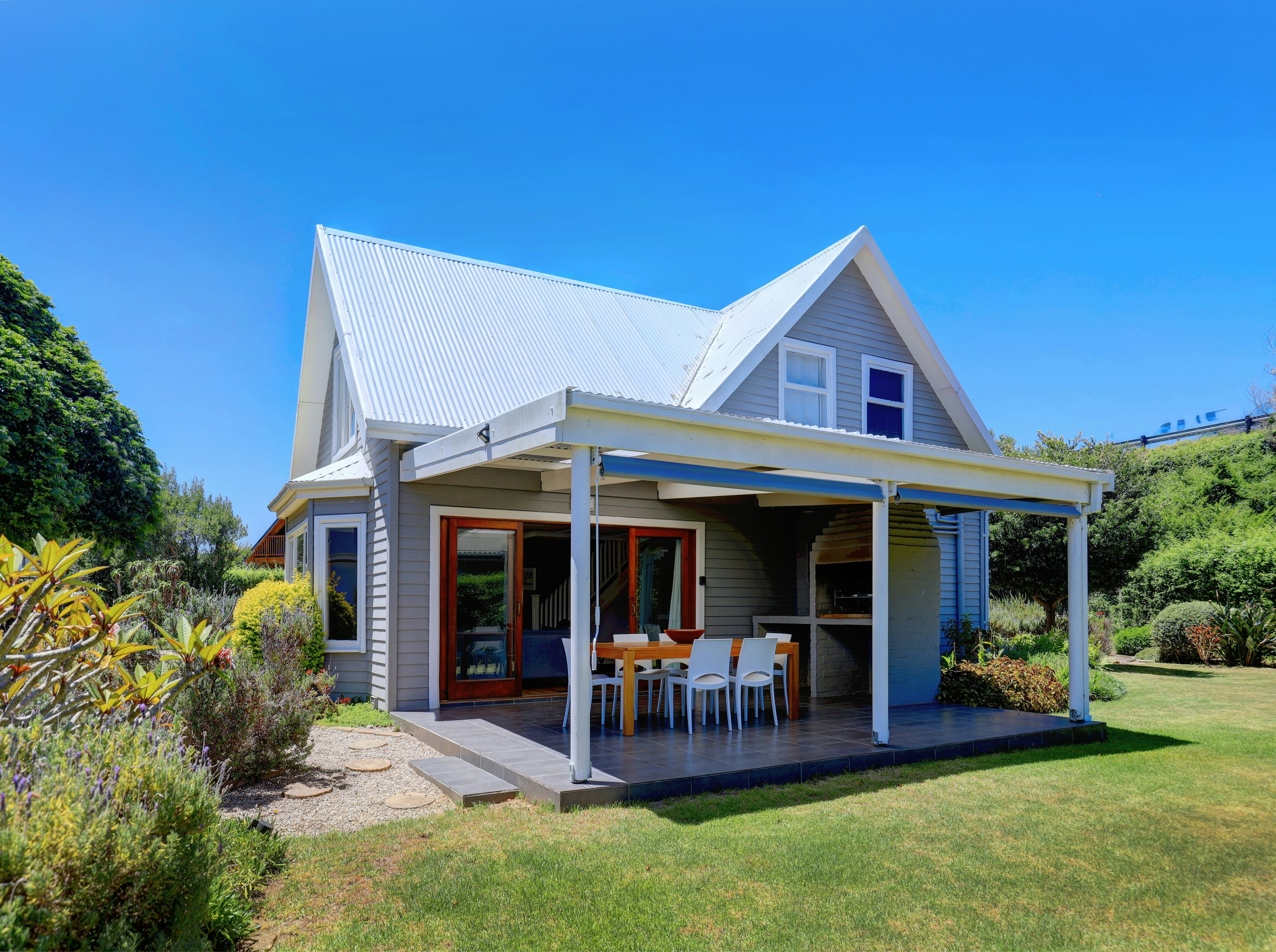 This double-storey property can accommodate up to 8 guests at a time and comprises 4 bedrooms and 3 bathrooms. Three of the bedrooms are located in the main house, while the remaining bedroom is in a separate cottage. The first bedroom is comfortably furnished with a queen-size bed and features an en-suite bathroom fitted with both a bath and a shower. The second bedroom also has a queen-size bed, while the third bedroom contains a double bed. These bedrooms share the second bathroom fitted with a shower. The fourth exterior bedroom has a double bed and includes an en-suite bathroom fitted with a shower. Linen and bath towels are provided.