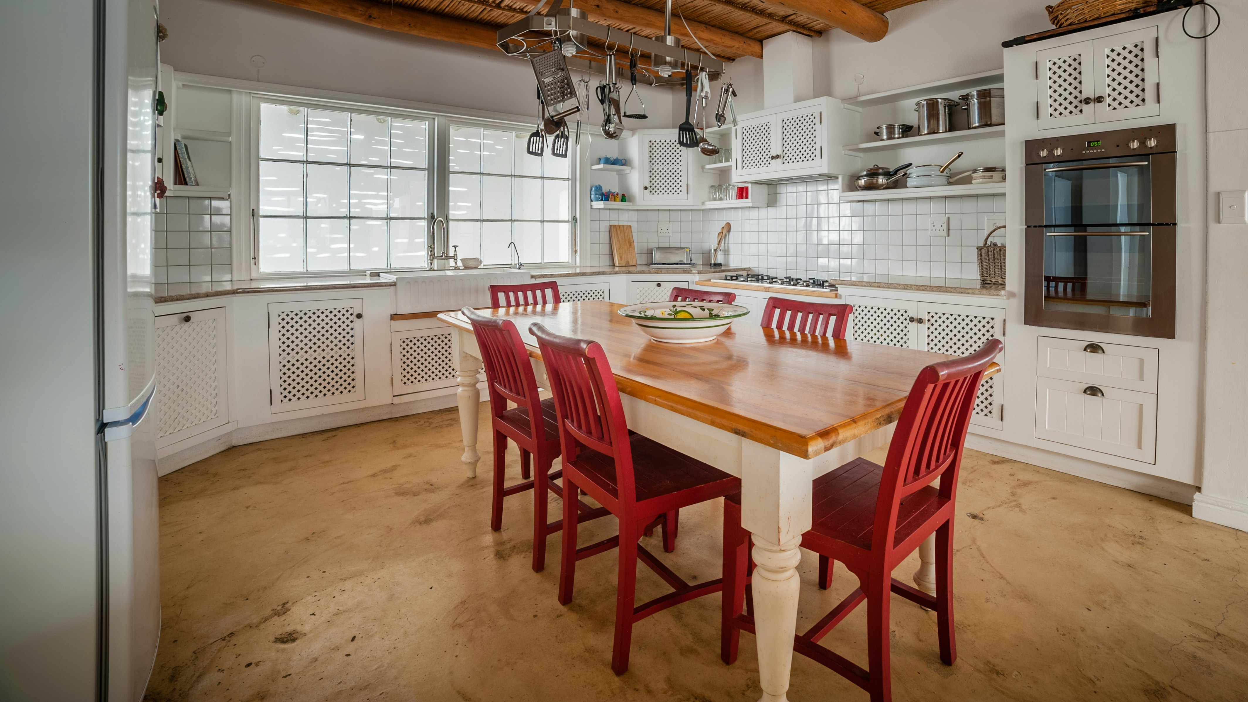 Die kombuis is volledig toegerus met 'n dubbeloond, 'n stoof, 'n yskas en 'n mikrogolfoond, en maaltye kan by die etenstafel geniet word. 'n Afsonderlike opwaskamer en waskamer is ook beskikbaar en is toegerus met 'n skottelgoedwasser, 'n tuimeldroër en 'n wasmasjien.
