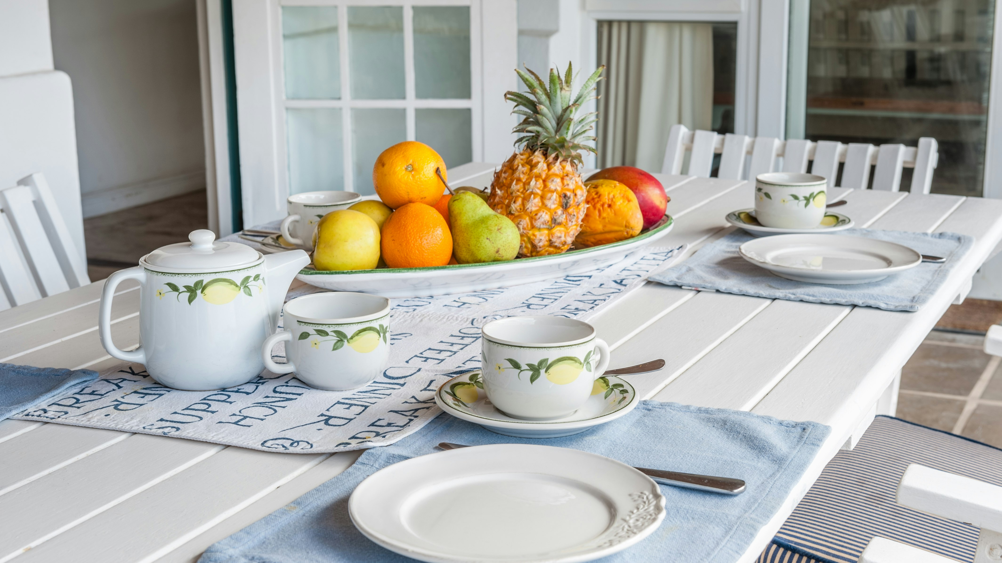 Die vakansiehuis bestaan uit 4 slaapkamers, 3 badkamers, 'n kombuis en eetarea, en 'n sitkamer wat oopmaak na die patio. Die hoofslaapkamer is bo geleë en is gemeubileer met 'n koningingrootte bed en 'n en suite-badkamer met 'n bad en 'n stort. 'n Balkon lei vanaf die hoofslaapkamer met direkte toegang tot die patio-area op die onderste verdieping. Die tweede slaapkamer het 'n dubbelbed en 'n en suite-badkamer met 'n stort, 'n wasbak en 'n toilet. Die derde slaapkamer is gemeubileer met 2 enkelbeddens en het 'n en suite-badkamer met 'n stort, 'n wasbak en 'n toilet. Die vierde slaapkamer het 2 enkelbeddens en 'n stapelbed vir 2 kinders. Vir gerief word linne en badhanddoeke voorsien.