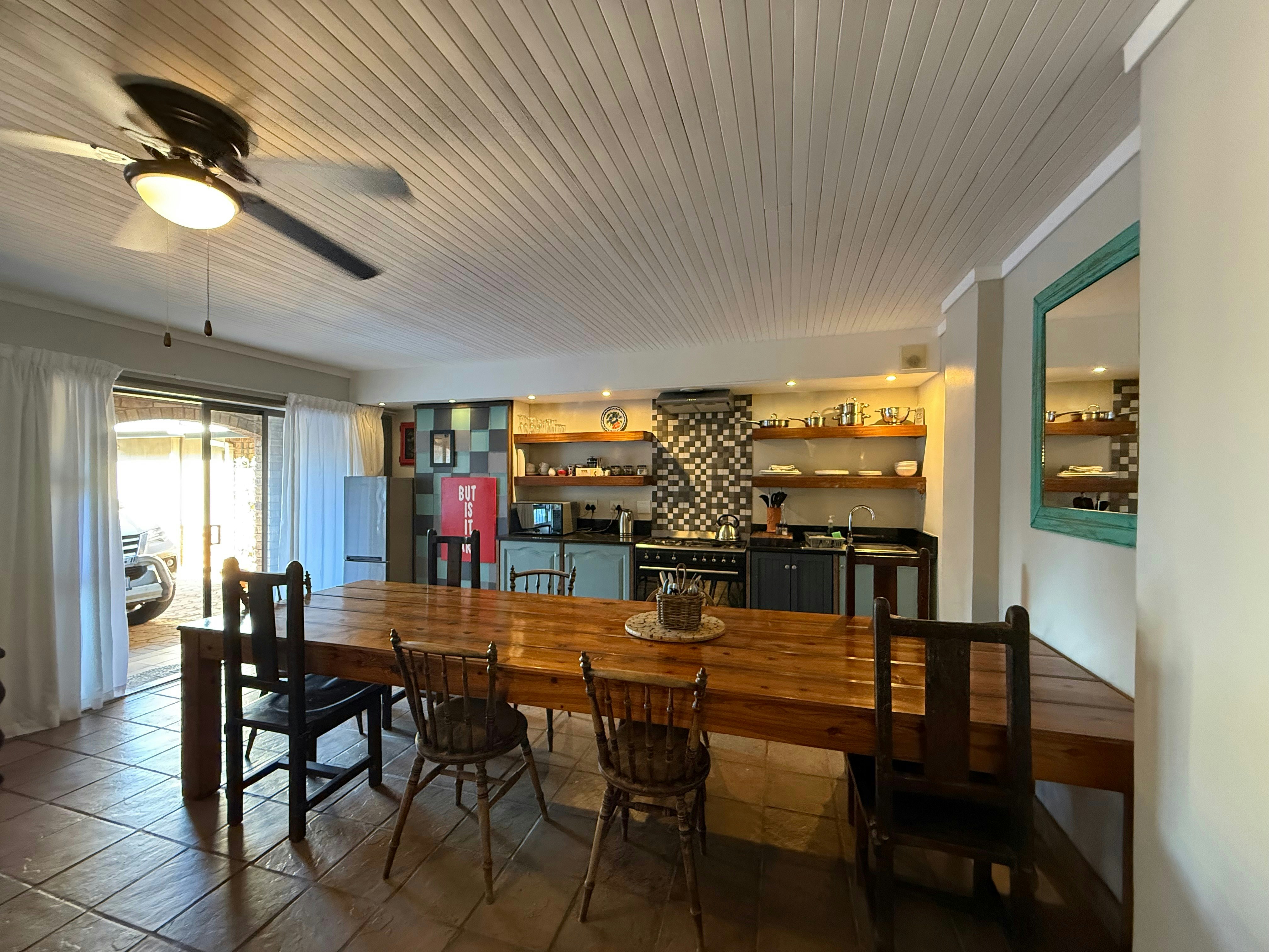 The open-plan living area is tastefully decorated in a modern eclectic style and includes a fully equipped kitchen with a Smeg gas stove and oven, microwave, fridge-freezer, tea and coffee-making facilities, cutlery, crockery, and utensils. The dining table can seat 9 guests and flows into the living room, which is furnished with comfortable seating, a TV, Wi-Fi, and selected streaming services.