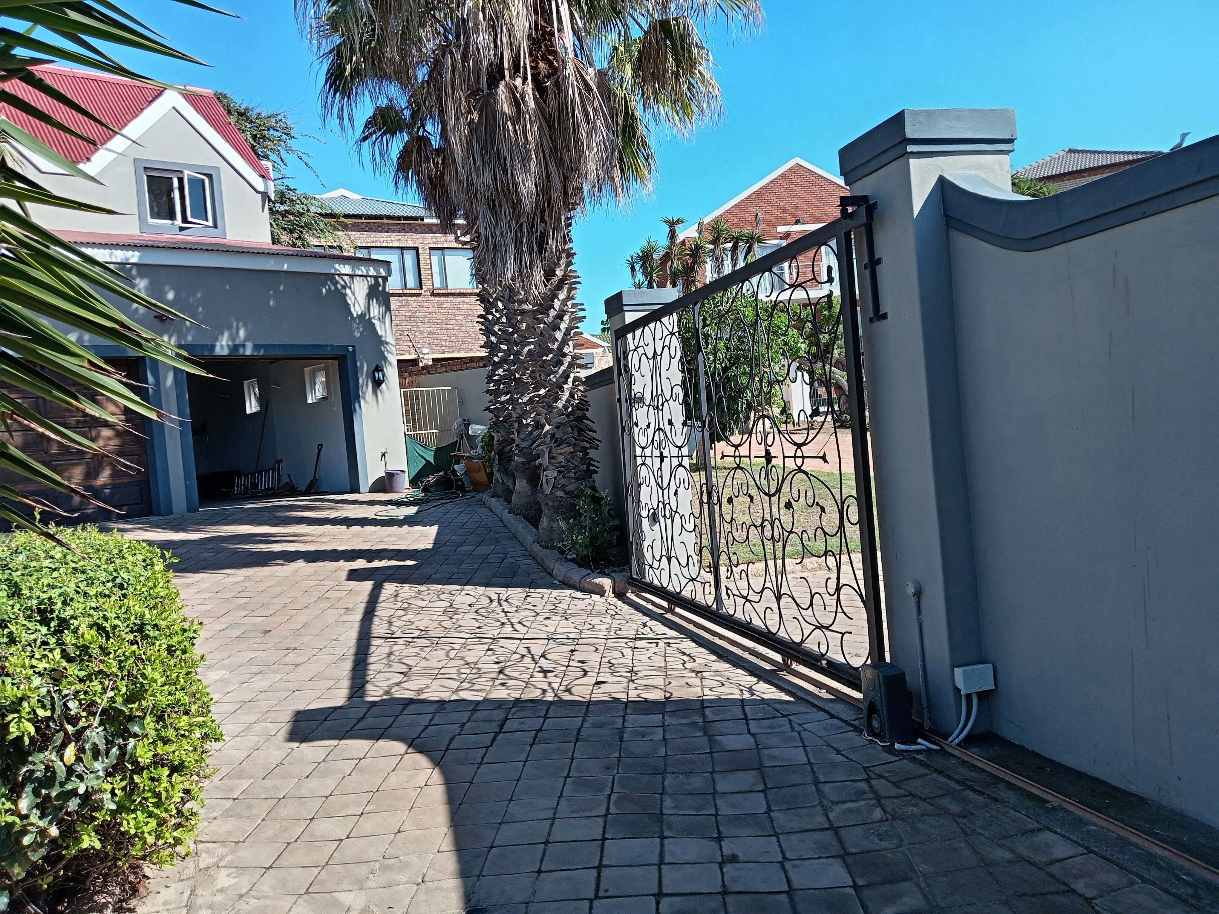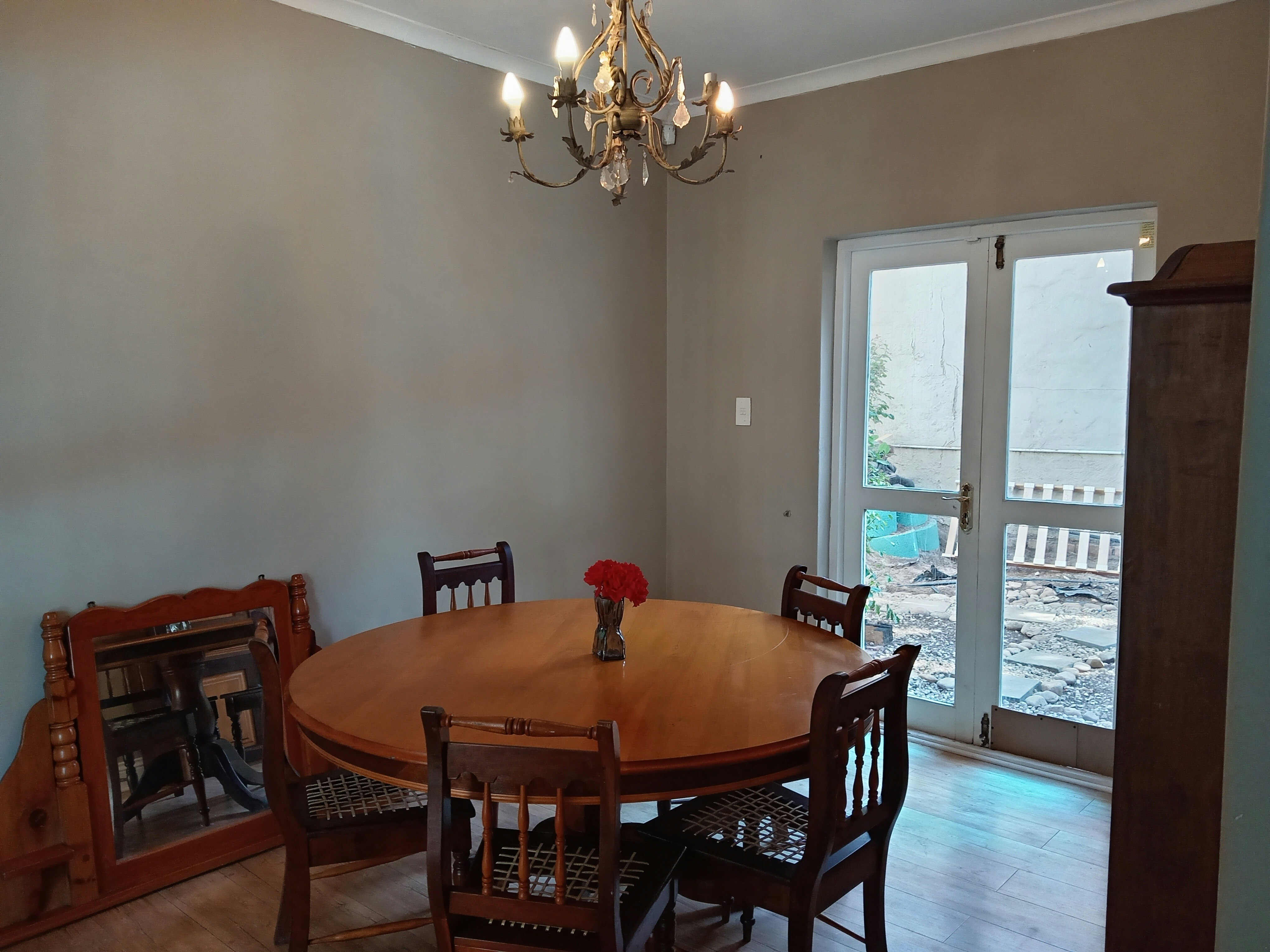 The living area opens onto an enclosed patio with a built-in braai and seating. Guests can also enjoy a swimming pool and are afforded secure and covered driveway parking.