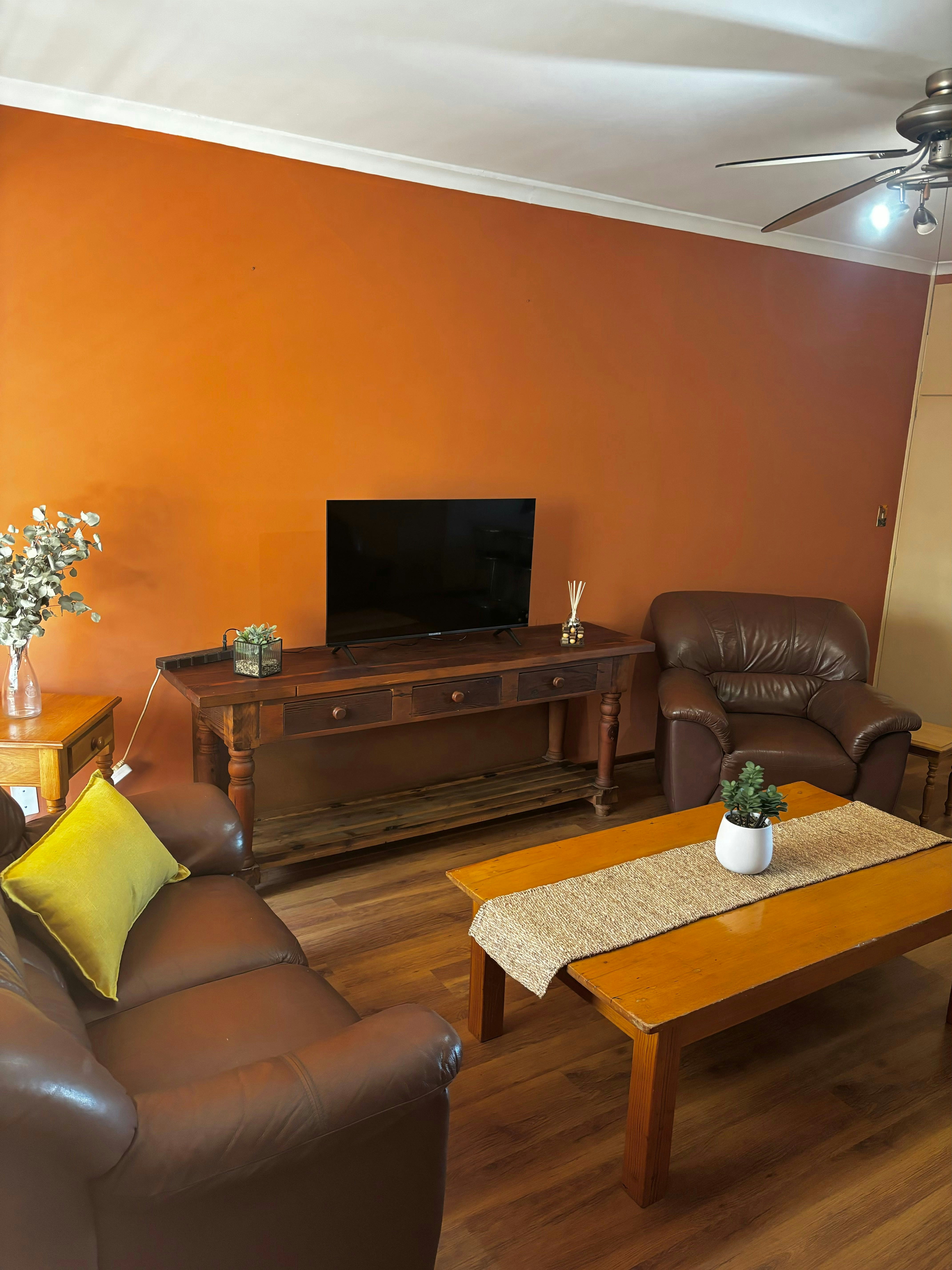 Die huis bied slaapplek aan 6 gast en beskik oor 3 slaapkamers op die boonste verdieping, 2 badkamers en 'n gedeelde toilet. Die hoofslaapkamer het 'n koningingrootte-bed en 'n en suite-badkamer met 'n stort. Die tweede slaapkamer het 'n dubbelbed en daar is 2 enkelbeddens in die derde slaapkamer. Gaste in hierdie kamers deel 'n badkamer met 'n bad, toilet en 'n wasbak.