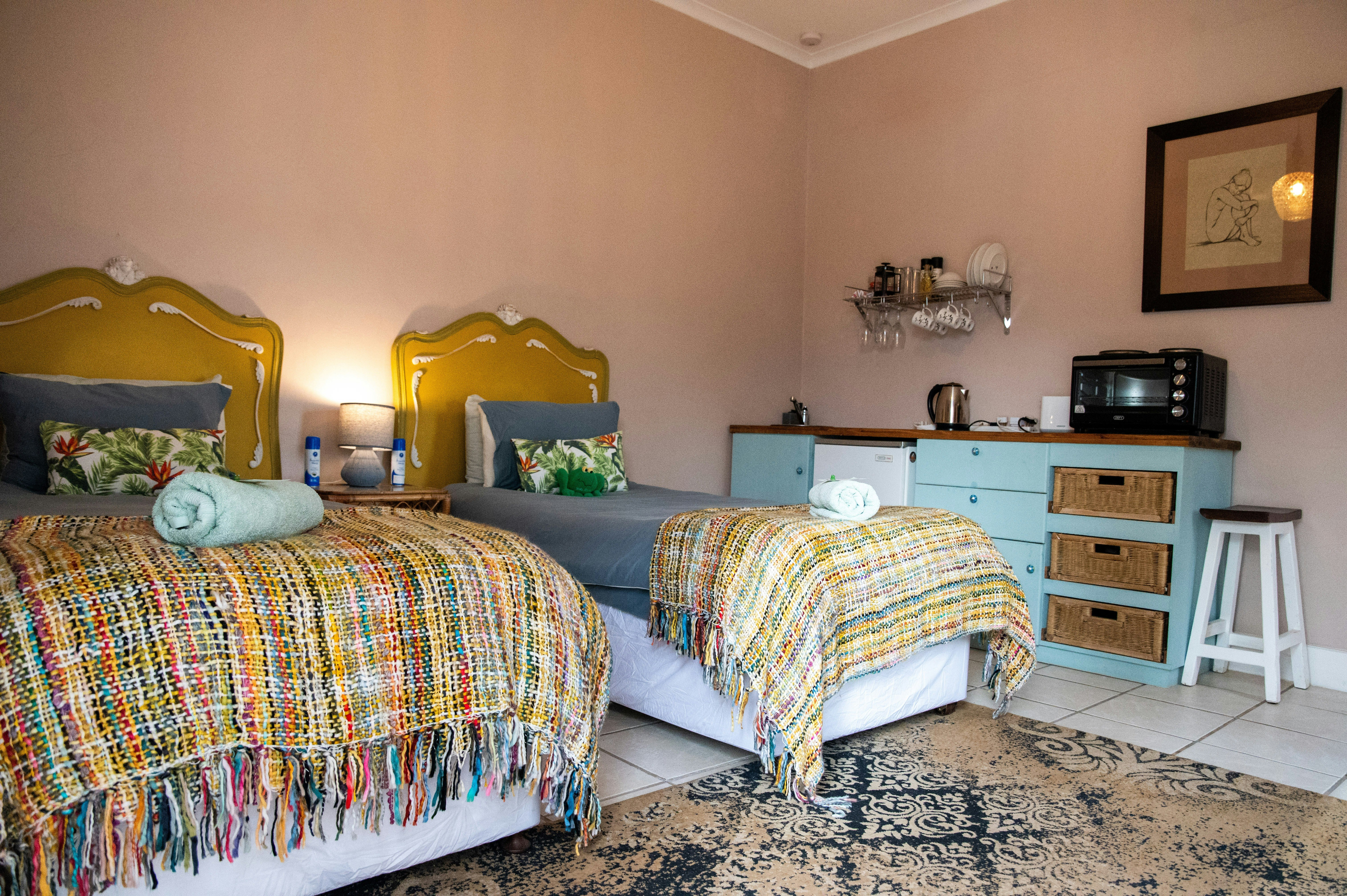 Die gastehuis bied verblyf vir tot 23 gaste in 'n verskeidenheid eenhede. Daar is 7 en suite-slaapkamers en 1 gesinskamer wat slaapplek bied vir 4 gaste, sowel as 2 bykomende en suite-kamers beskikbaar teen 'n ekstra koste. Elke kamer is gemeubileer met luukse beddens met matrasbedekkings en het 'n privaat ingang via die tuin. En suite-badkamers is toegerus met storte of stort-oor-baddens, en elke kamer sluit tee- en koffiemaakgeriewe in. Elektriese komberse, badhanddoeke, swembadhanddoeke, kamerjassen en premium toiletware word voorsien.