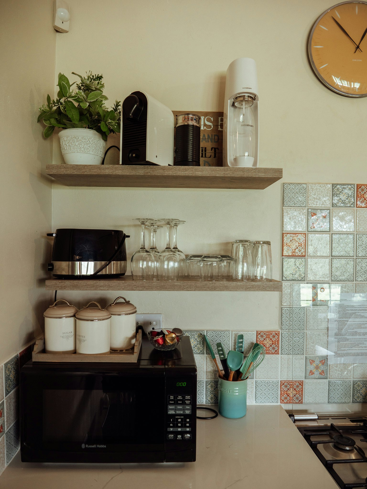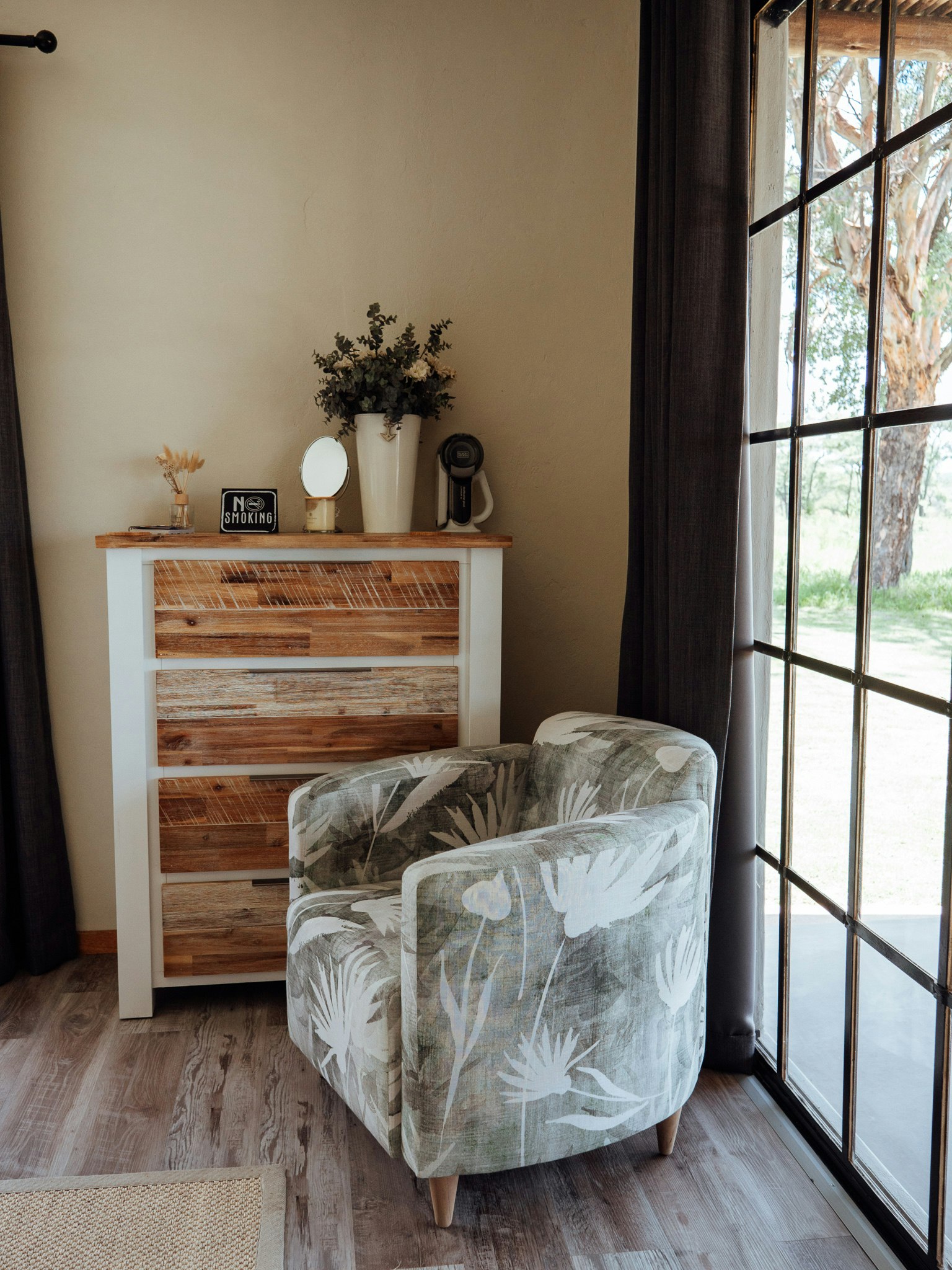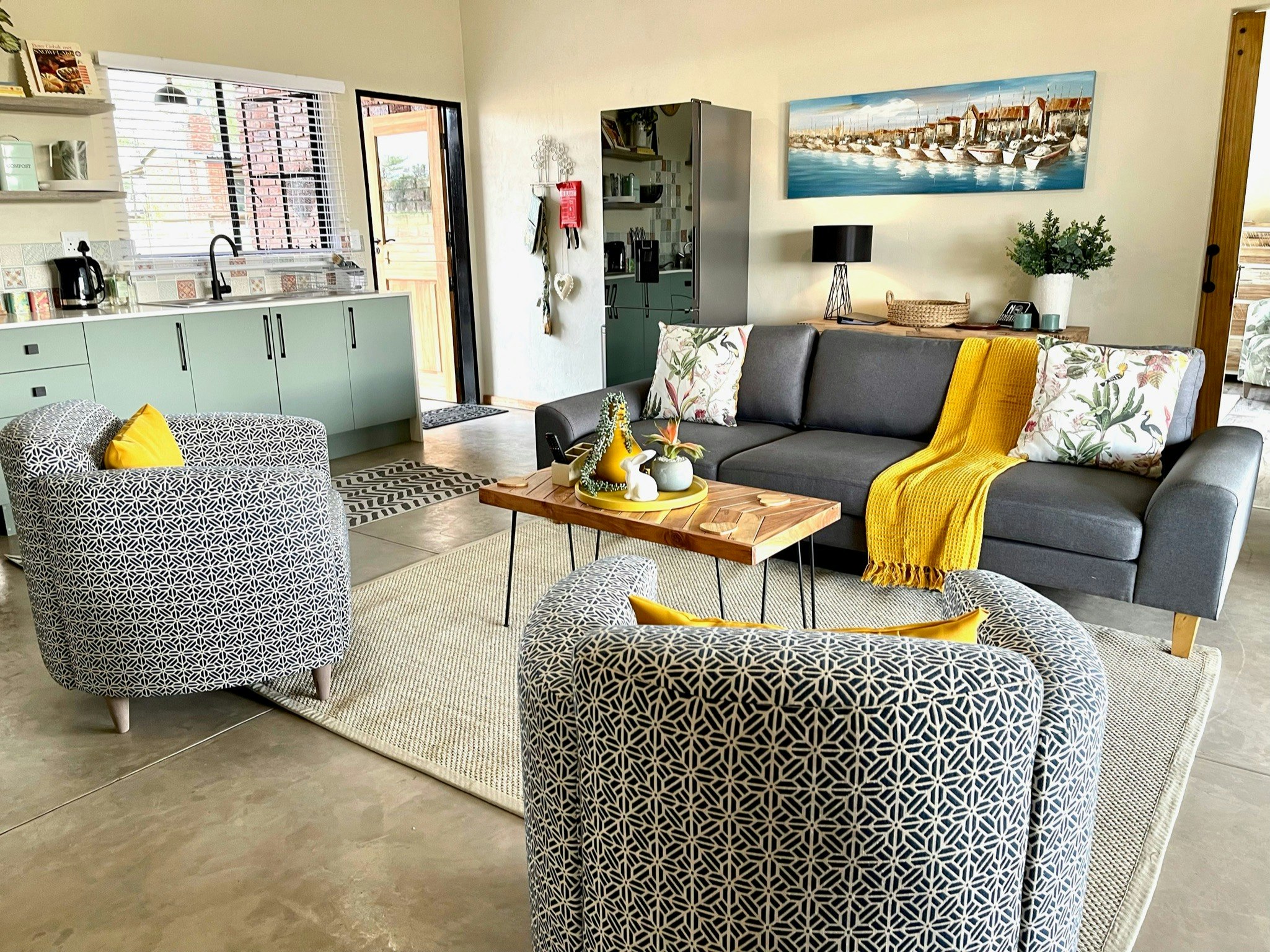 Elke kothuis beskik oor 'n volledig toegeruste kombuis met 'n yskas, stoof en mikrogolfoond. Sommige eenhede is verder toegerus met ekstras soos 'n filterkoffiemasjien of 'n lugbraaier. Die kothuise sluit ook 'n gemaklike leefarea met lugversorging en 'n privaat patio met braaigeriewe in, waar gaste die rustige bosveld-omgewing kan geniet.