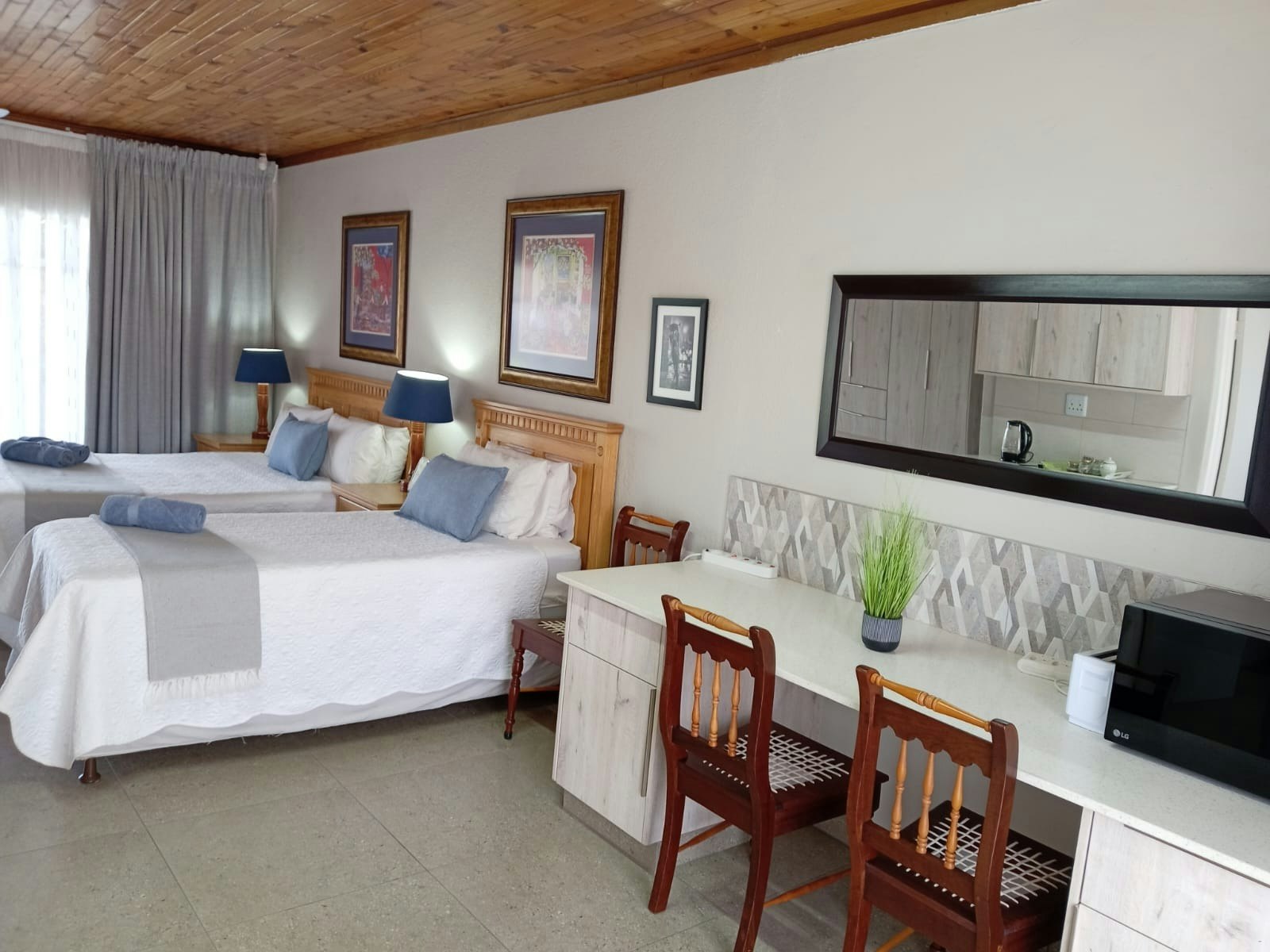 Kamergeriewe sluit in 'n mikrogolfoond, ketel, lugbraaier, plafonwaaier, yskas-vrieskas, koffie- en teemaakgeriewe, eetgerei, breekware en 'n TV met die volle DStv-pakket met Netflix en YouTube. 'n Omgekeerde osmose-waterstelsel is in die kamer geïnstalleer. Die ateljee se alarm kan geaktiveer word wanneer jy nie daar is nie.