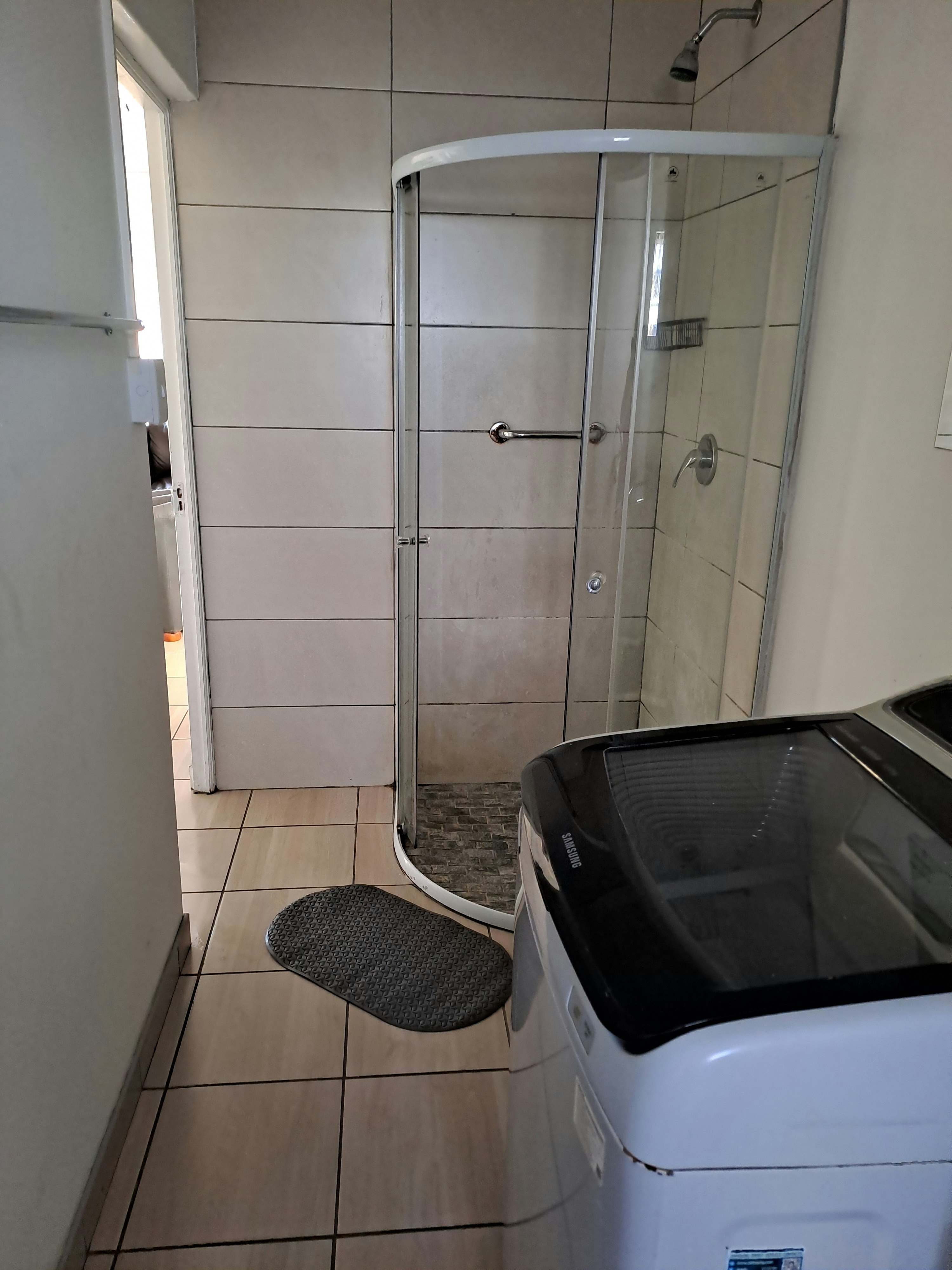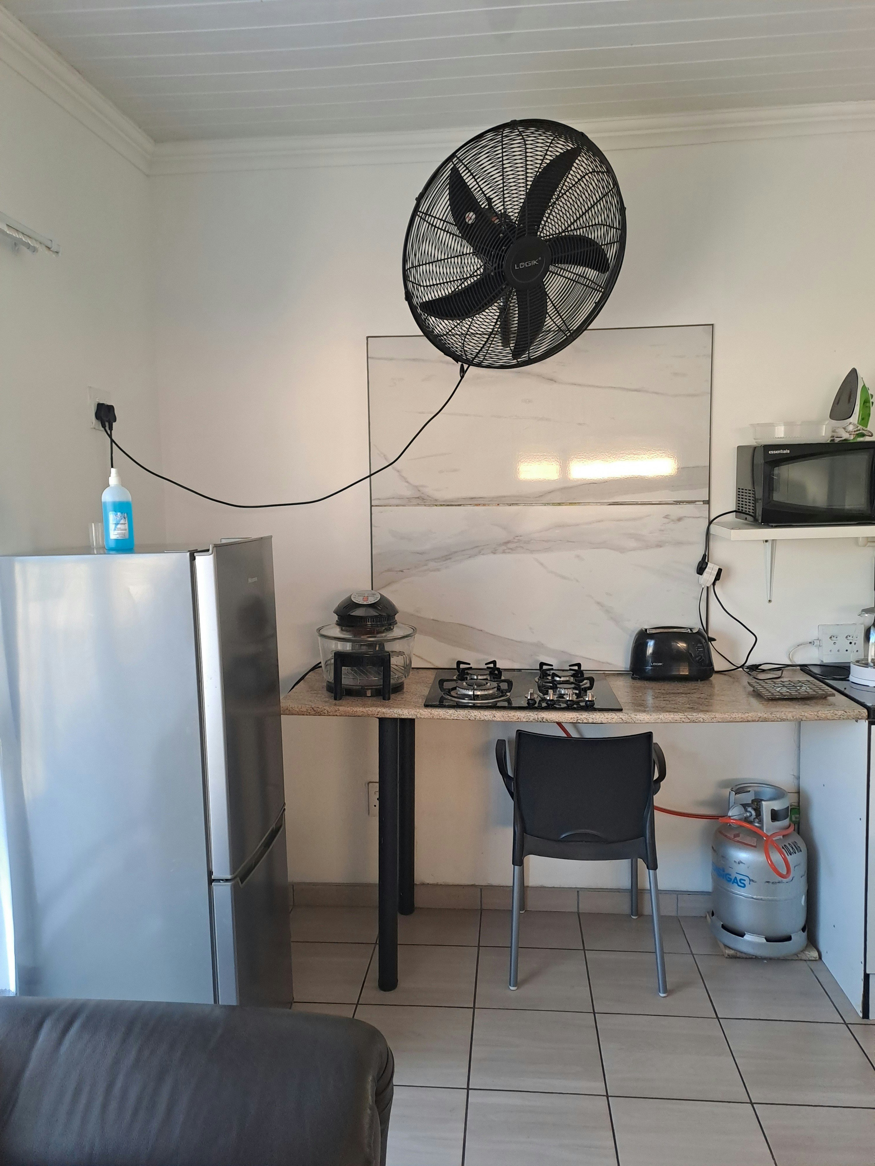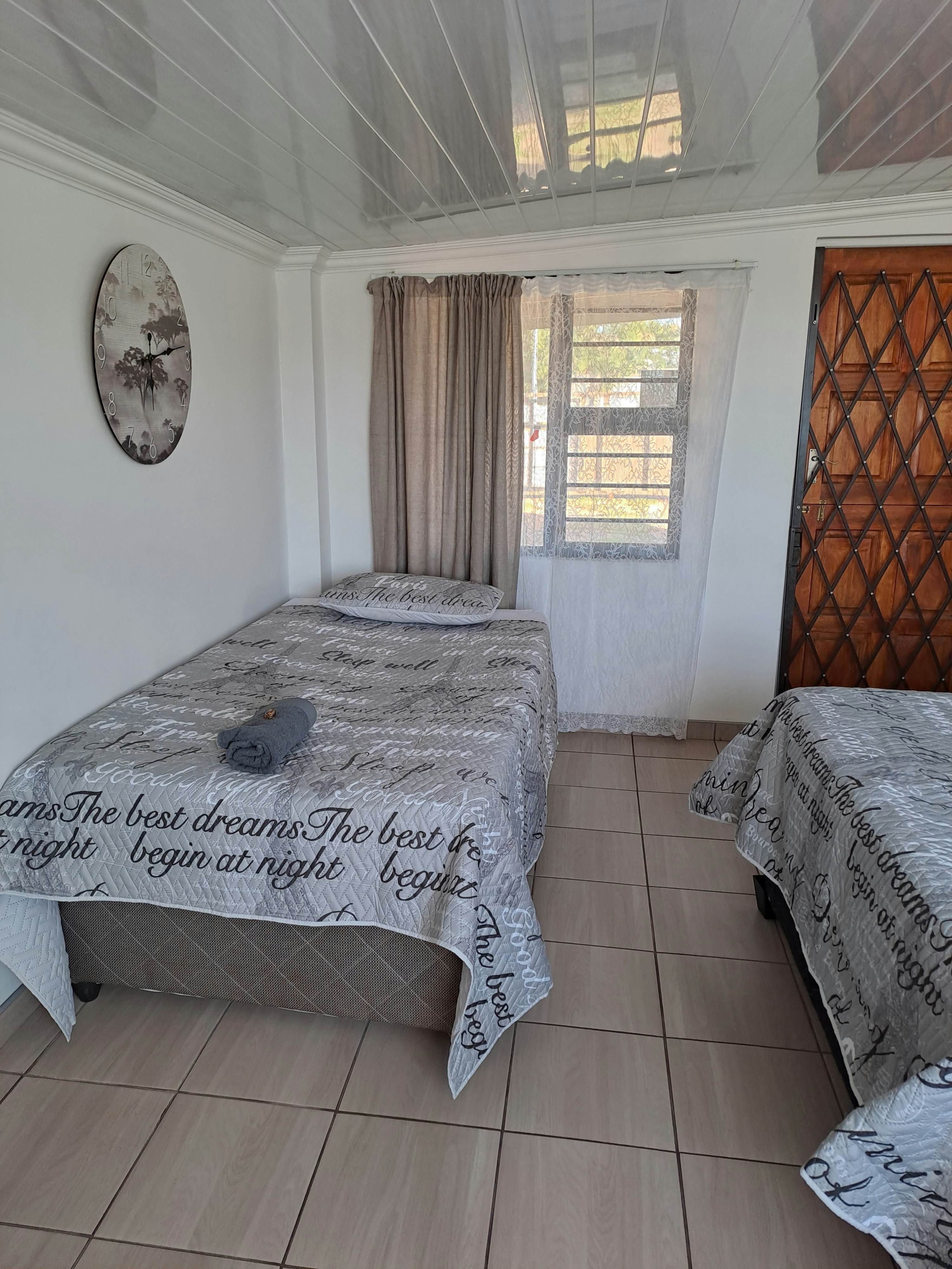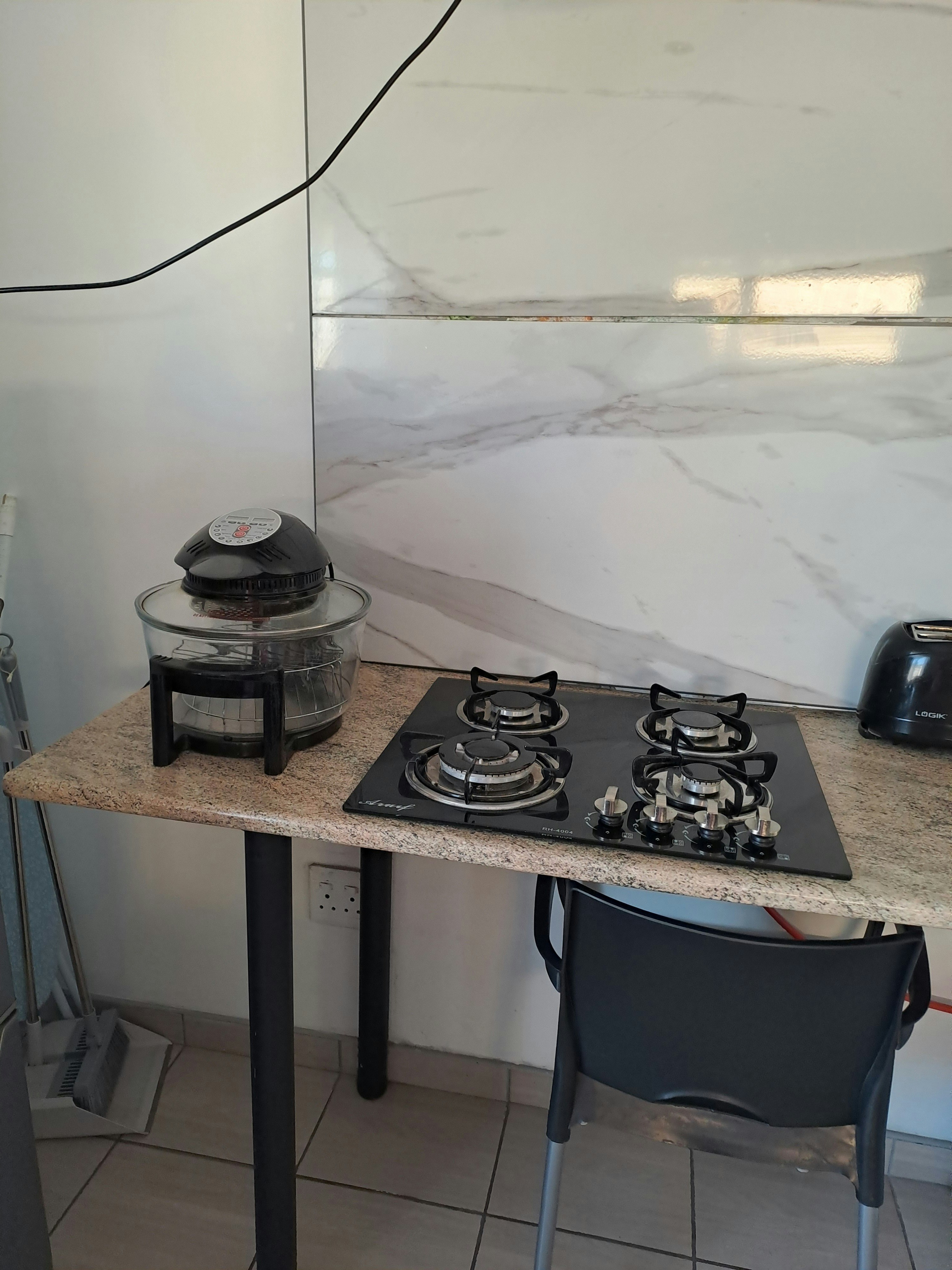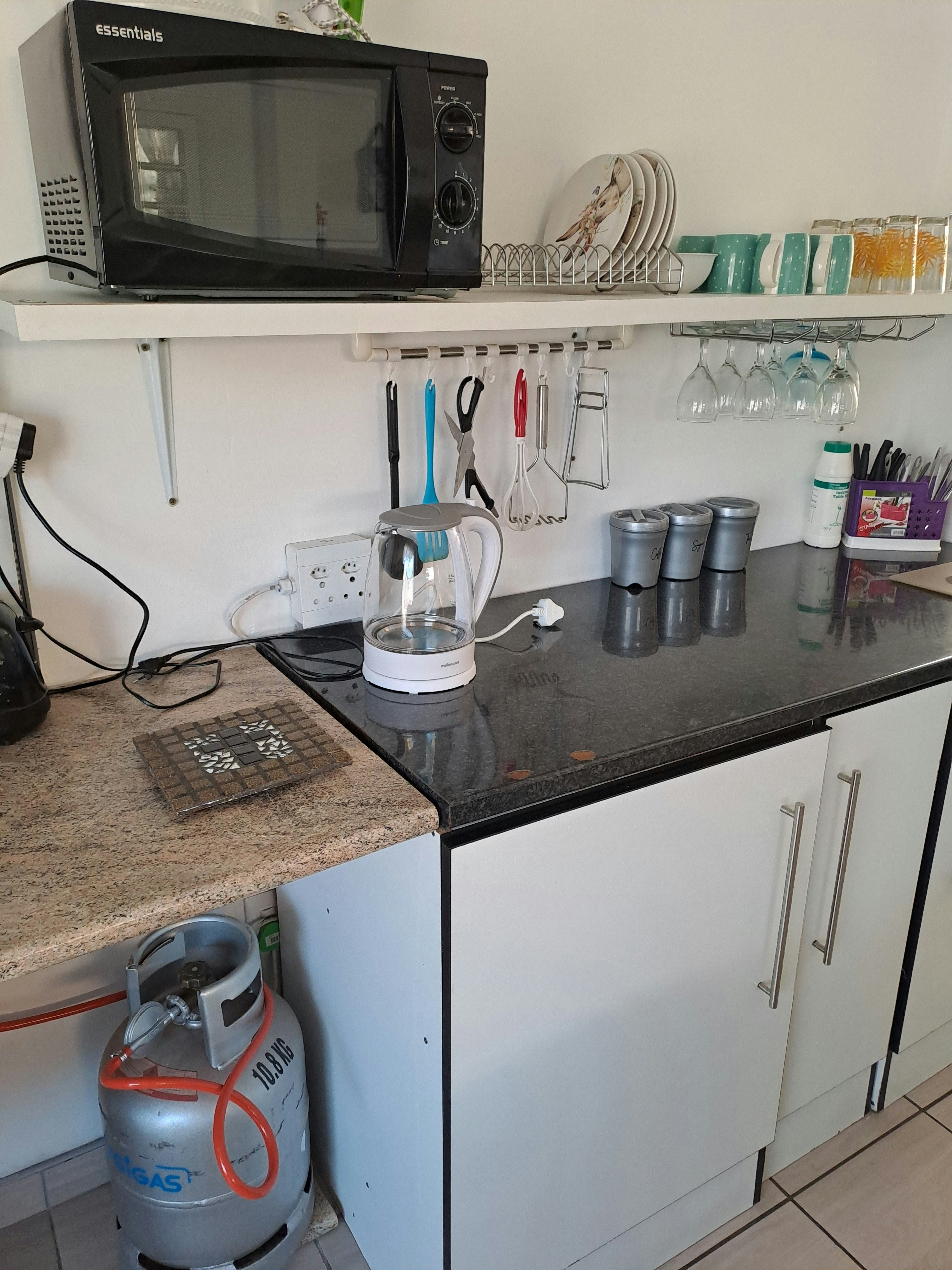 The kitchen is well equipped for self-catering and contains a 4-plate gas hob and air fryer, fridge-freezer, microwave, and cutlery and crockery. The dining area has seating space for 4 people, while the lounge has a comfy lounge suite and a wall-mounted flat-screen TV with selected DStv channels. Free Wi-Fi access is also provided.