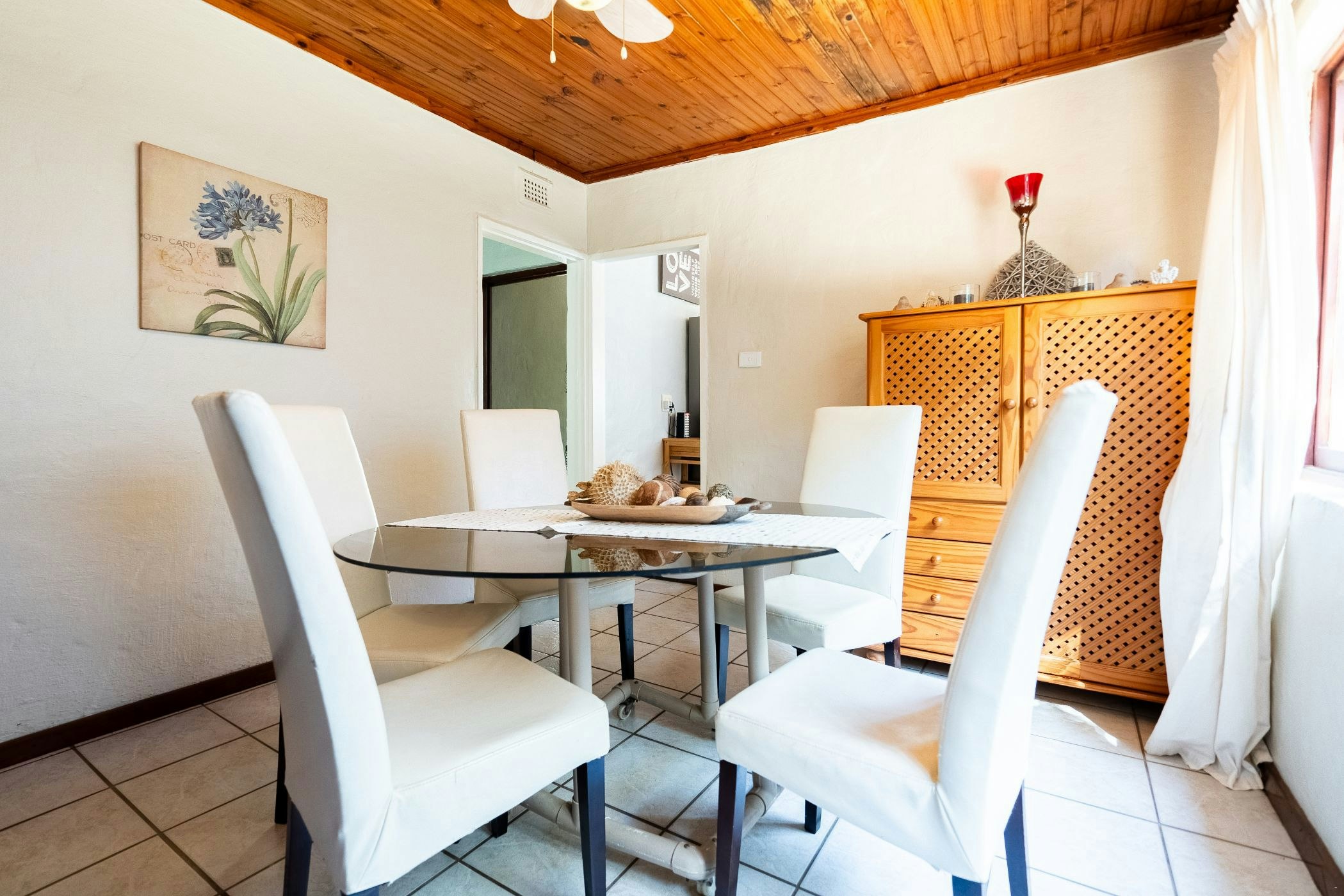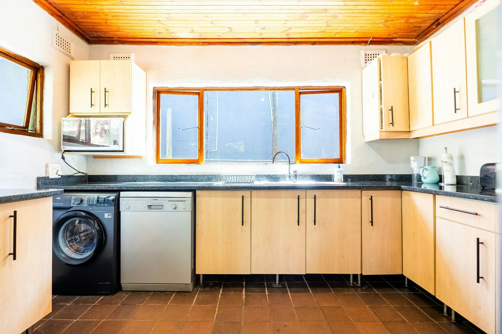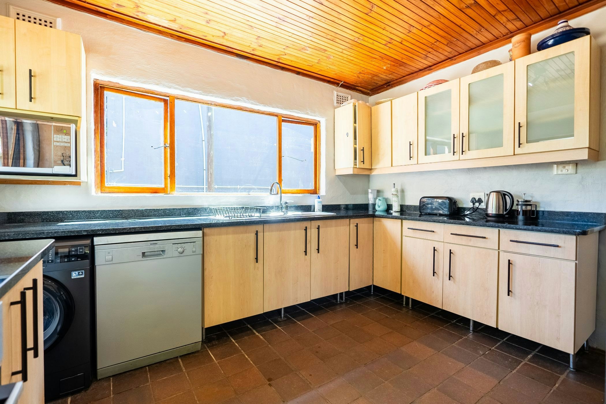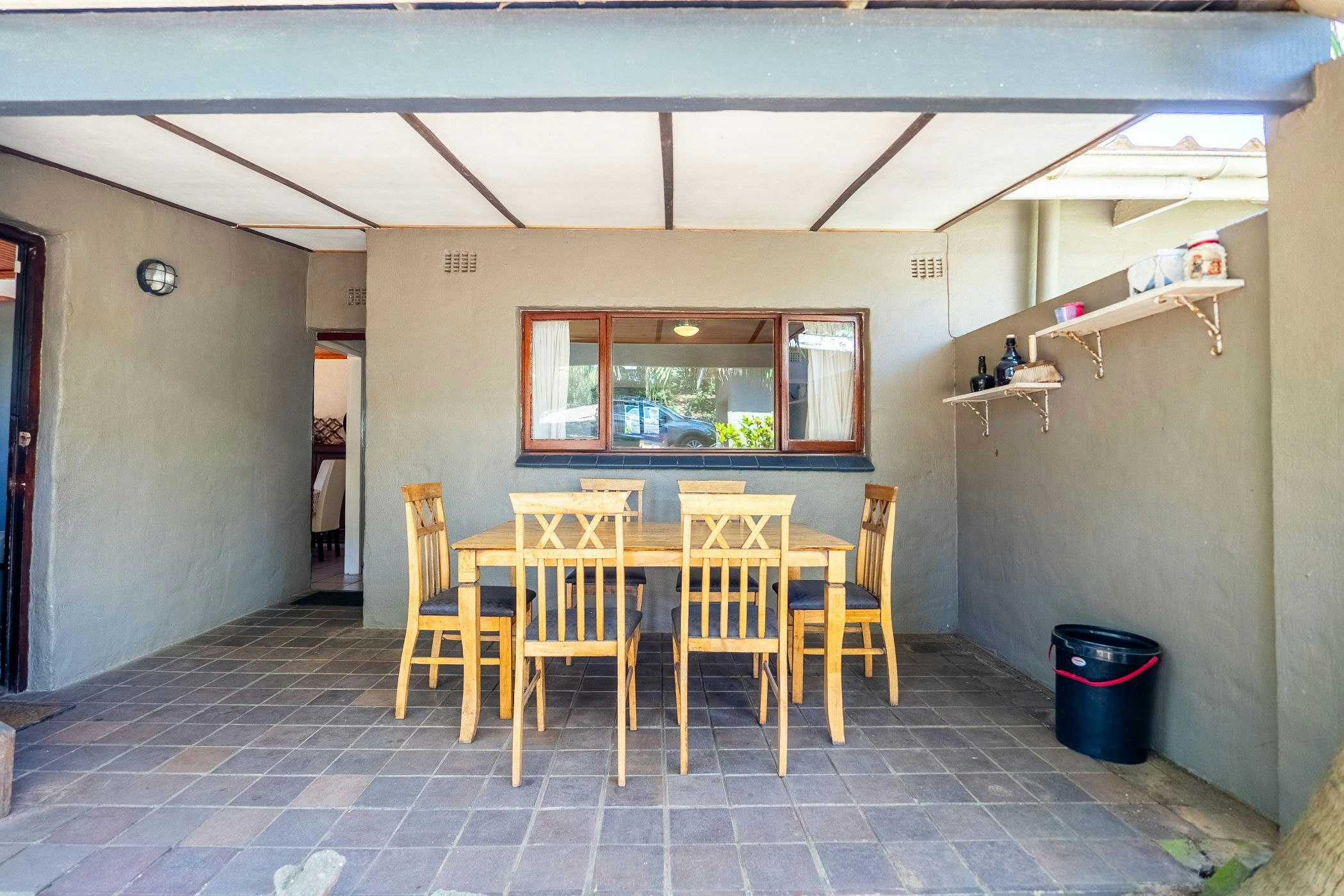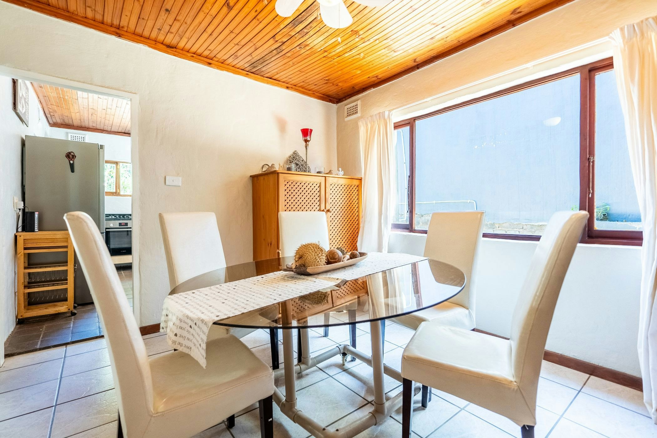 The kitchen is well-equipped for self-catering with a fridge, dishwasher, washing machine, a gas stove and oven, and a microwave. The dining room contains a round 6-seater dining table and chairs. The lounge contains a flat-screen 50-inch smart TV with uncapped WiFi and Netflix and opens to a covered patio with outdoor dining furniture, a braai area, and sea views. The patio leads to a garden with a lovely thatched gazebo that overlooks the sea.
