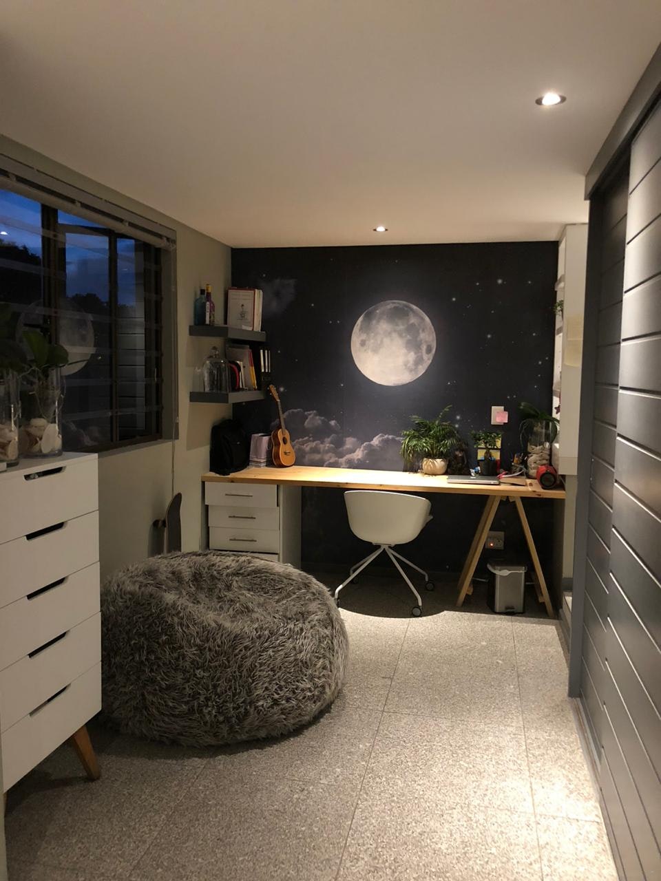 The open-plan fully equipped kitchen contains the necessary appliances to prepare and cook meals, including a centre island with a breakfast bar area with bar stools. The adjacent living area offers a workstation, a dining area with seating, sofas to relax on and a TV for media entertainment.