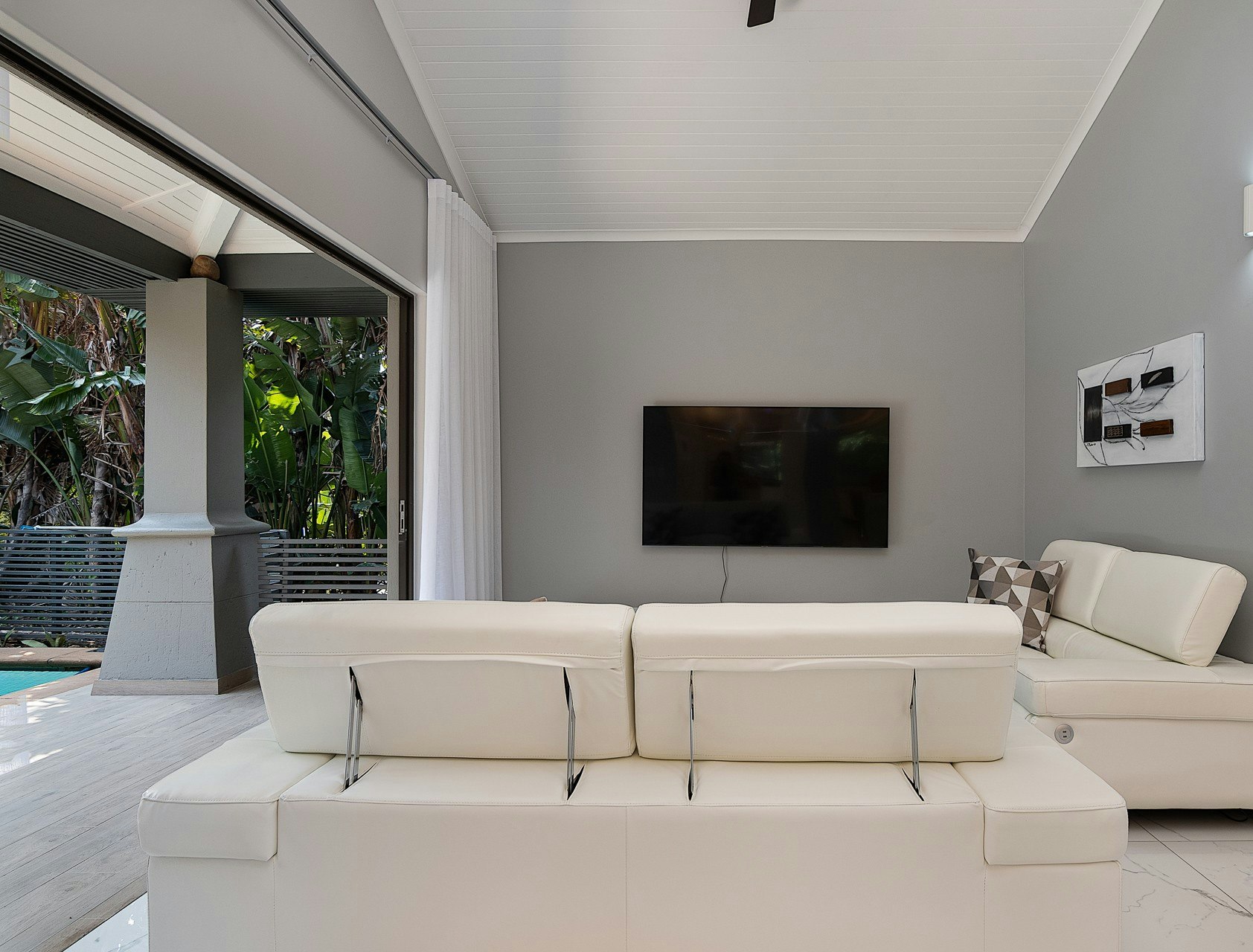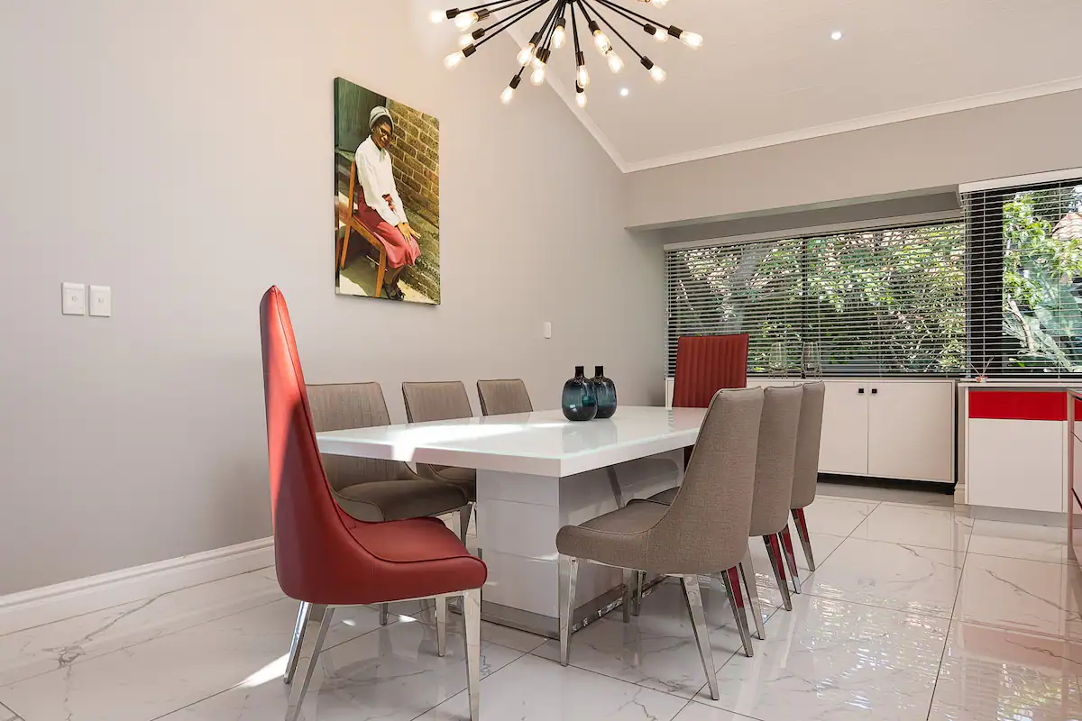 The expansive living area features a stylish kitchen fully equipped with a gas stove, electric oven, air fryer, microwave, fridge-freezer, cutlery and crockery. Leading from the kitchen is an 8-seater dining table where guests can enjoy their meals together. Adjacent to the kitchen is a TV room which opens onto a lovely patio with a sparkling swimming pool. Access to free Wi-Fi is available throughout the villa.