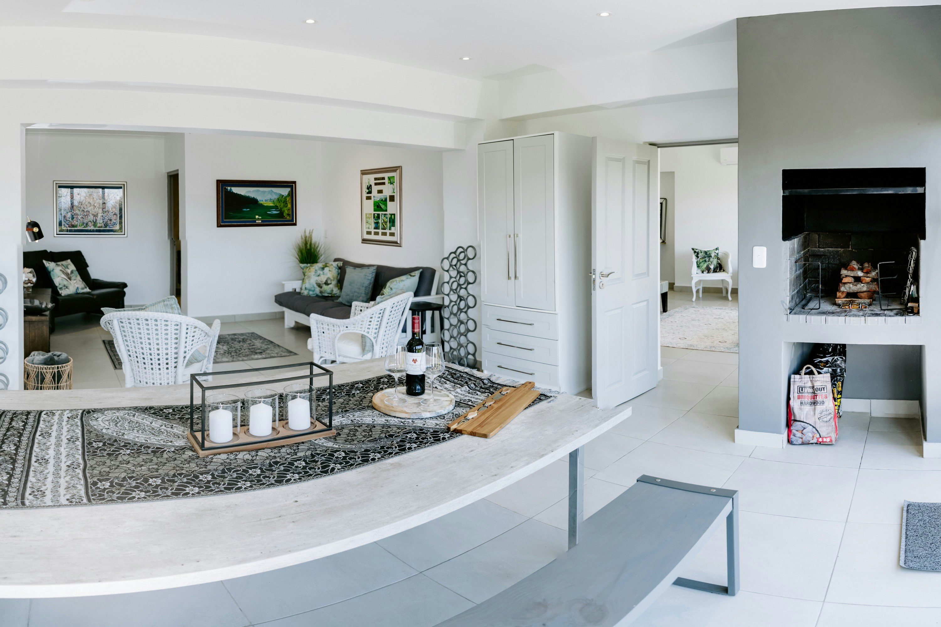 Guests have access to a comfortable indoor braai area and a separate lounge with a double sleeper sofa and a smart TV. The kitchen is equipped with a fridge-freezer, induction hob, convection oven, dishwasher, microwave, cutlery and crockery, as well as tea- and coffee-making facilities.