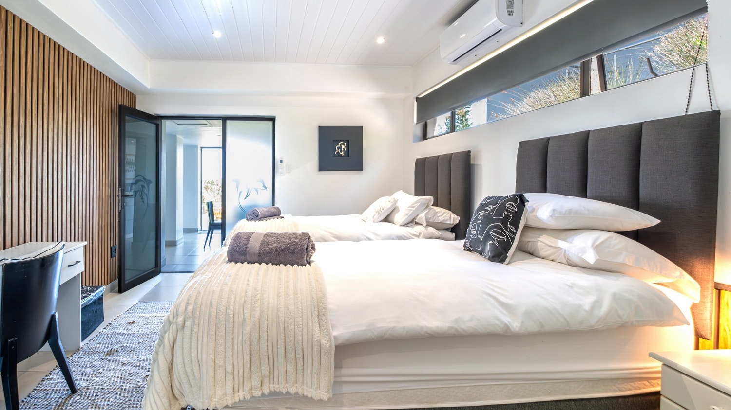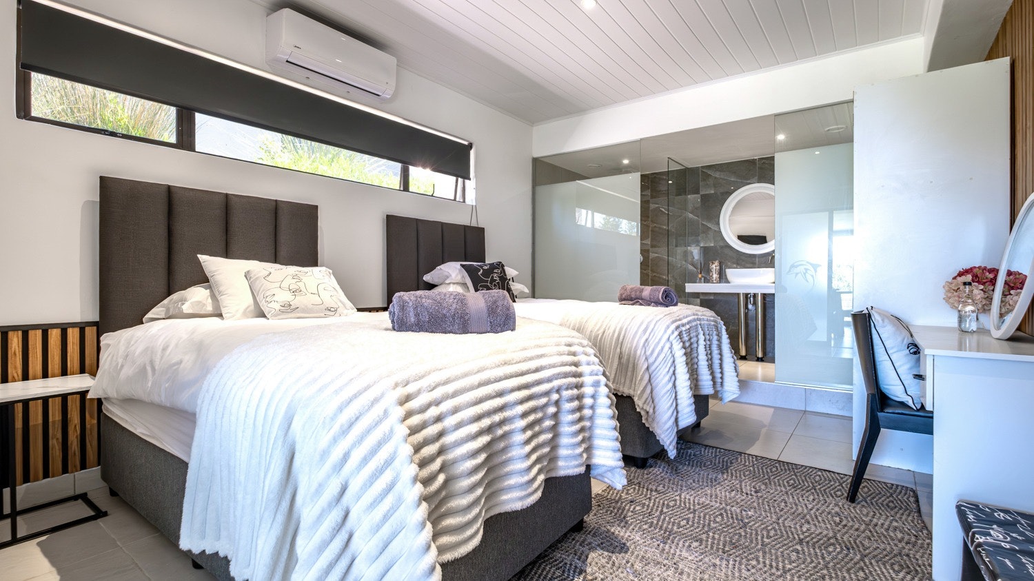 Die woonstel is op die onderste vlak van die huis geleë en beskik oor 2 slaapkamers, 2 badkamers, 'n kombuis en 'n leefarea. Die hoofslaapkamer is gemeubileer met twee enkelbeddens en het 'n en suite-badkamer met 'n stort, toilet en wasbak. Die tweede slaapkamer het 'n koninggrootte-bed met 'n en suite-badkamer. Die eenheid het lugversorging en bied gratis WiFi.