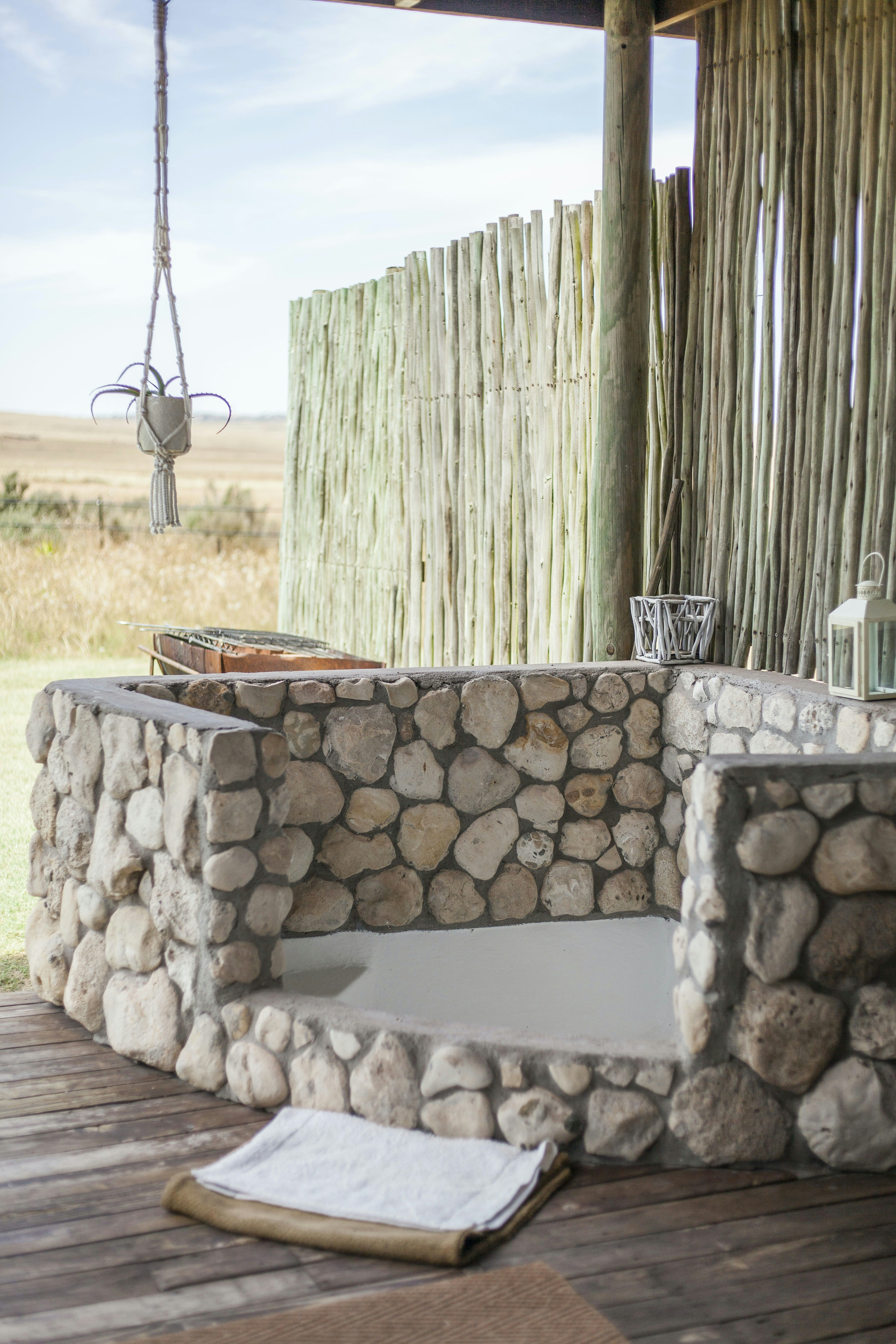 The scullery for washing dishes is located outside on the undercover deck overlooking the farmlands. The cottage also features a splash pool, a Weber braai, and seating. Guests also have access to the main communal swimming pool.