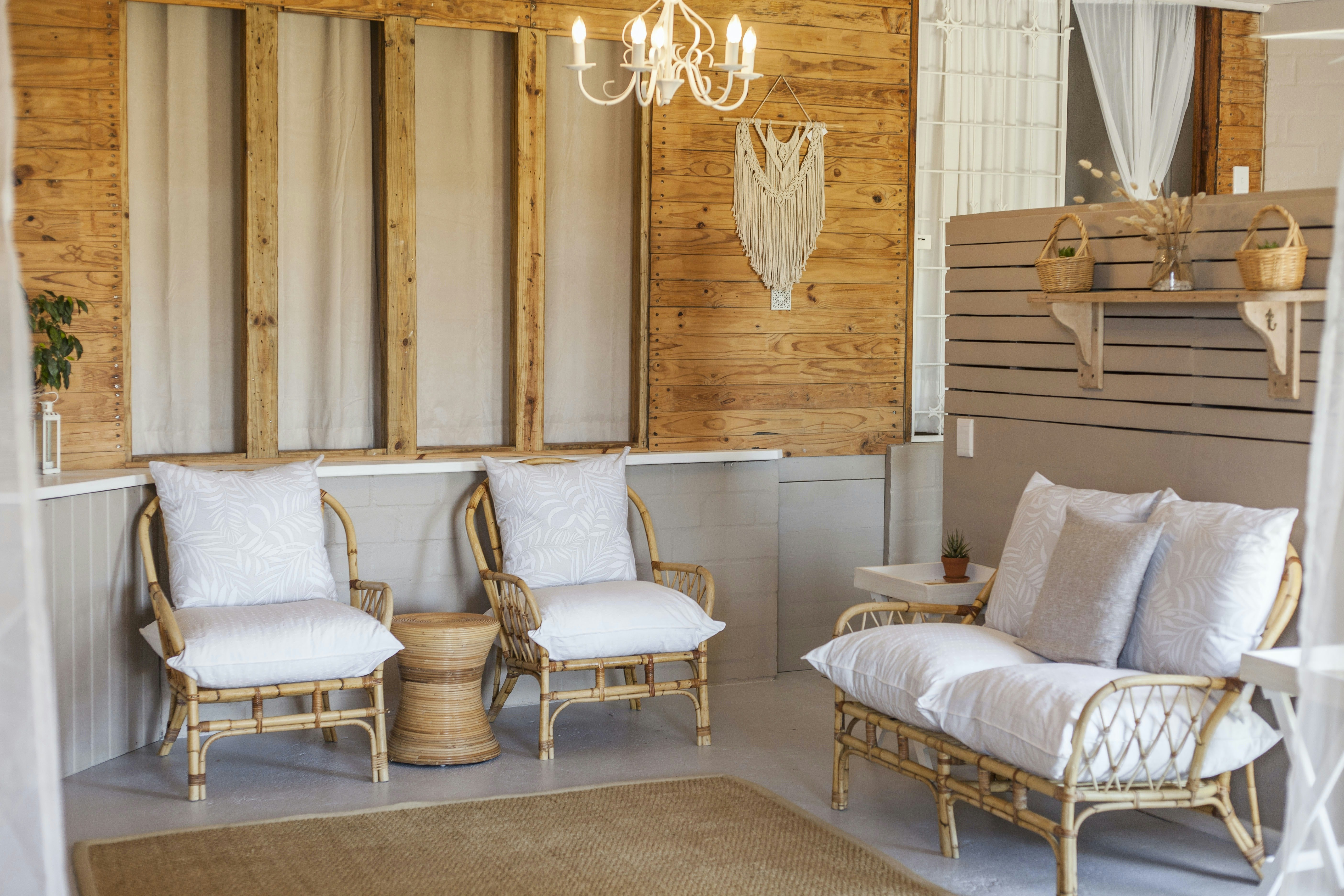 The kitchenette is equipped with a fridge-freezer, a microwave, a 2-plate gas stove, cutlery, and crockery. The living area features a dining table and comfortable seating. Load-shedding light bulbs and solar light jars are provided.