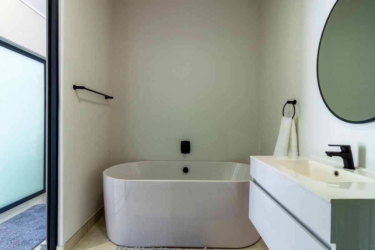Elke slaapkamer het 'n dubbelbed en 'n en suite-badkamer. Twee badkamers het 'n stort, toilet en wasbak en die derde badkamer het 'n bad.
