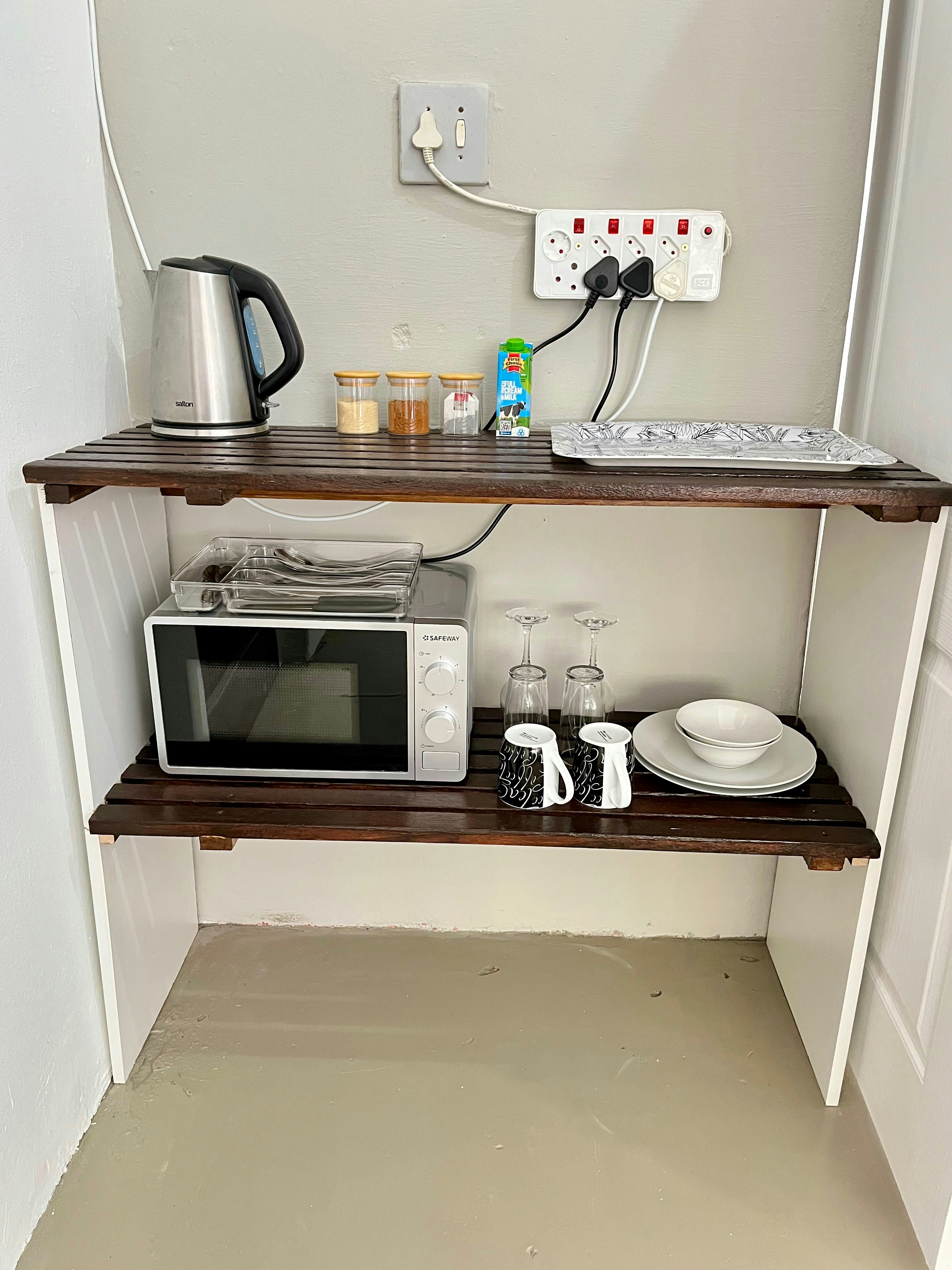 Die knus binnekant sluit 'n TV vir vermaak in en 'n kompakte kombuisie toegerus met 'n yskassie, mikrogolfoond en koffie- en teemaakgeriewe, perfek vir ligte selfsorgbehoeftes. Veilige parkering op die perseel word voorsien vir gemoedsrus.
