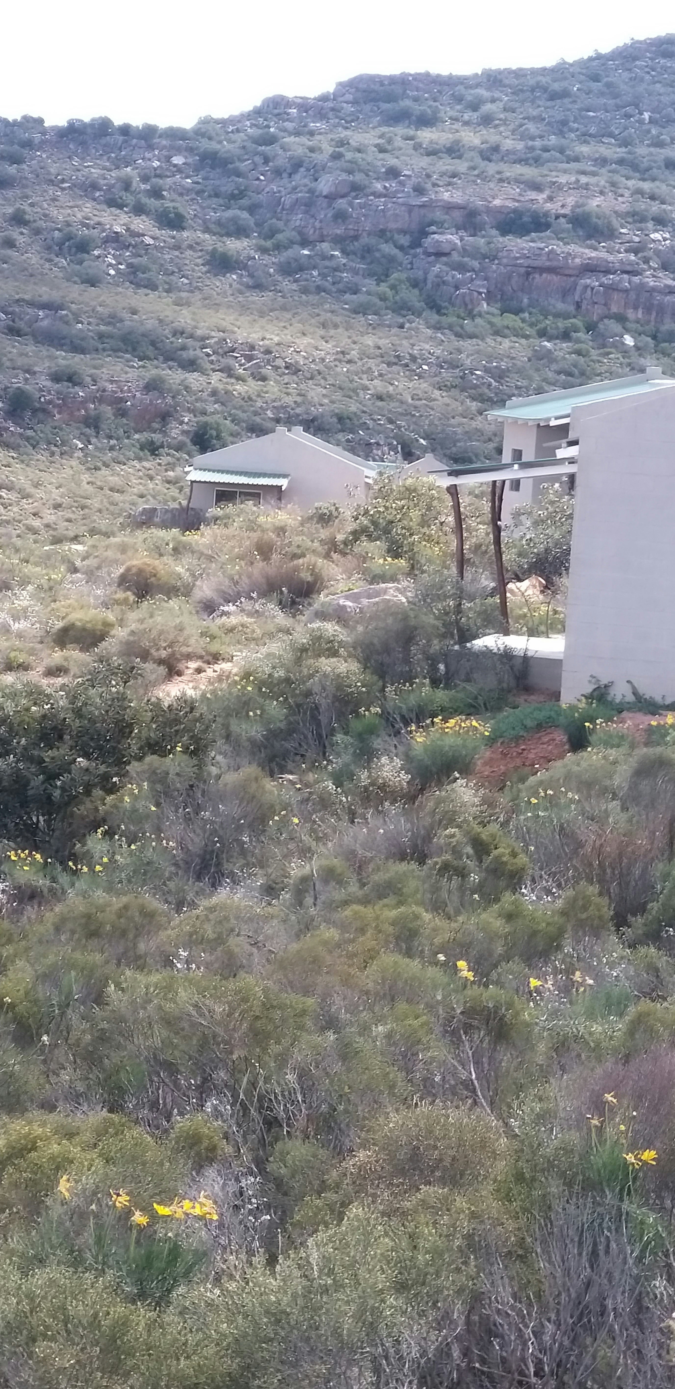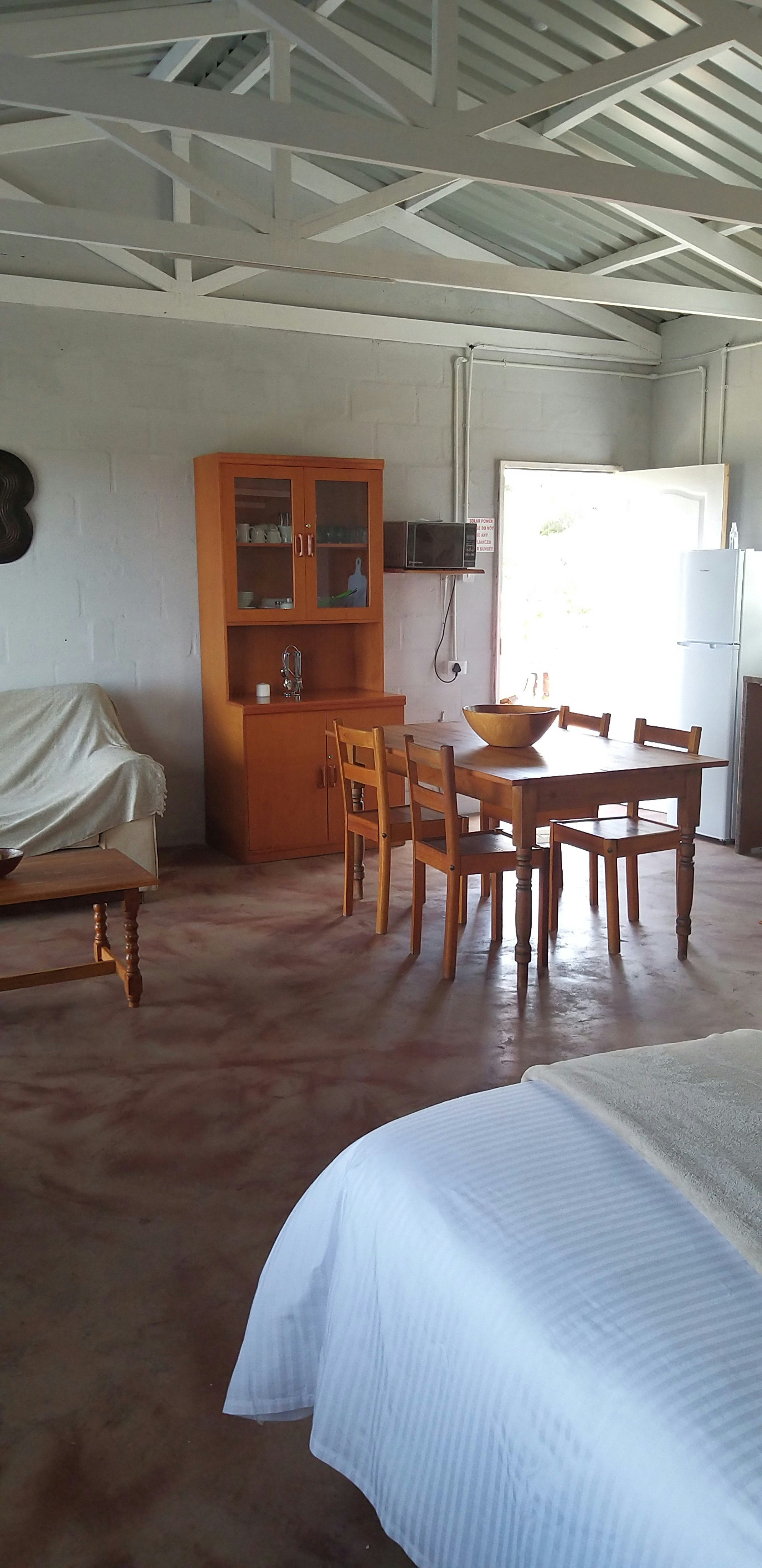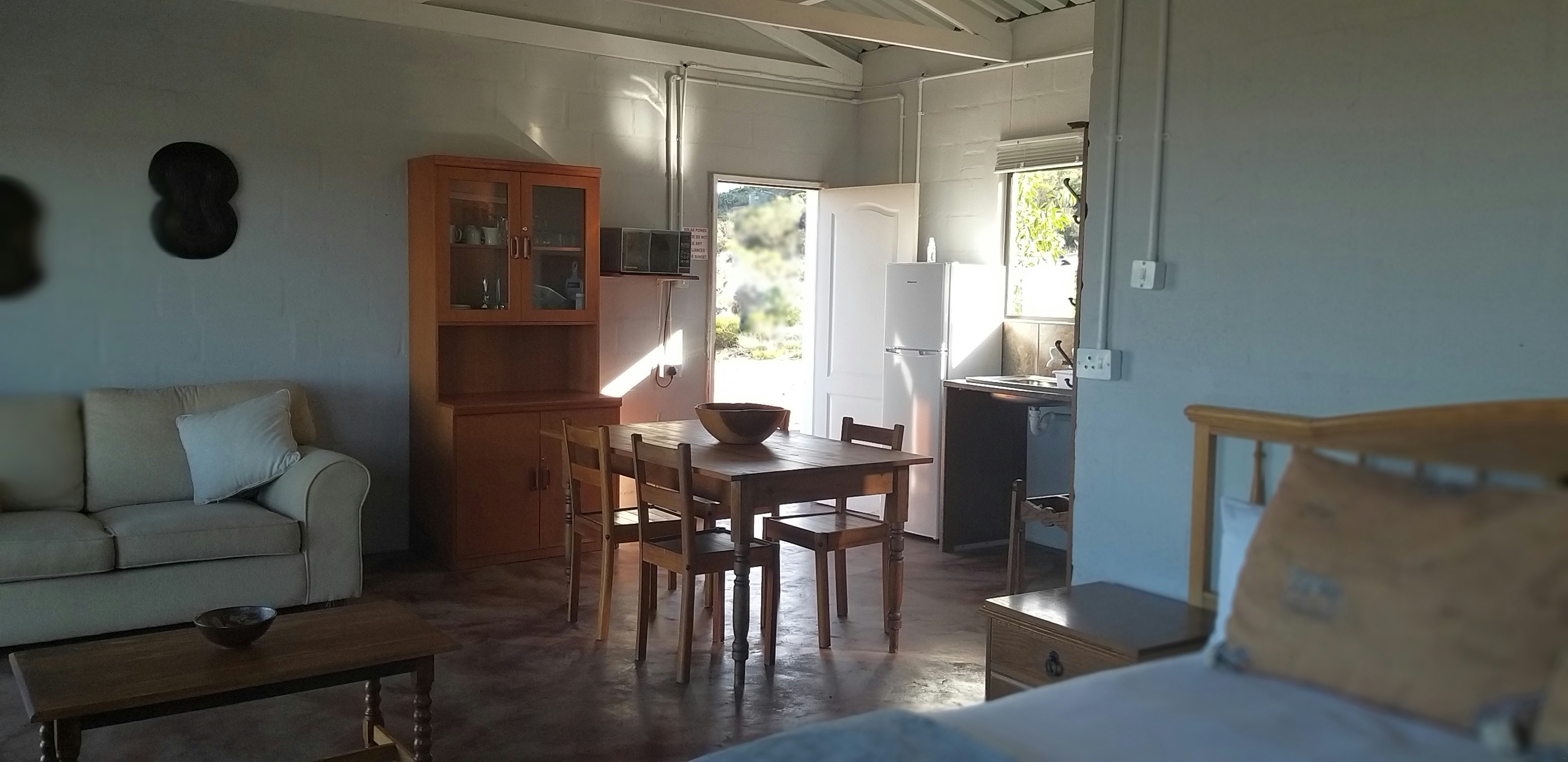 Die kothuise is selfsorgeenhede met oopplan-uitlegte en het slaapplek vir 3 Geskik vir n egpaar met n klein kind Elke eenheid het 'n dubbelbed en n enkelbed oopplan met leefares 'n en suite-badkamer met 'n stort, toilet en 'n wasbak. Die kombuis het 'n yskas, gasstoof, koffie- en teemaakgeriewe, eetgerei en breekware. Elke kothuis het 'n privaat braai-area en stoep met 'n panoramiese uitsig op die berg en oor die landerye. Die ligte en yskas is sonkrag-aangedrewe en ongelukkig is die toerusting na donker beperk. Skootrekenaars en selfone kan gelaai word.