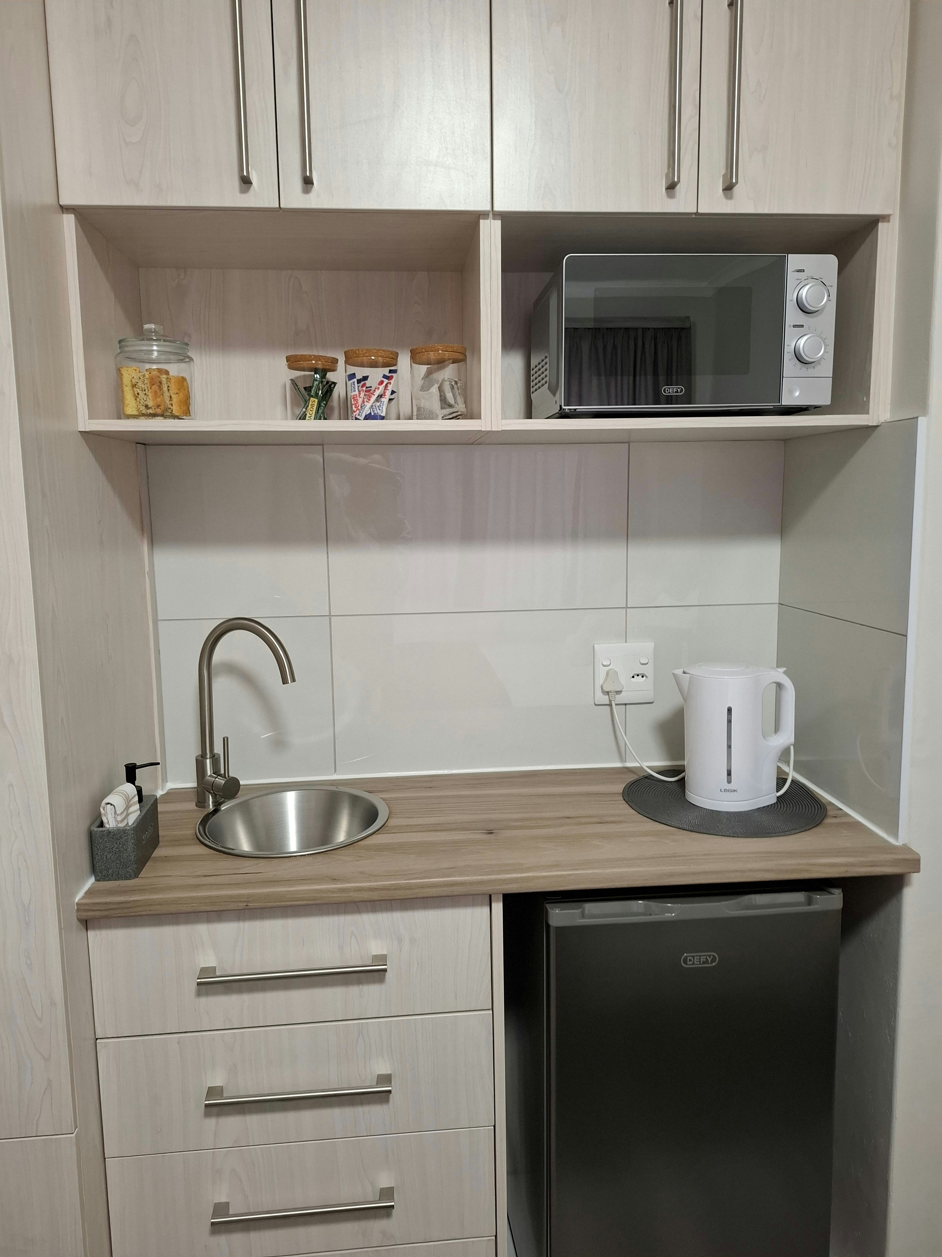The kitchenette is equipped with a microwave, kettle, toaster, and bar fridge. For entertainment, a smart TV and Wi-Fi access are available.