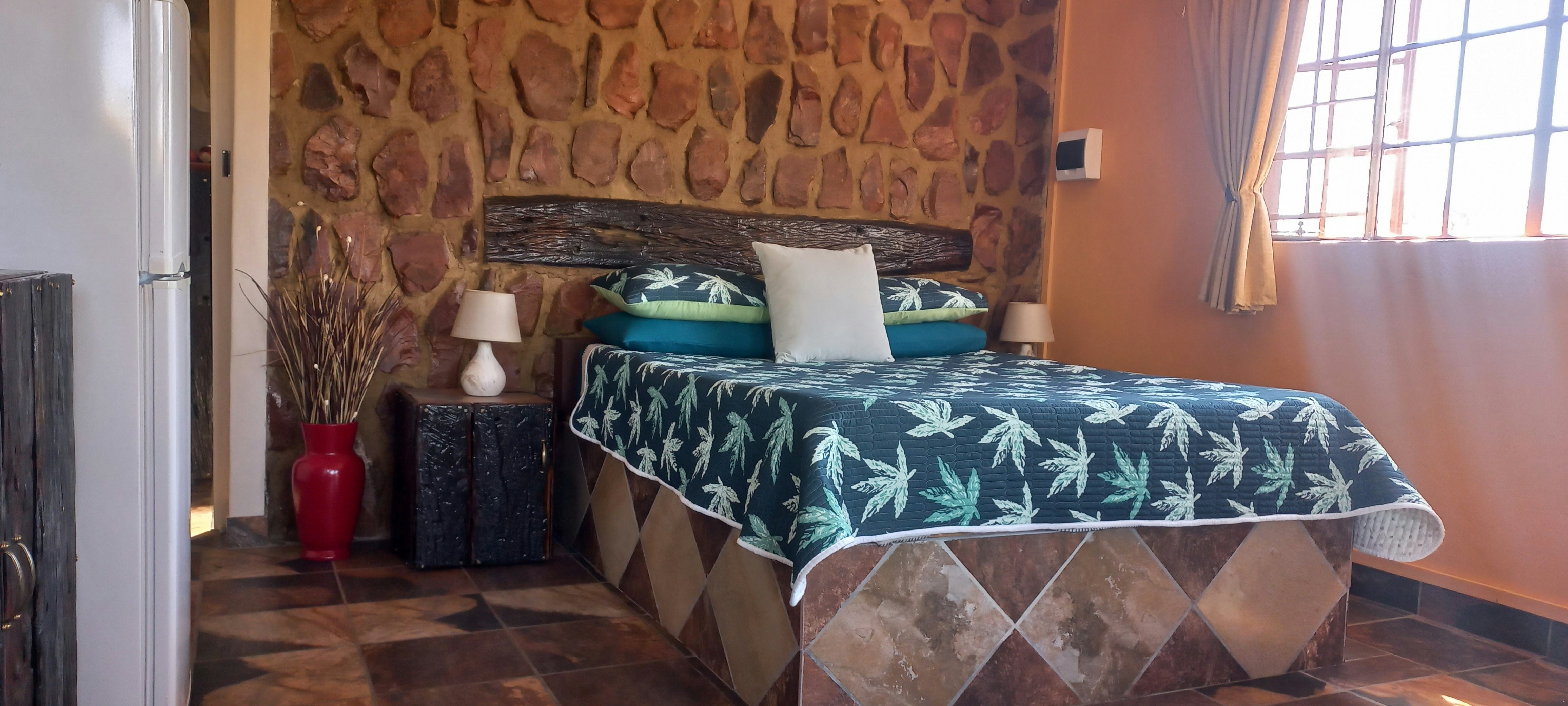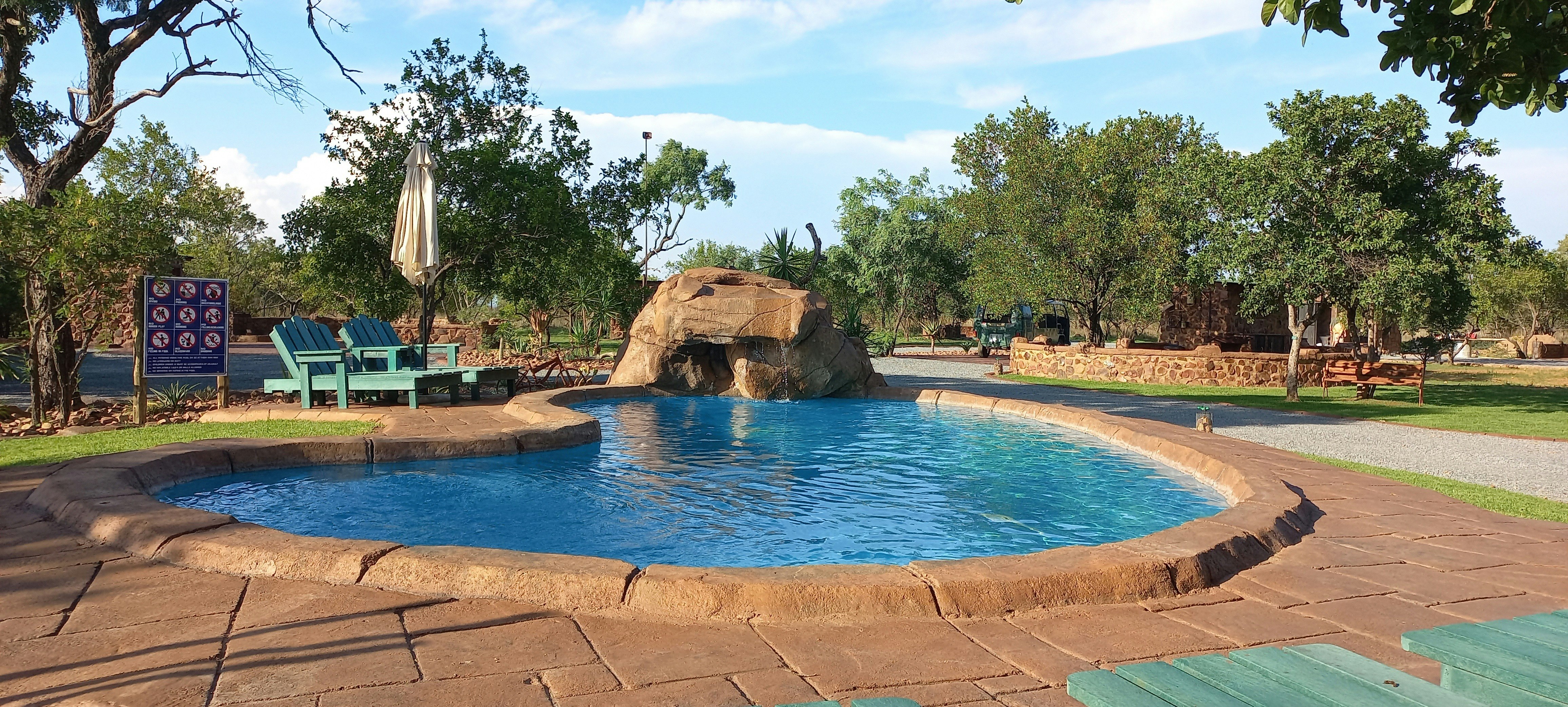 The chalet has a private bushveld braai boma with a braai and firepit, as well as a natural rock pool that can be heated using a traditional fire. Guests also have access to the communal swimming pool area at the caravan park, 700 metres away, which includes lawns, sun loungers, and picnic tables.