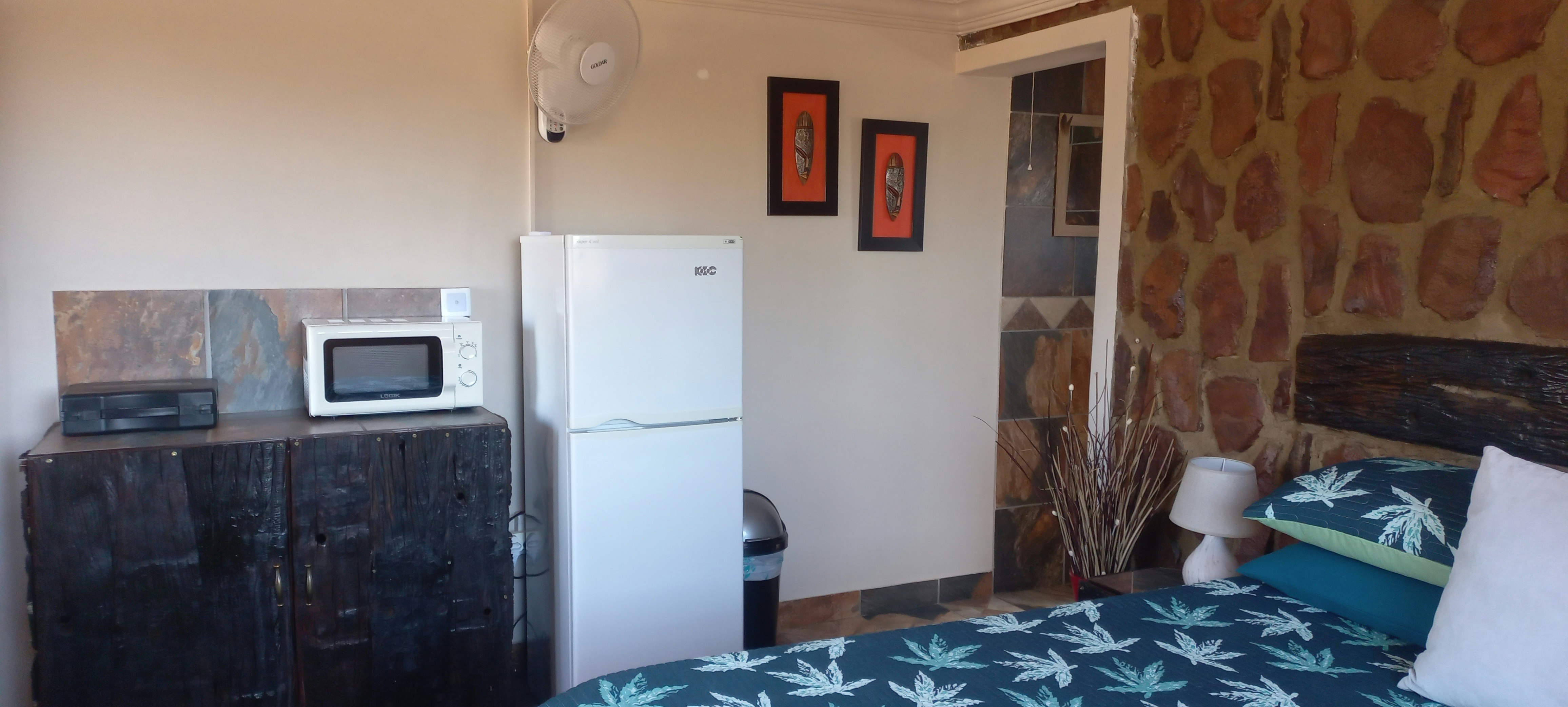 The open-plan chalet accommodates 2 adults and 1 child on a stretcher or inflatable mattress. It features a queen-size bed and an en-suite bathroom with a shower, wash basin, and toilet. The chalet includes a fridge, microwave, kettle, gas stove, cutlery, and crockery.