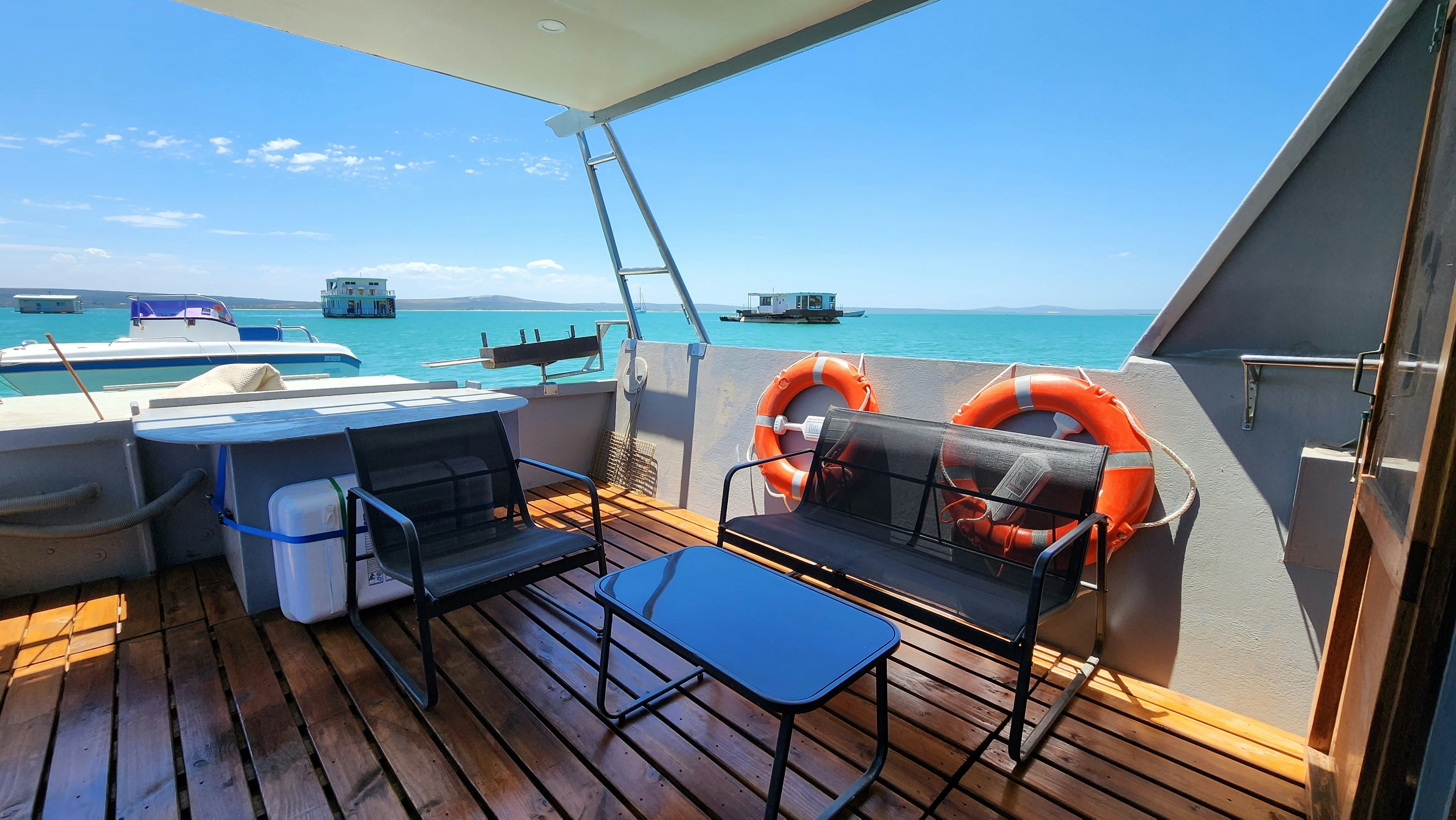 Kraalbaai has 5 peaceful houseboats awaiting your arrival. the Larus Houseboat for 2 adults and 2 kids then the Serenity and the Eve Houseboat sleeps 4 each , the Nirvana Houseboat sleeps, 20 guests. The houseboats each contain a kitchen, flush toilets, large pentagonal showers and basins; as well as a spacious lounges with a fireplaces. The lounges lead out onto the large, wind-free fore deck, equipped with tables and chairs, making this the ideal spot for dining with a view. Each houseboat has a swim deck with flotation.