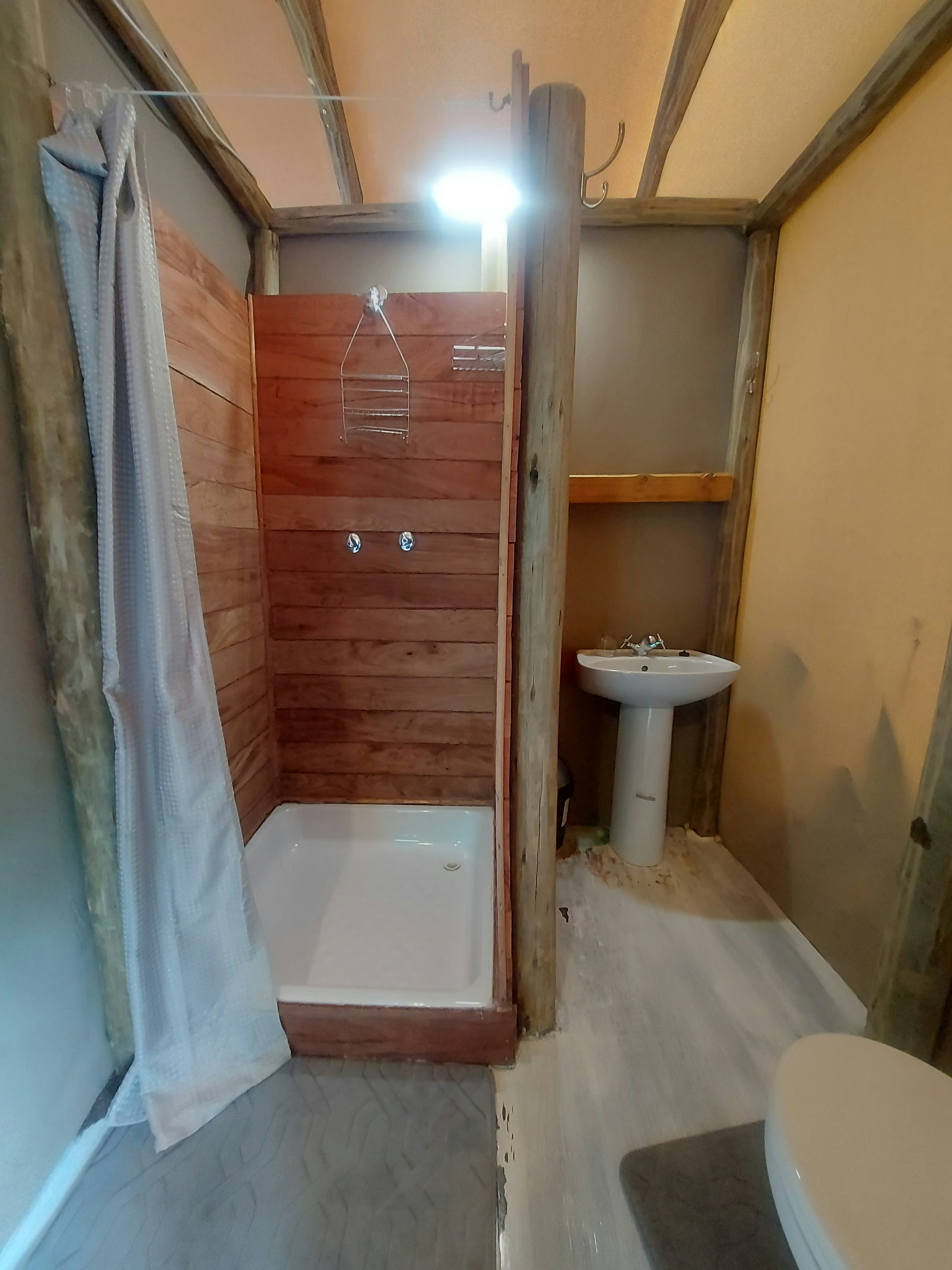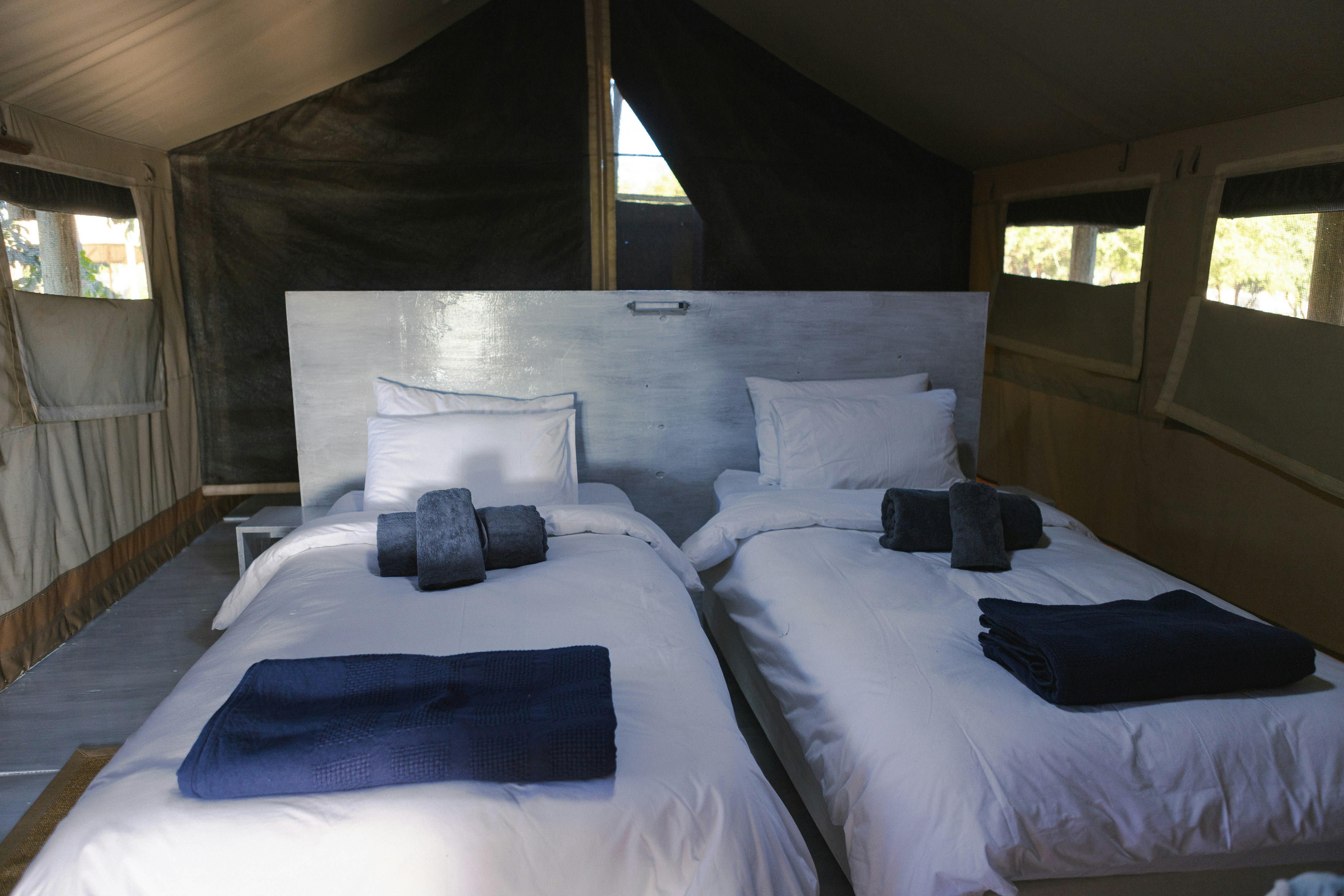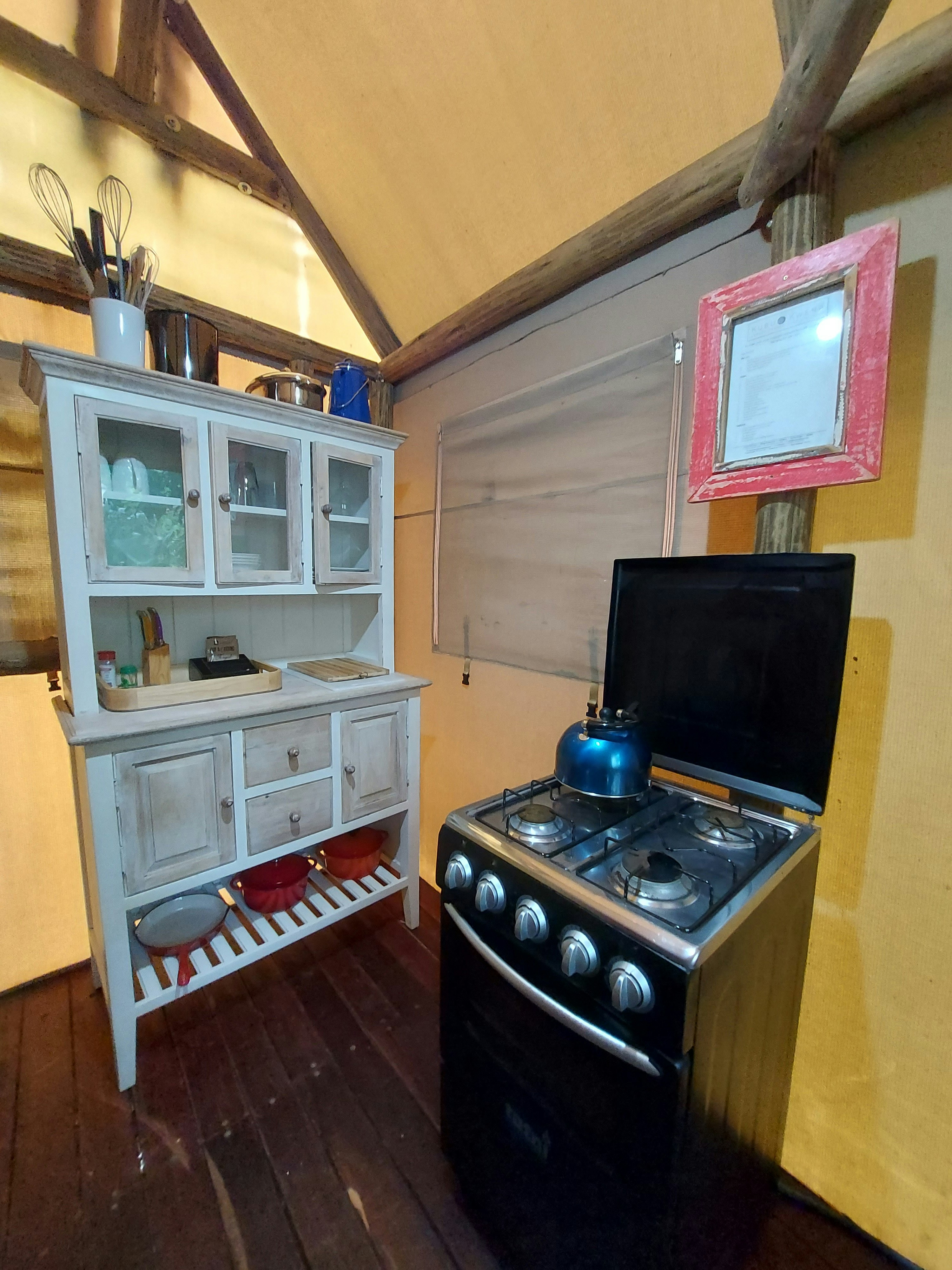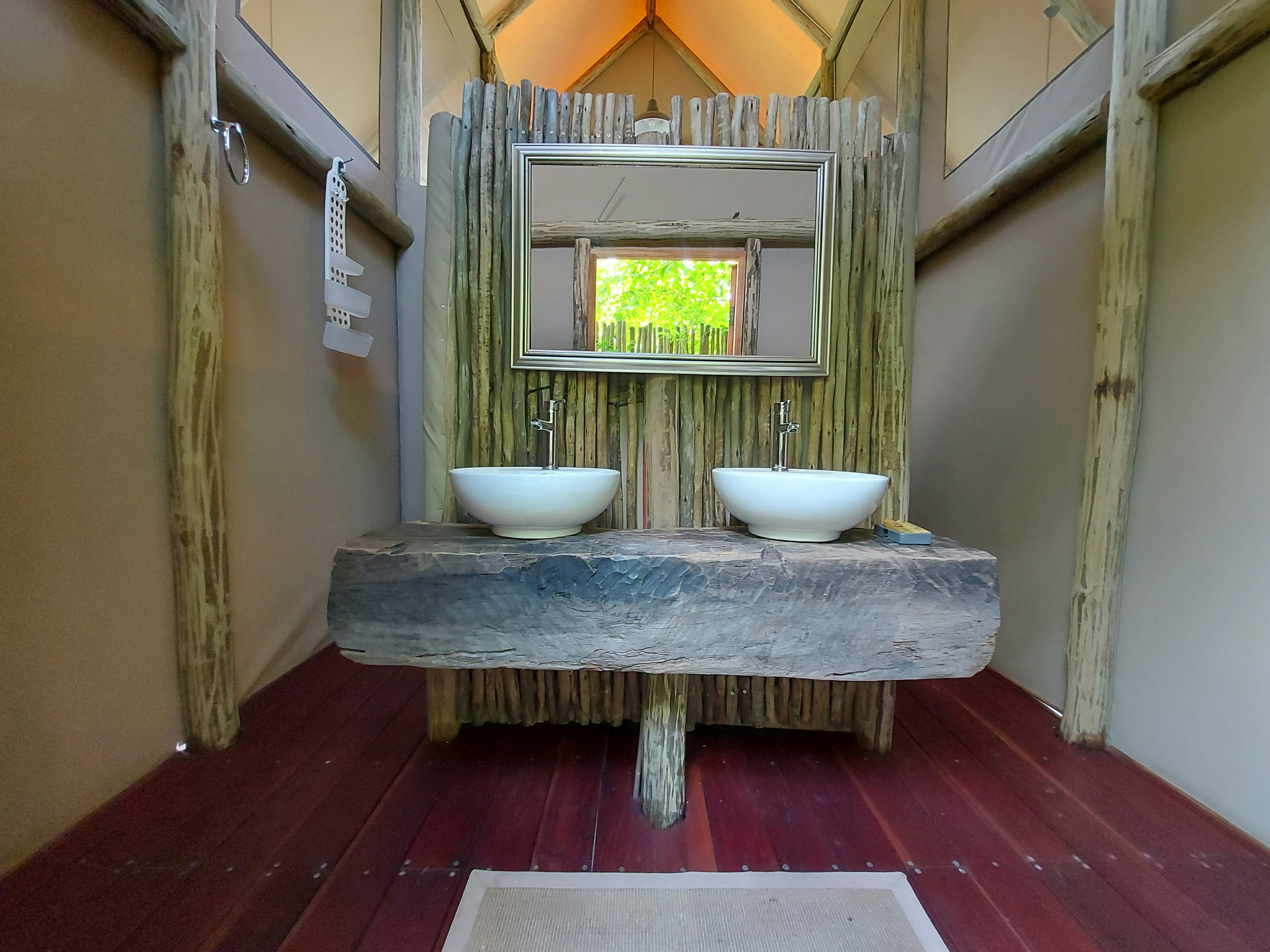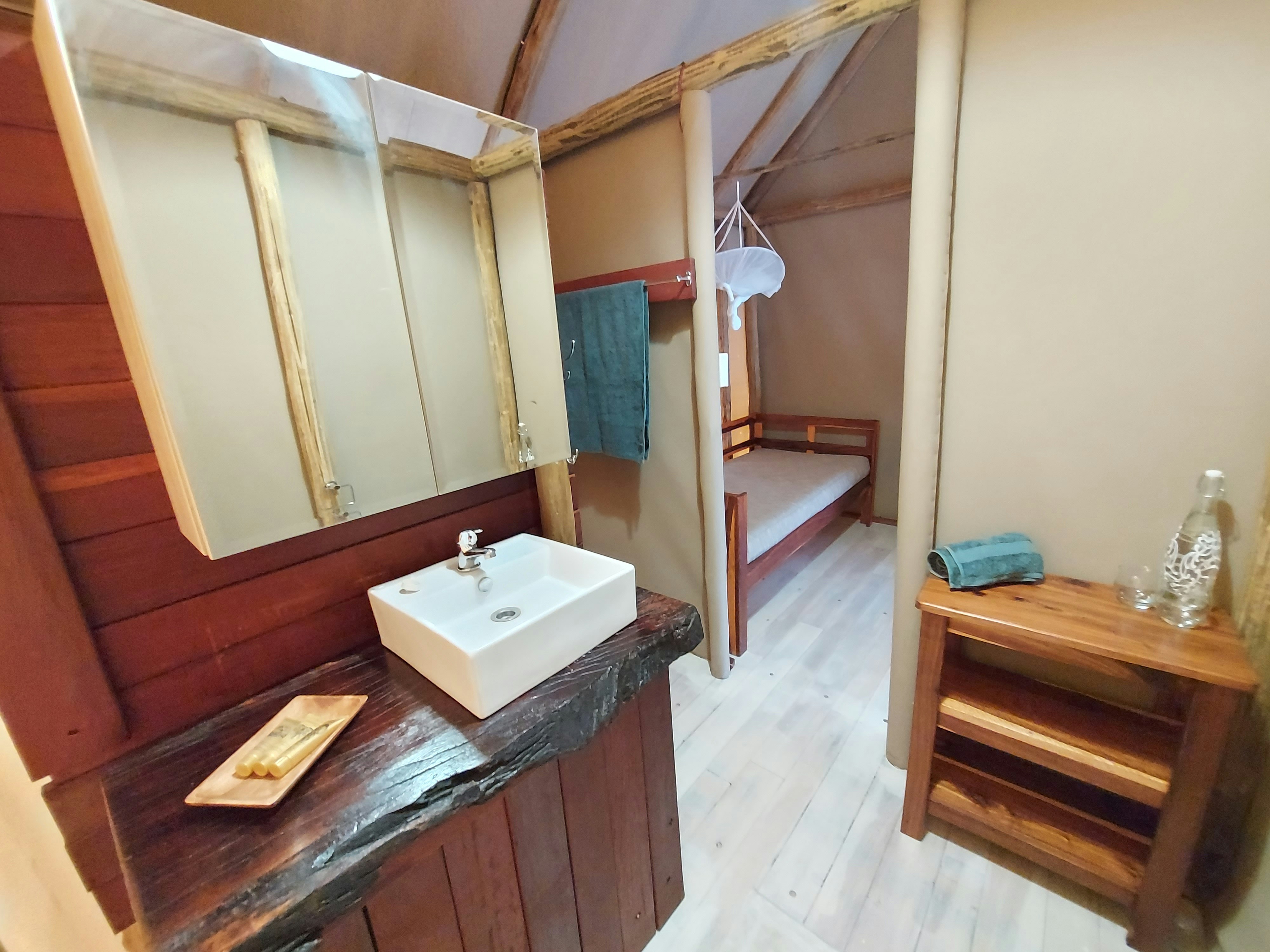 Hier word 'n diverse reeks verblyf, van tent-kothuise tot kampgeriewe, aangebied en daar daar is slaapplek vir 30 gaste. Die lodge het 'n kroeg en restaurant, naamlik Kunwa en Kuca. Die kothuise het óf enkelbeddens, koningingrootte-beddens, dubbelbeddens óf stapelbeddens. Elke kothuis het sy eie badkamer met stortgeriewe en die kampterrein het 'n gemeenskaplike badkamer met stortgeriewe.