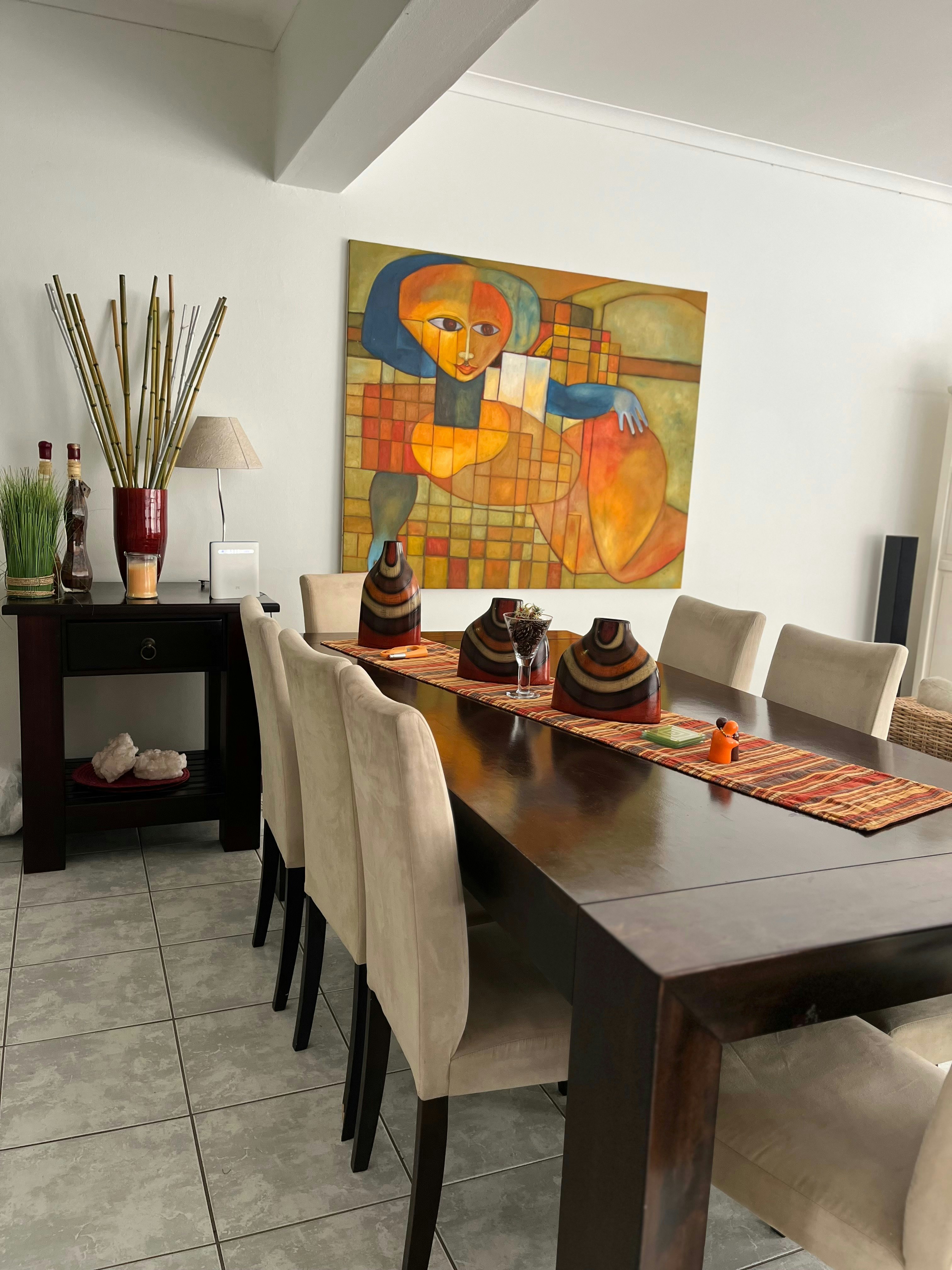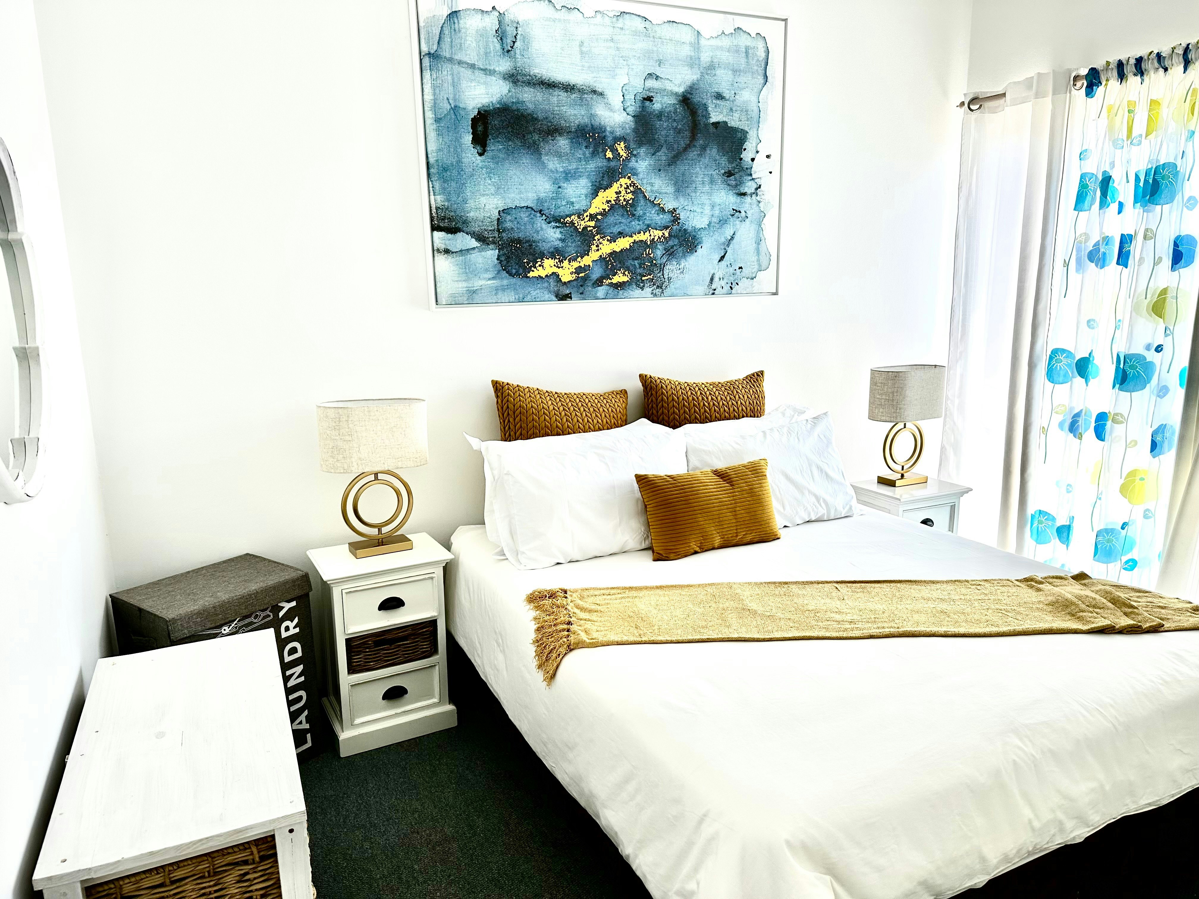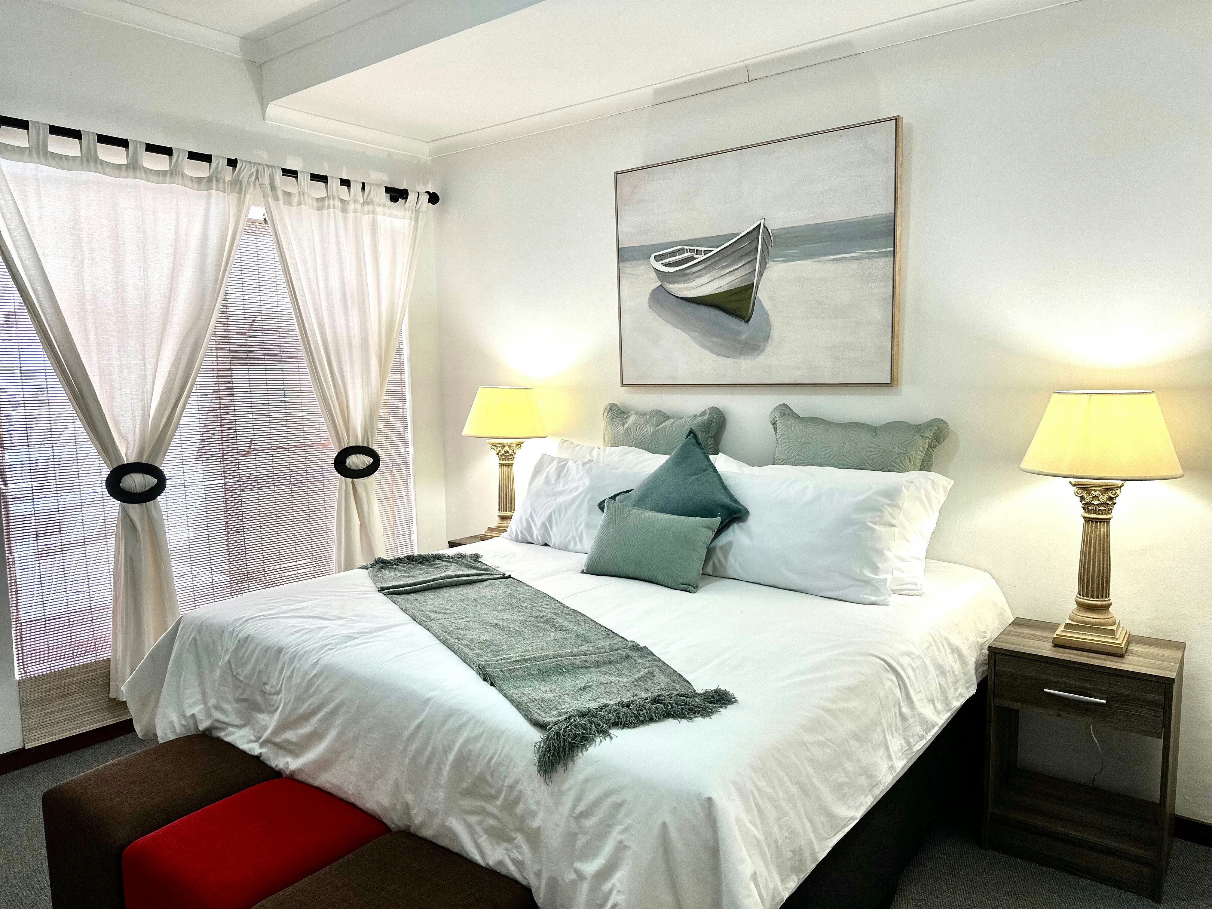 The open-plan living area is designed for comfort, offering a cosy lounge with a TV, a dining table, and a well-equipped kitchen with a fridge-freezer, stove, oven, microwave, and coffee- and tea-making facilities. Guests can relax in the courtyard and use the braai facilitites available.