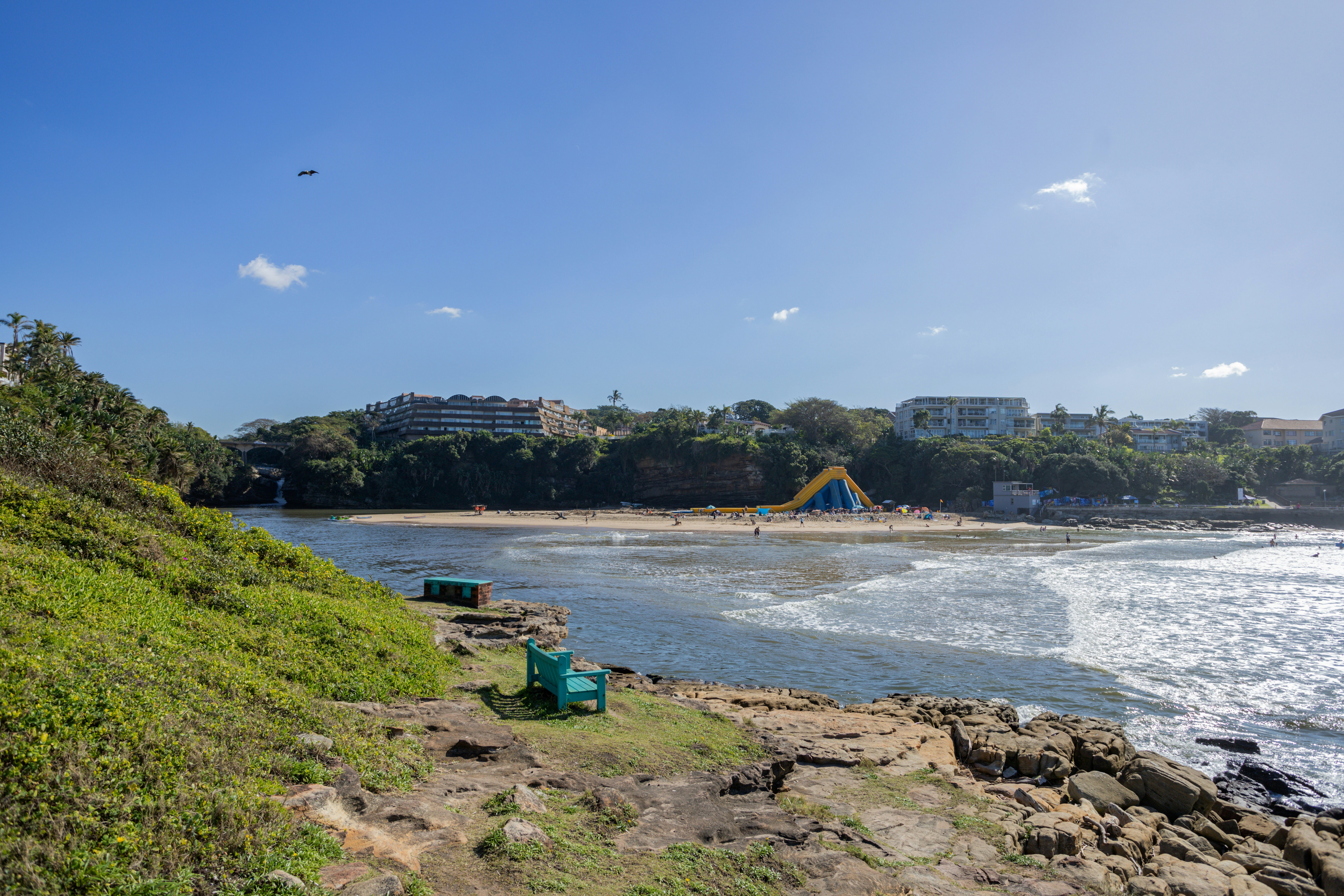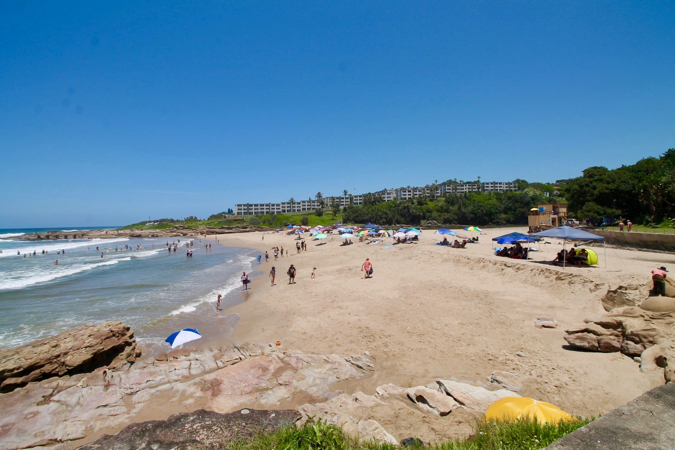 Uvongo Beach has shark nets and lifeguards and is safe for swimming. The beach has a lovely lagoon that is fed by a picturesque waterfall. Canoes and paddle boats can be rented on the lagoon.