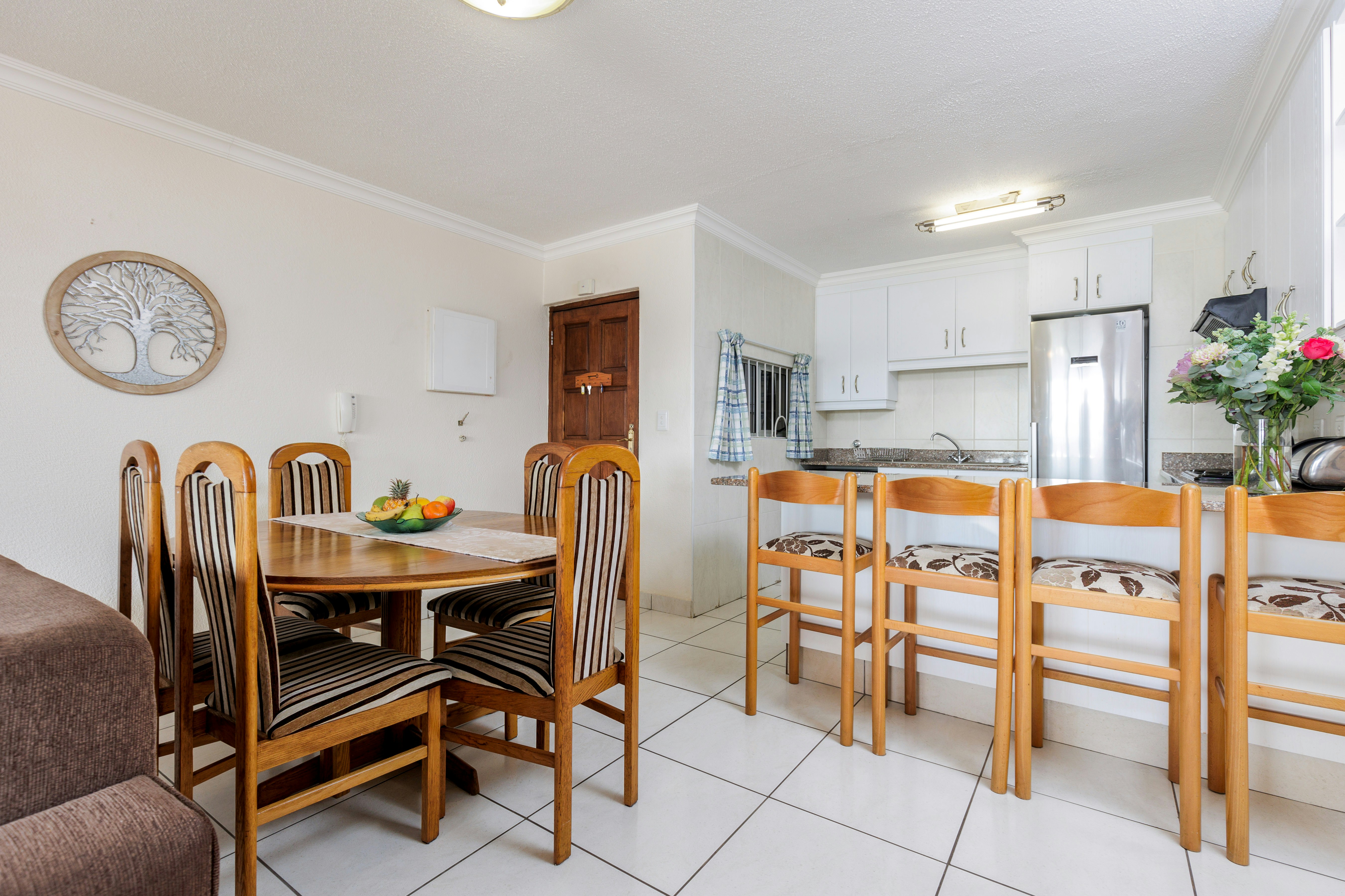 Die oopplan-kombuis is volledig toegerus met 'n yskas, mikrogolf, oond, stoof en skottelgoedwasser. Die sitkamer langsaan het 'n TV met DStv. Die sitkamer lei na 'n ruim balkon met 'n gasbraai.
