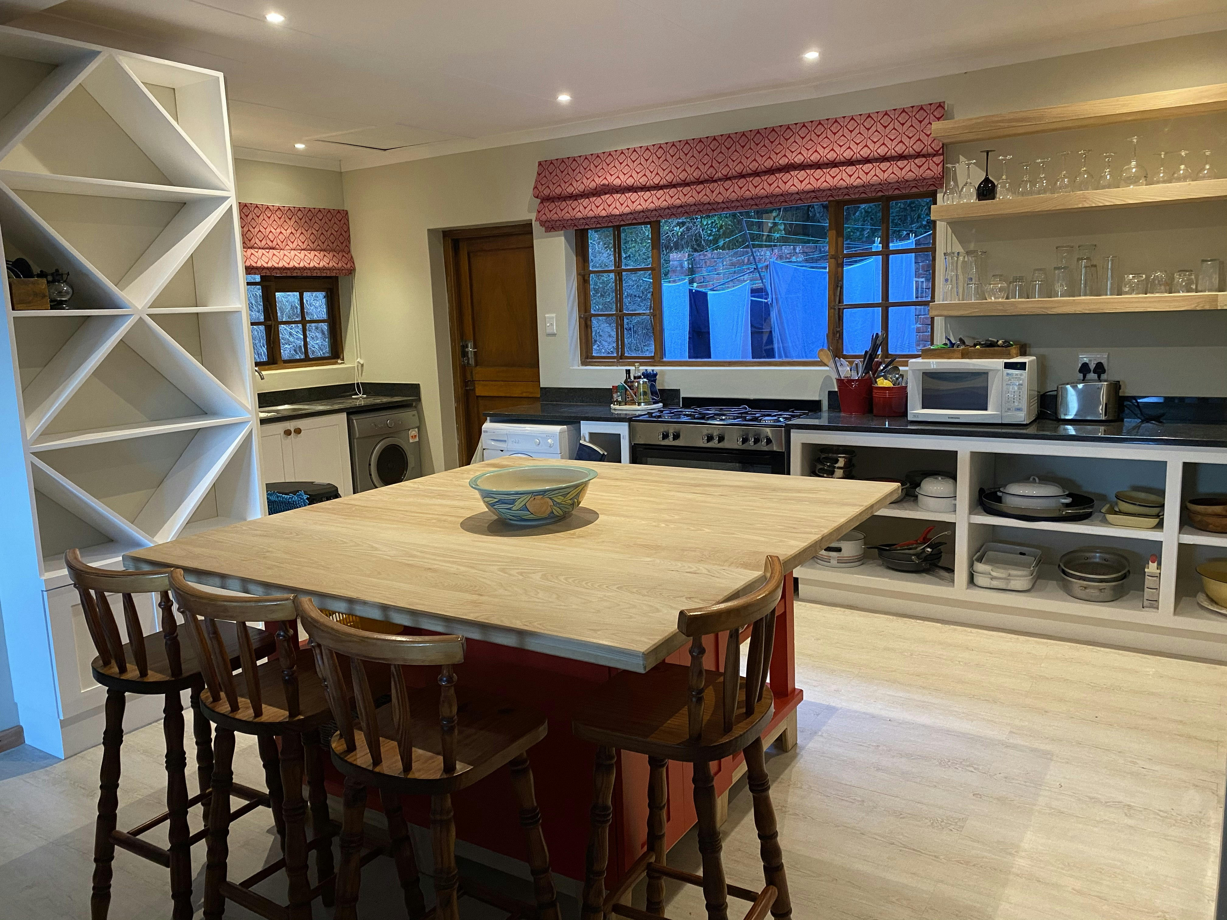 The kitchen is fully equipped for self-catering. The dining area contains a 10-seater dining table and chairs. The lounge contains a flat-screen TV with basic DStv package. The house has an indoor fireplace for chilly winter evenings. The living area opens to a patio with outdoor dining furniture and a braai area.