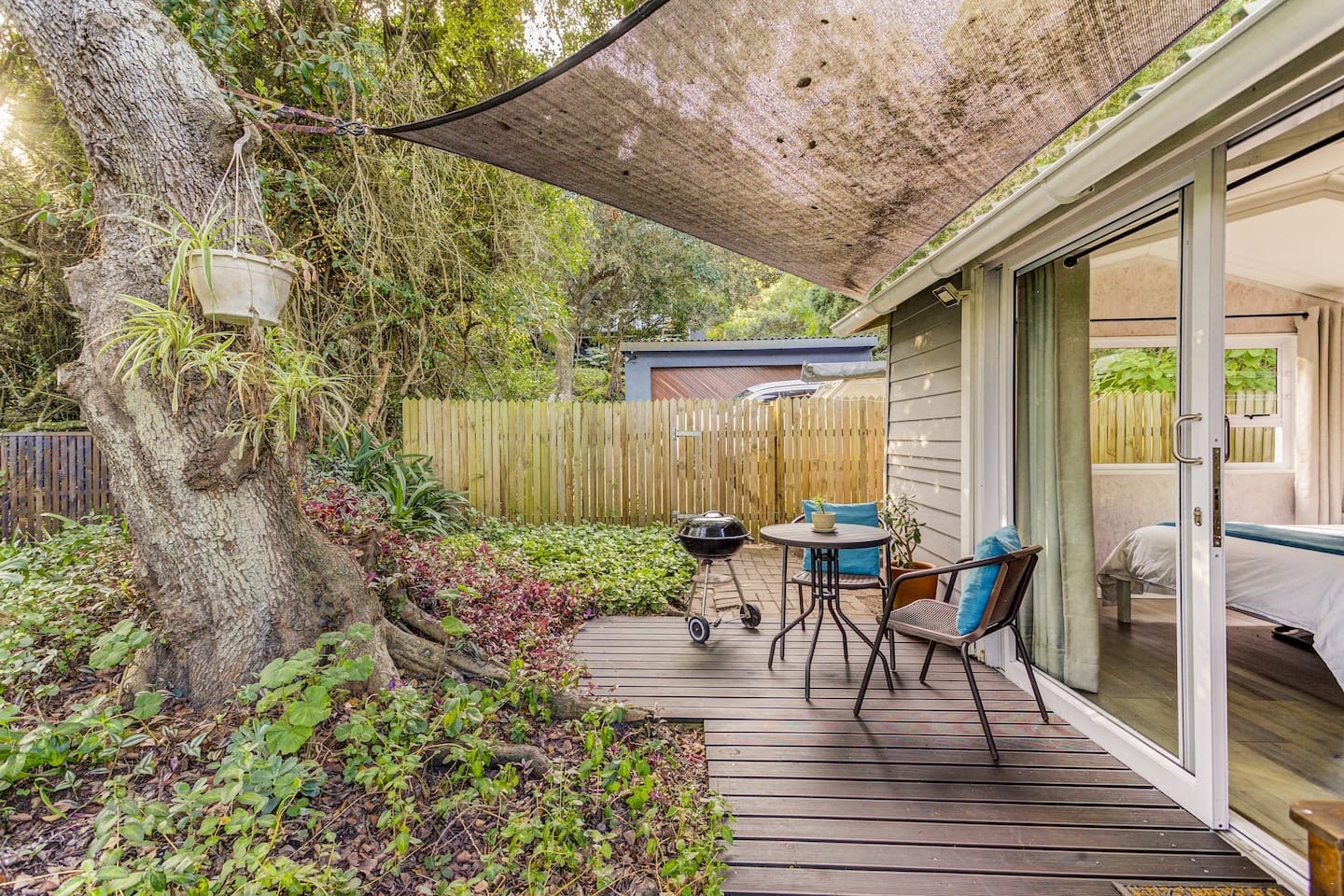 Die kombuisie is goed toegerus met 'n yskassie, mikrogolfoond, lugbraaier en koffie- en teemaakgeriewe. 'n Skadudek lei na die kothuis se privaat tuinarea, wat die tuiste is van verskeie beskermde Melkhoutbome, wat 'n rustige omgewing vir ontspanning bied. 'n Weber-braai is beskikbaar vir buitelugkook, en veilige parkering word op die perseel agter 'n geslote hek voorsien.