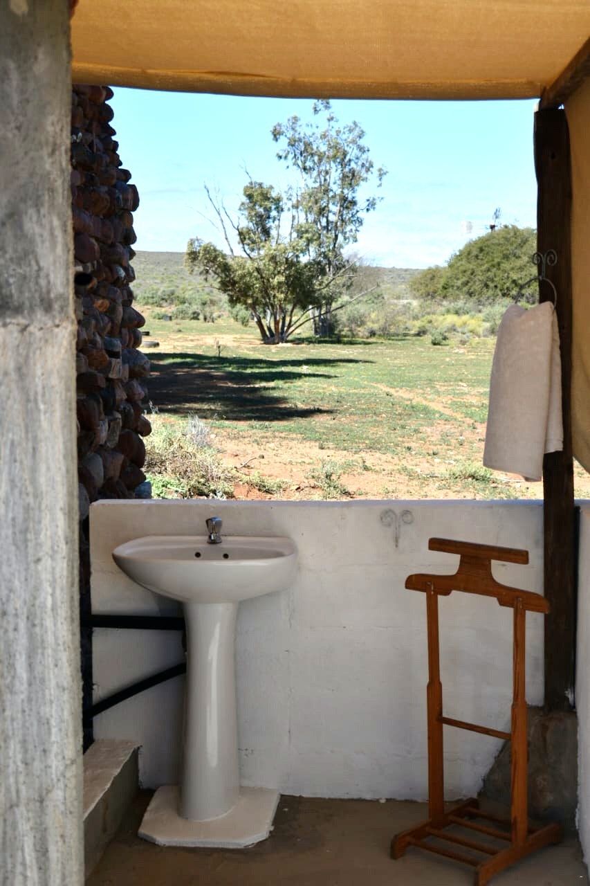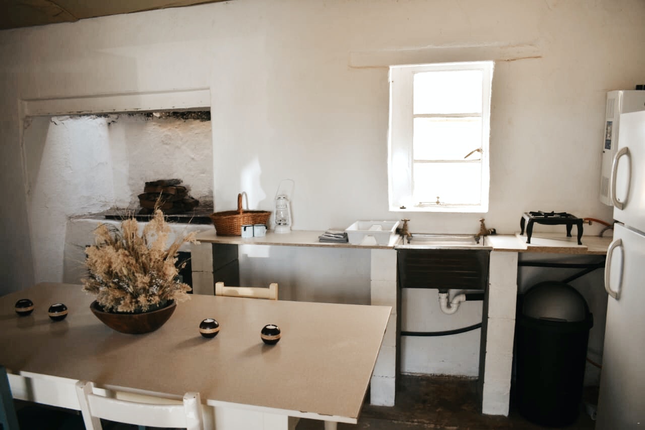 Leeuriet Veldhuisie is an open-plan cottage that comprises a sleeping area, an outdoor bathroom, a kitchen and a fireplace. The sleeping area is furnished with a double bed. The bathroom is located outside with a shower, a basin and a toilet. The kitchen is equipped with a fridge-freezer, a gas stove, crockery, cutlery, and a dining table. The cottage has no electricity, Wi-Fi or mobile service.