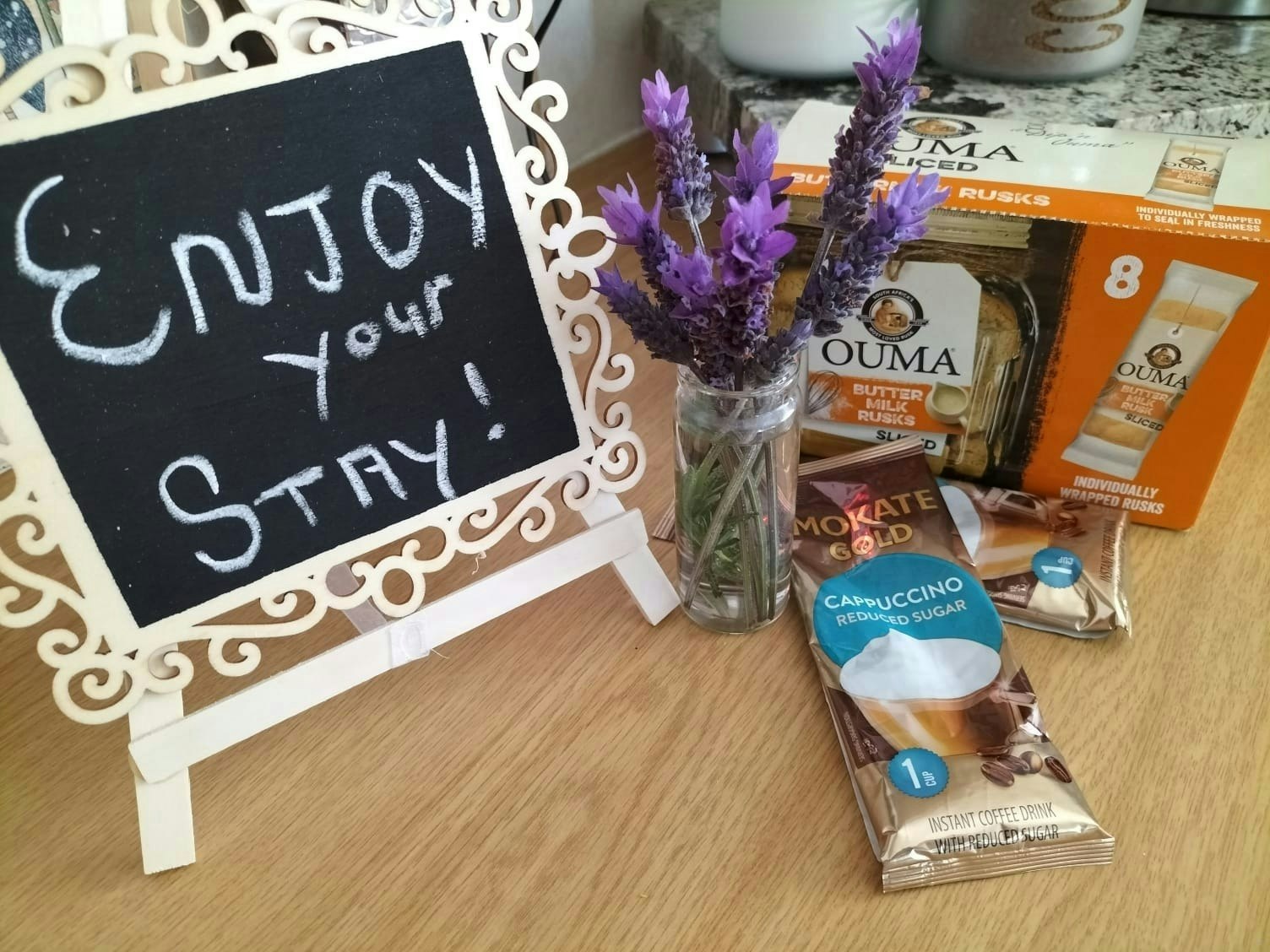 Die kombuis is volledig toegerus vir selfsorg en sluit 'n lugbraaier, gasstoof, oond, yskas-vrieskas, mikrogolfoond, eetgerei en breekware in. Die leefarea het gemaklike sitplek en 'n slim-TV met DStv en Showmax. WiFi-toegang word voorsien. Daar is 'n kaggel vir die koue winternagte en 'n omskakelaar vir beurtkrag.