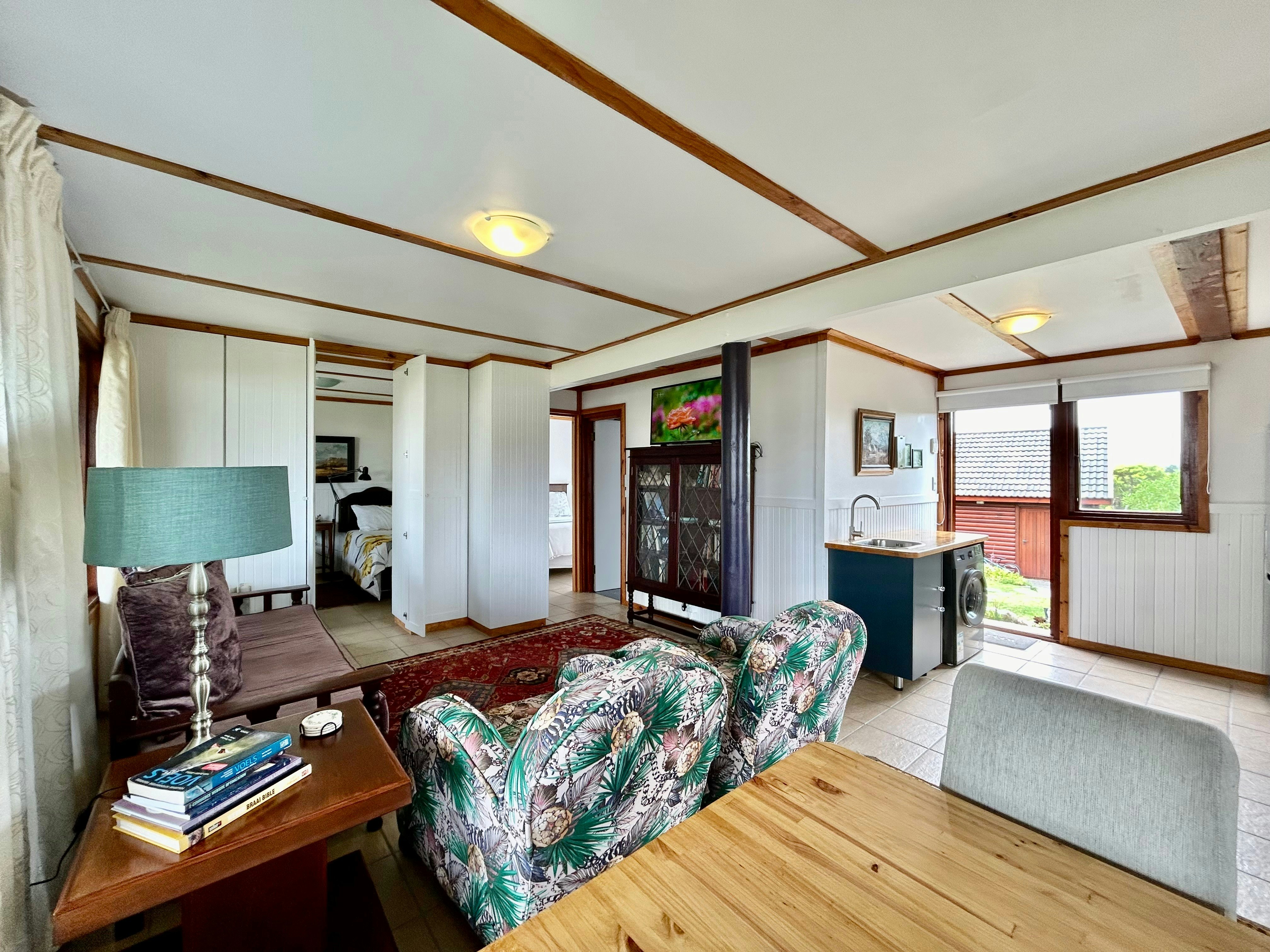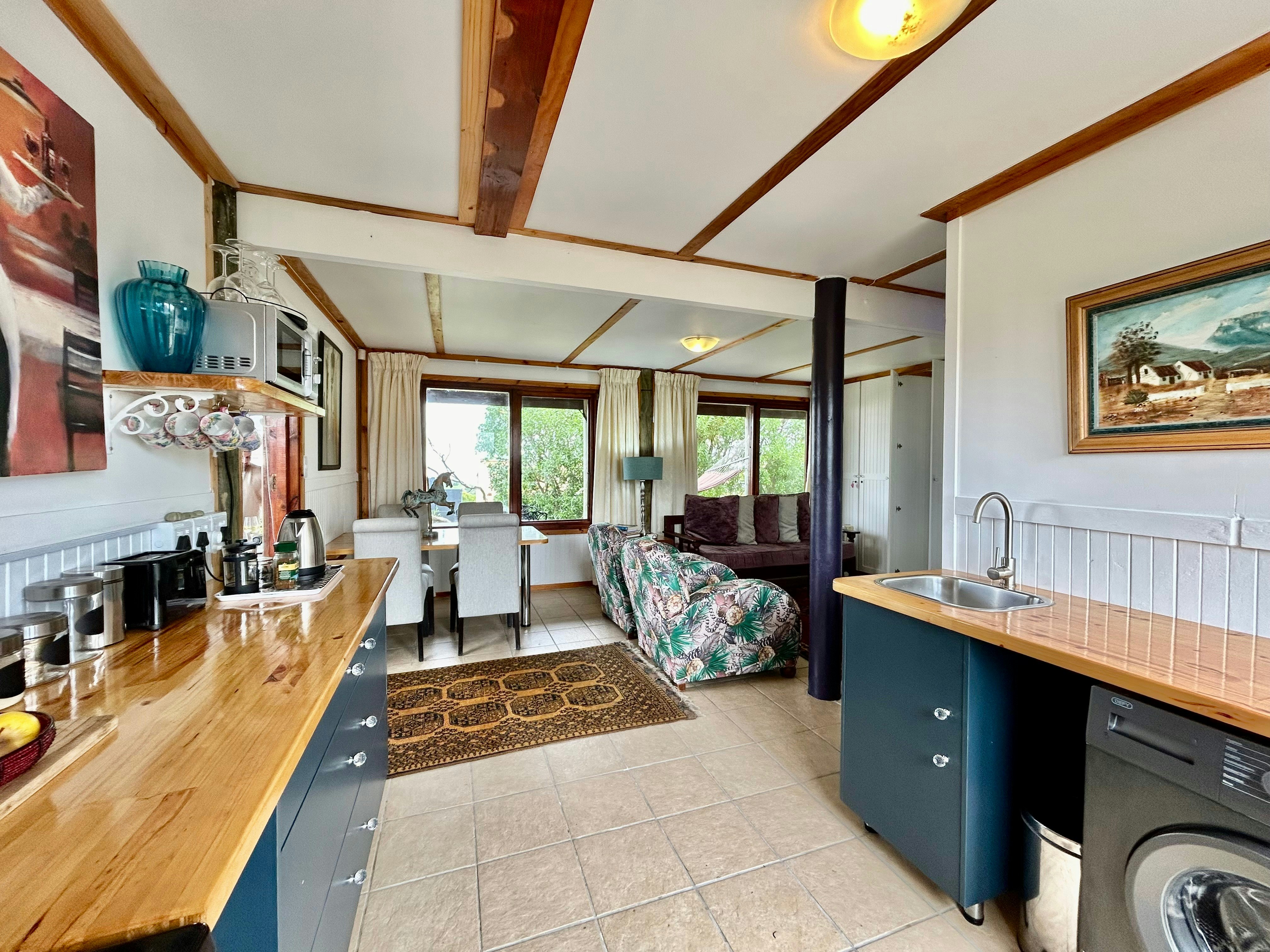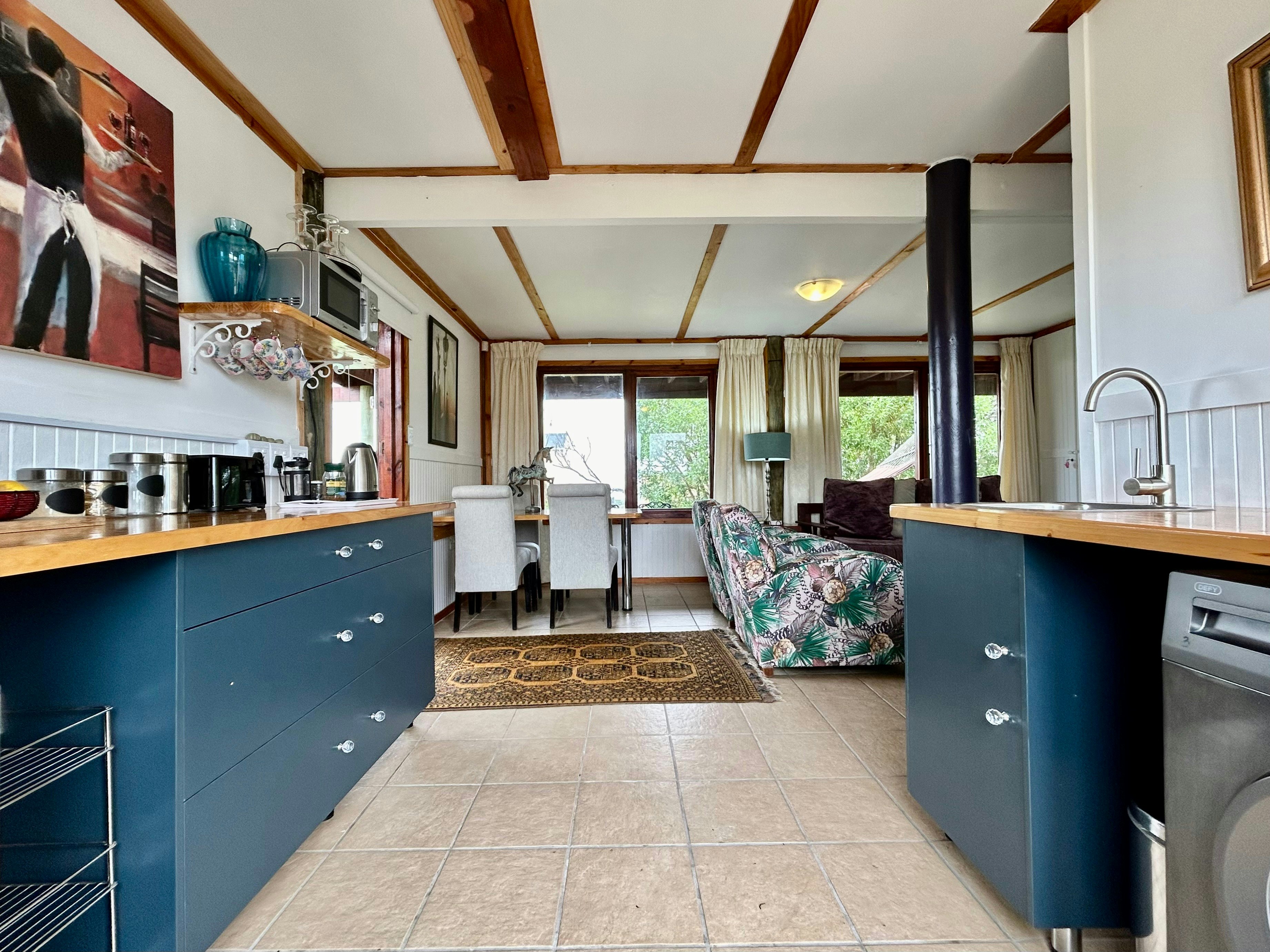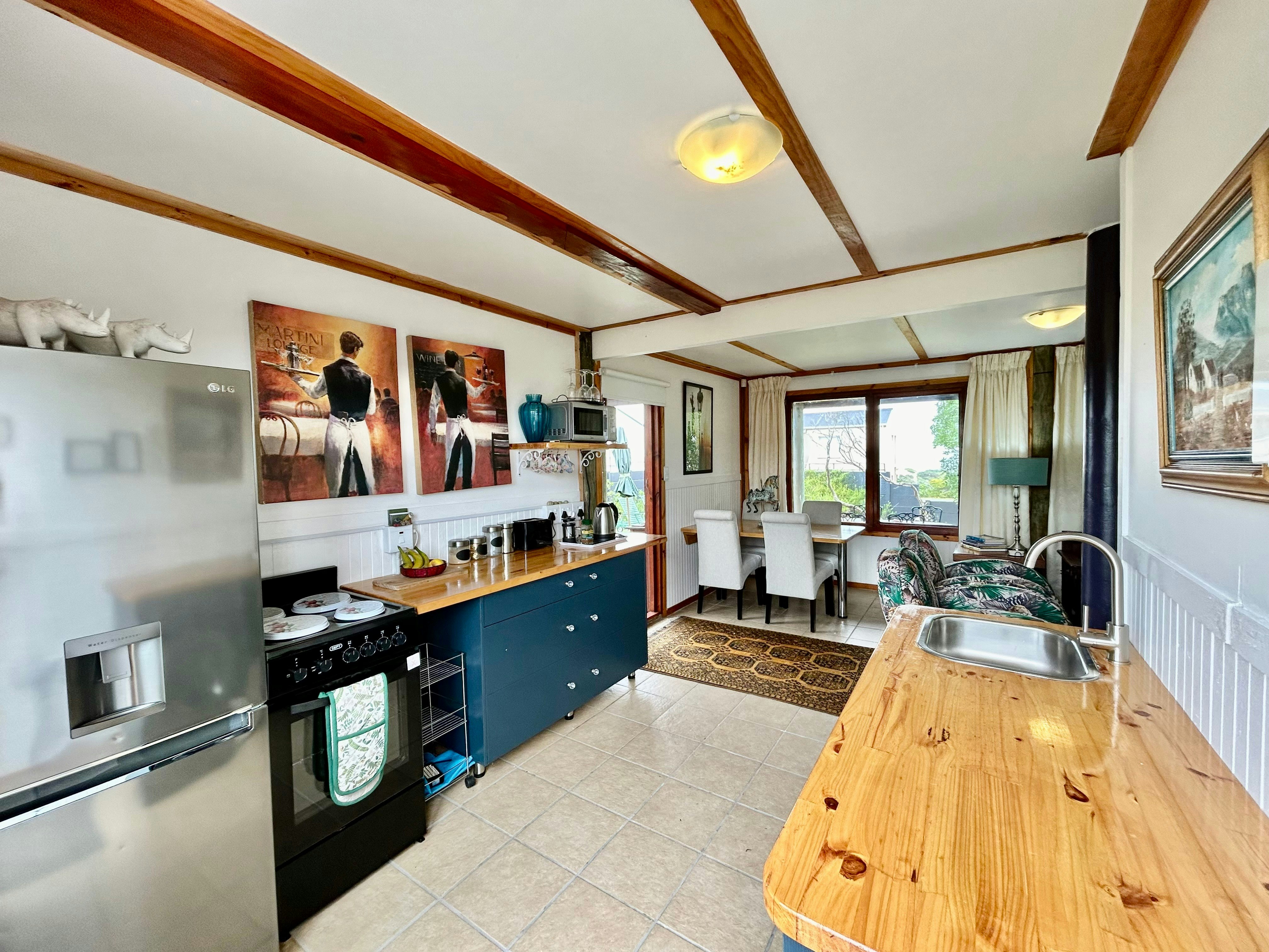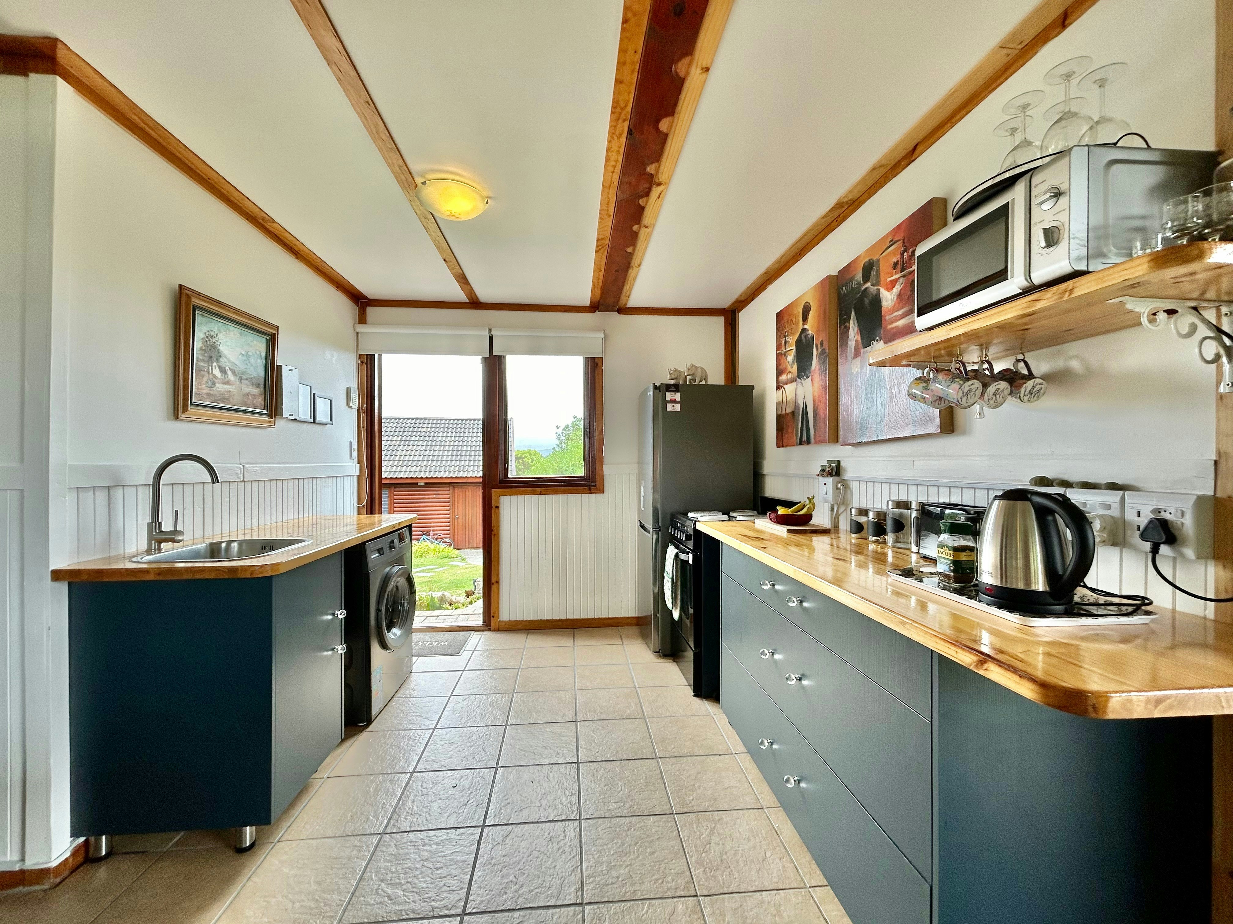 Die kombuis is volledig toegerus met 'n yskas-vrieskas, stoof, oond, mikrogolfoond, eetgerei, breekware en tee- en koffiemaakgeriewe. Daar is ook 'n wasmasjien vir gaste se gerief. Dit strek tot by die etenstafel, waar gaste hul maaltye kan geniet en maak verder oop na die sitkamer wat gemeubileer is met gemaklike rusbanke en 'n TV met Netflix. Gratis WiFi is beskikbaar.