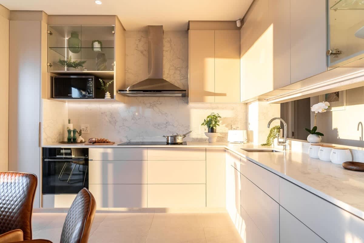 Die oopplan-leefarea sluit 'n eetkamer en 'n sitkamer met gemaklike rusbanke en 'n TV in. Die kombuis is volledig toegerus met 'n yskas-vrieskas, stoof, oond, mikrogolfoond en koffiemasjien, sowel as 'n wasmasjien, tuimeldroër en skottelgoedwasser.