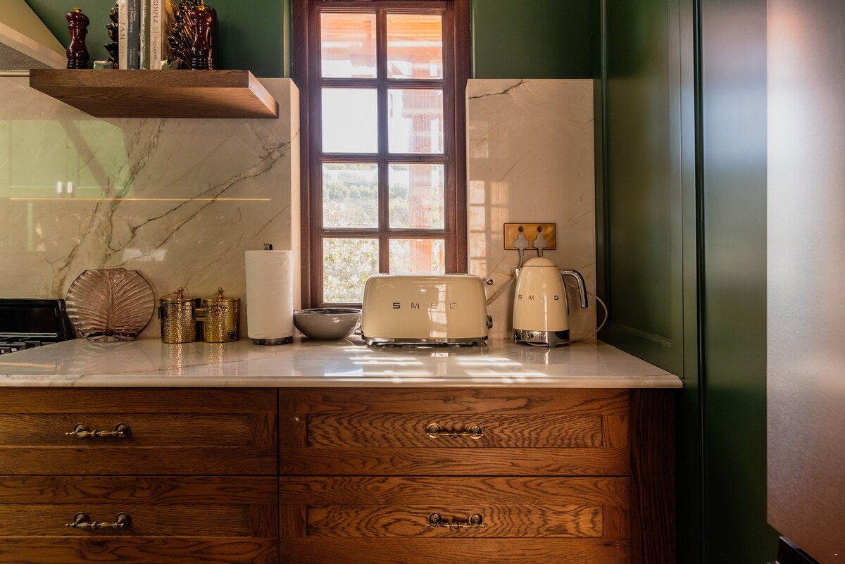 The living area features an open-plan design with a fully equipped kitchen, including a gas stove, oven, microwave, coffee machine, fridge-freezer, cutlery, and crockery. For added convenience, a dishwasher, dryer, and washing machine are also available. The lounge area is furnished with comfortable seating, a smart TV with YouTube and Netflix, along with complimentary Wi-Fi. The unit is powered by solar energy to avoid power outages.