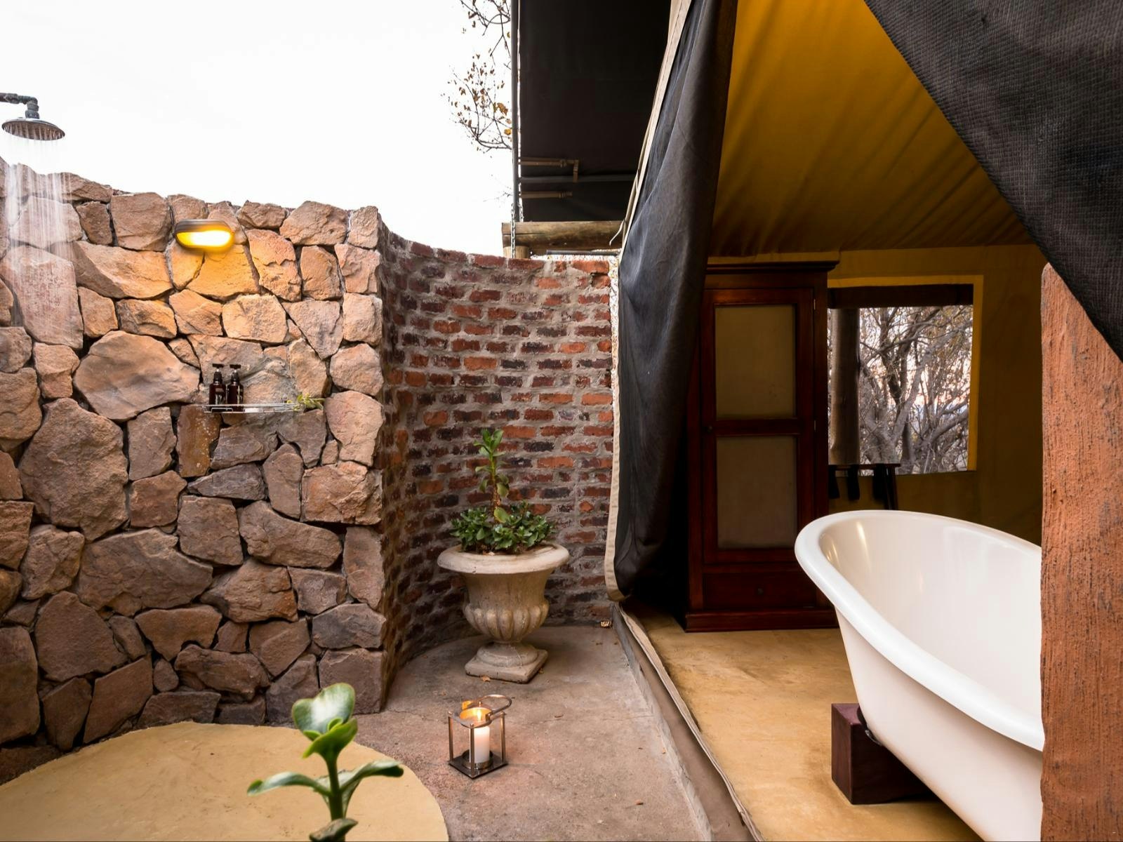 Luxury Safari Style Tent 2 @ Bushwa Game Reserve is 'n luukse tent met 'n koningingrootte-hemelbed en 'n en suite-badkamer met 'n bad, 'n buitestort, wasbak en toilet. Skoon linne en handdoeke word voorsien.
