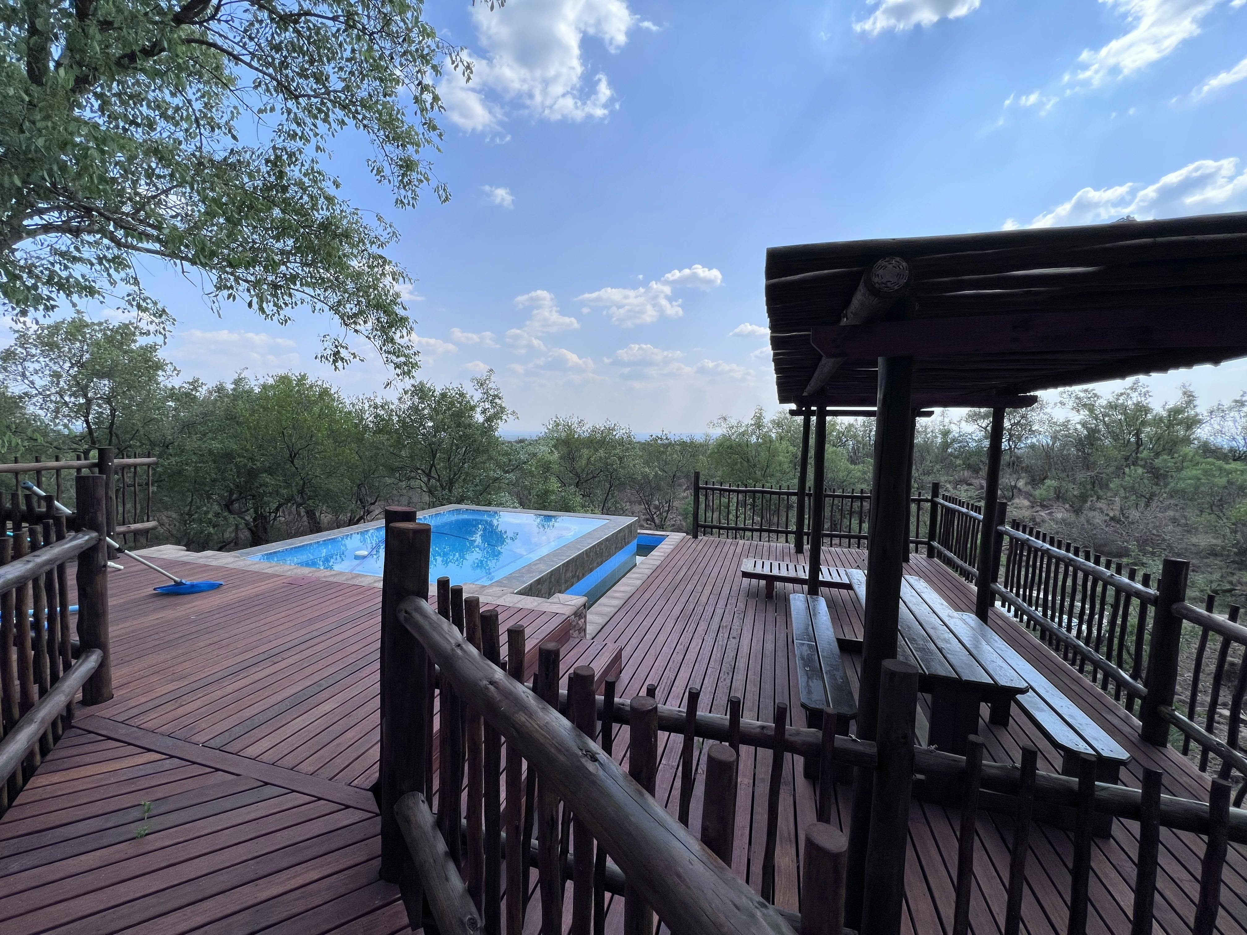 Die onderste vlak van die lodge maak oop na 'n privaat dek met 'n ronde ontbyttafel met sitplek vir 8. Die swembad kan ook vanaf die dek bereik word. By die vermaaklikheidsarea vind u die boma en 'n braaiplek, en nog 'n braaigeriewe in die groot vermaaklikheidslapa vir gaste om te gebruik. Hierdie area lei na 'n kleiner lapa, wat ook spog met 'n buitetoilet, sowel as 'n klein omheinde plonspoel. Grasdak-onderdakparkering is beskikbaar.