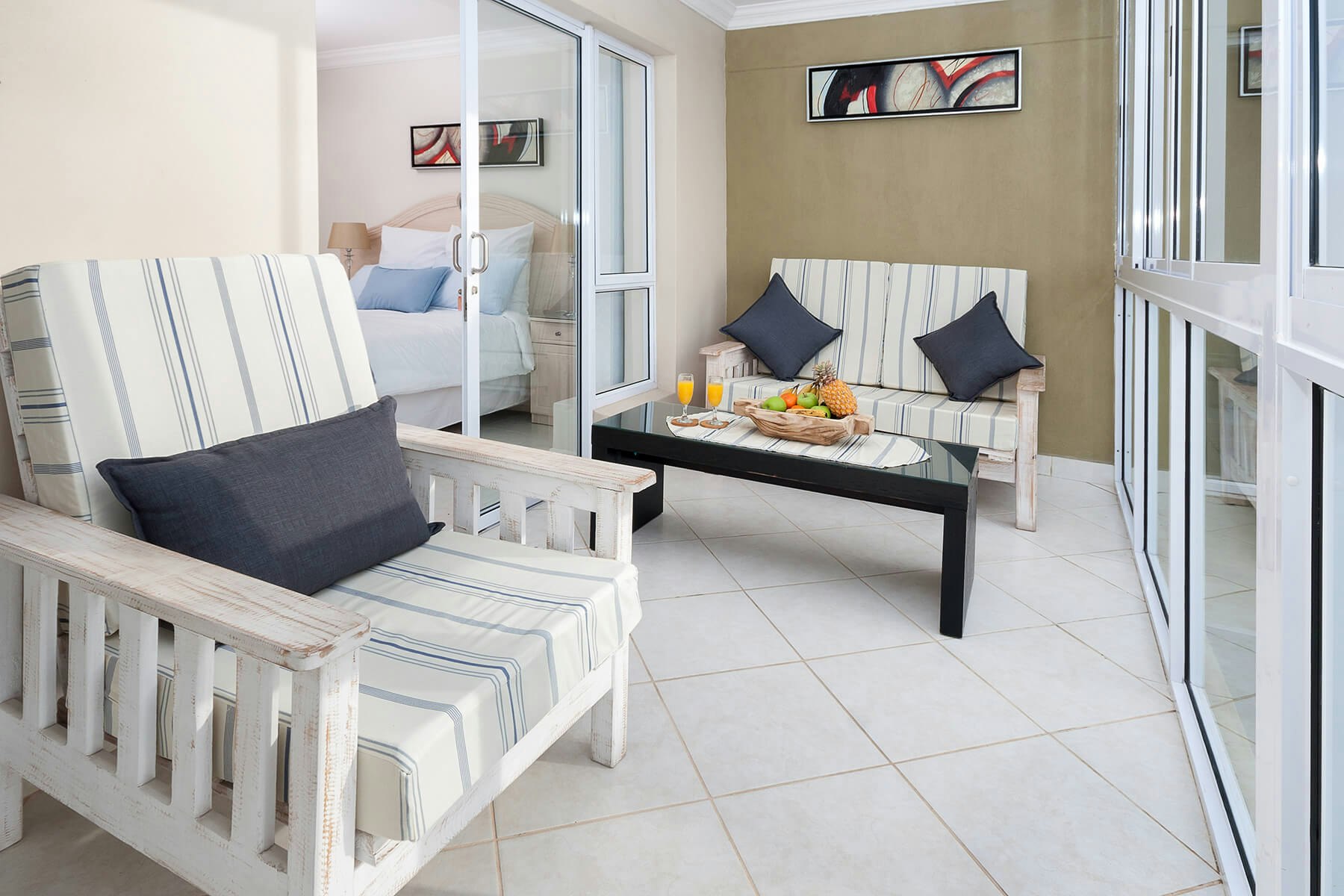 Die ruim, lugtige woonstel het slaapplek vir 6 gaste in 3 slaapkamers en spog met gedeeltelike see-uitsigte. Die hoofslaapkamer het 'n koningingrootte-bed, 'n en suite-badkamer en bied toegang tot die balkon met 'n gedeeltelike see-uitsig. Die tweede slaapkamer het 'n koningingrootte-bed en die derde slaapkamer het 'n koninggrootte-bed wat as 2 enkelbeddens opgemaak kan word. Hierdie slaapkamers deel 'n badkamer.