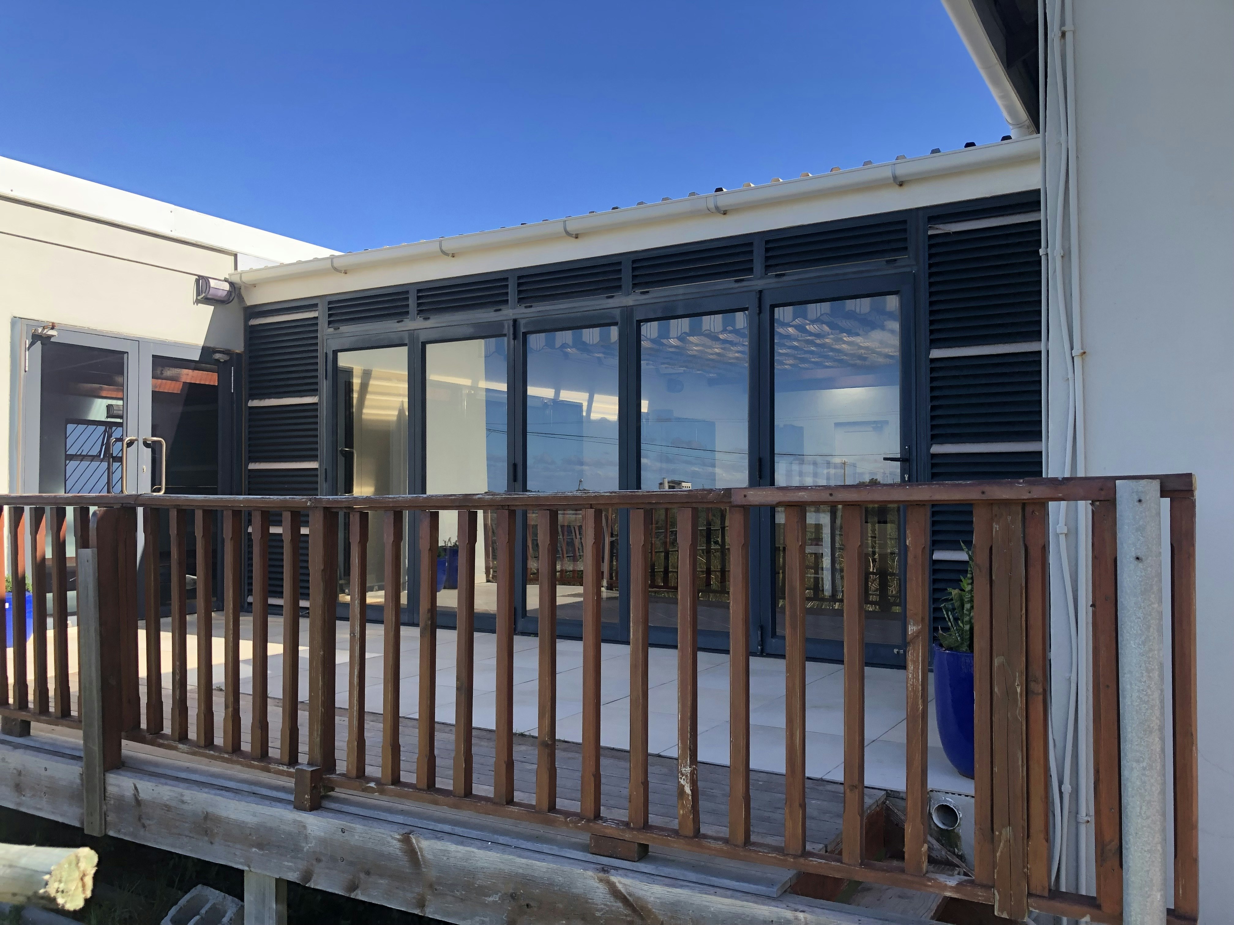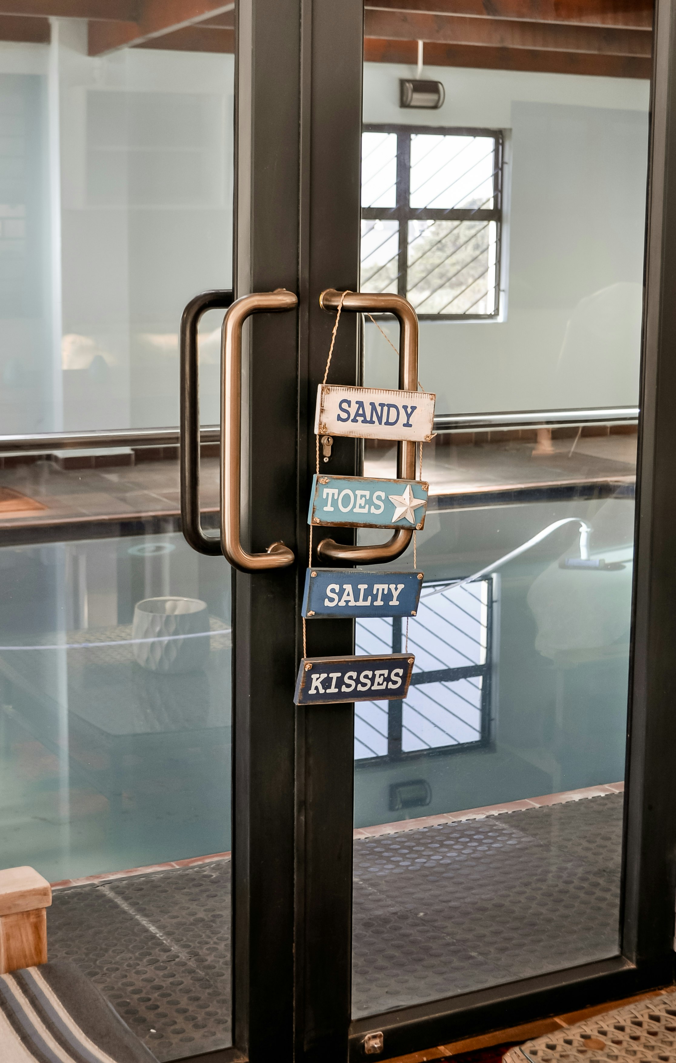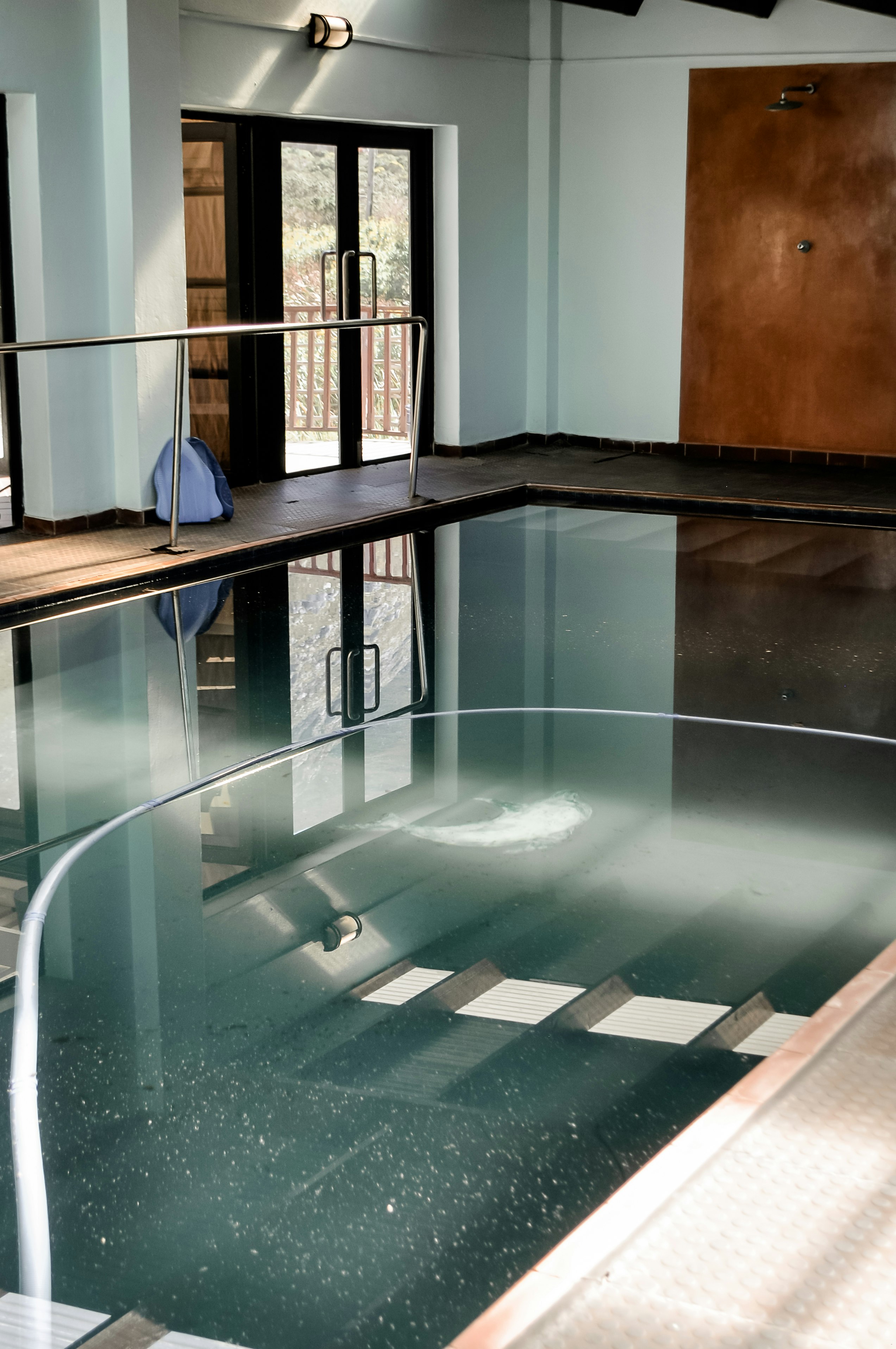 The glass doors lead to the heated indoor swimming pool, where guests can cool down on a hot day, and the glass stack doors open onto the balcony. Free Wi-Fi is also available, and guests have access to secure parking on the premises.