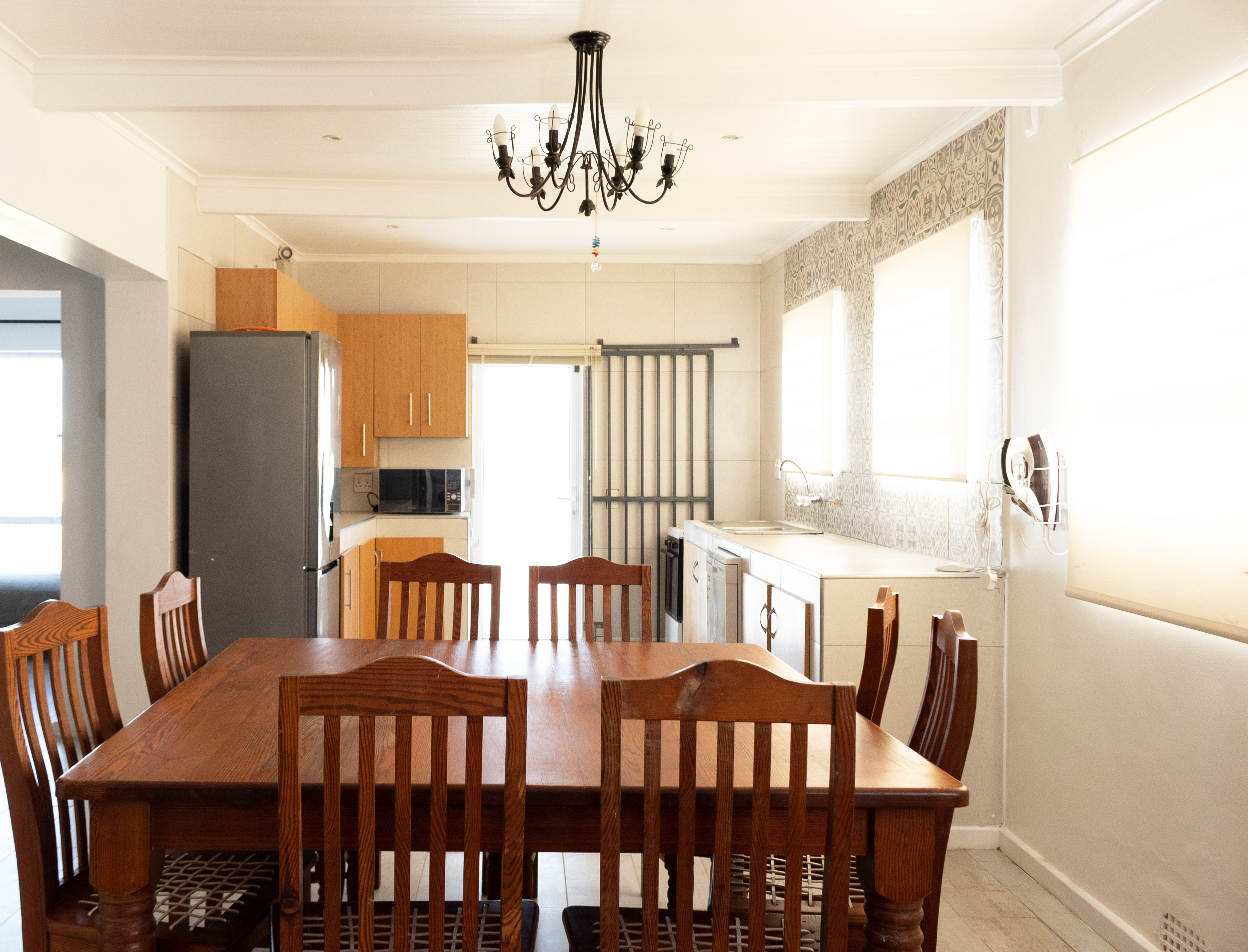 The kitchen is fully equipped with a fridge-freezer, microwave, gas stove and oven, air fryer, press-toaster, cutlery, crockery and other utensils. The large open-plan living area is furnished with comfortable couches, a smart TV, with Google Chromecast installed, a dining table, a pool table and an indoor braai. There is a double sleeper couch in the living area that is suitable for 2 more guests. Wi-Fi is available.