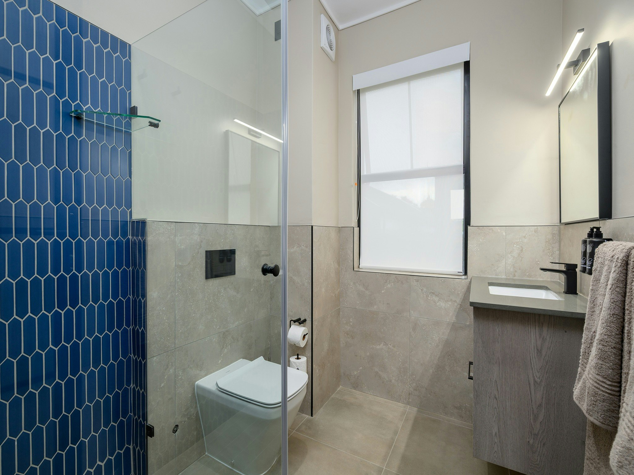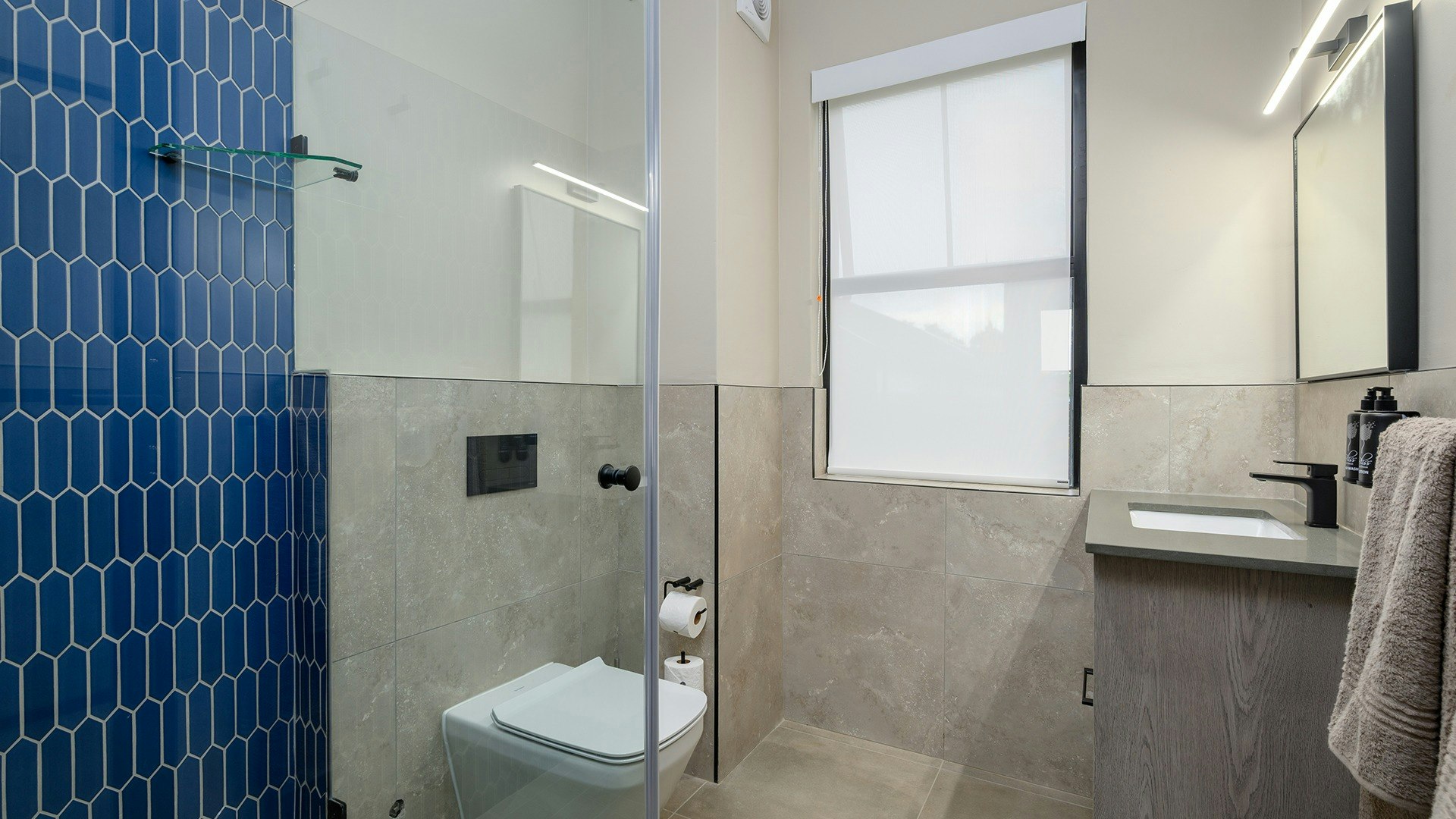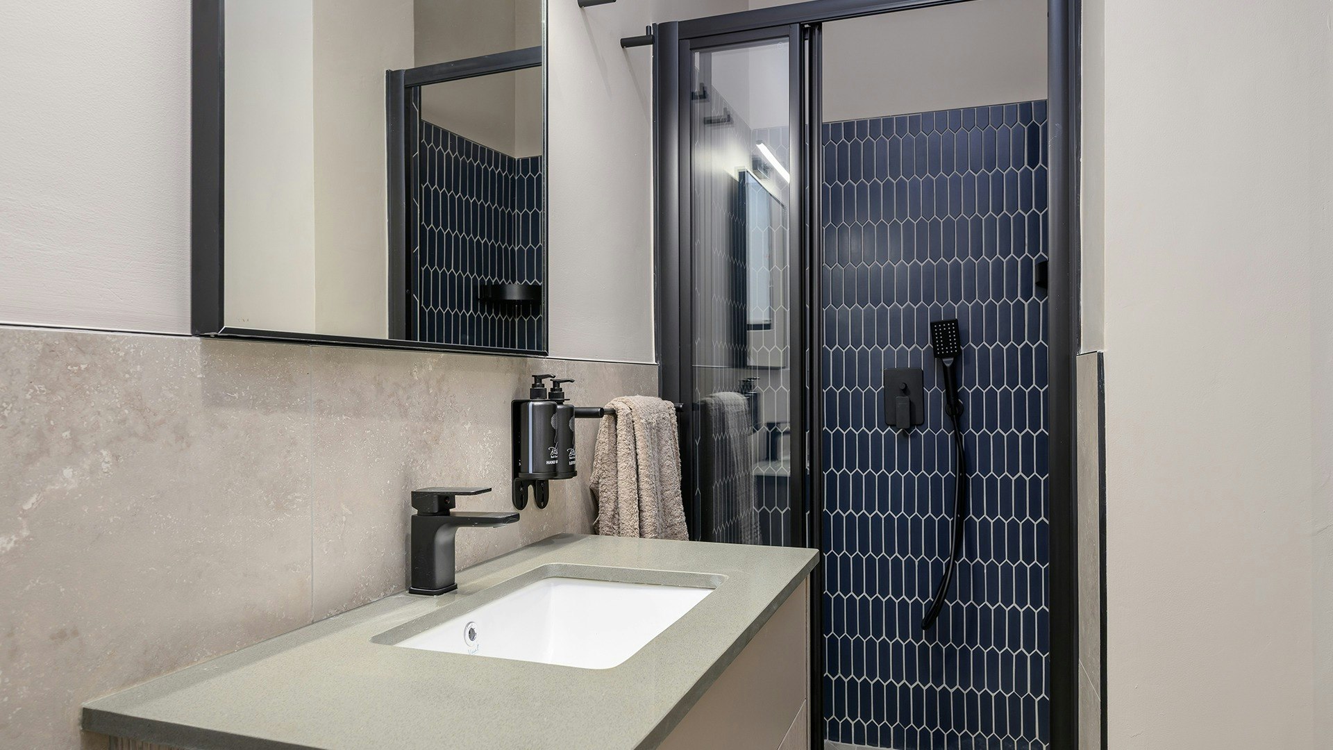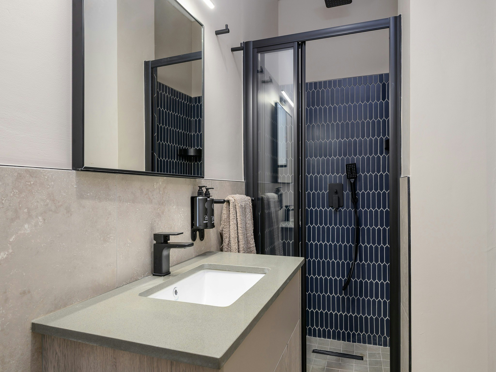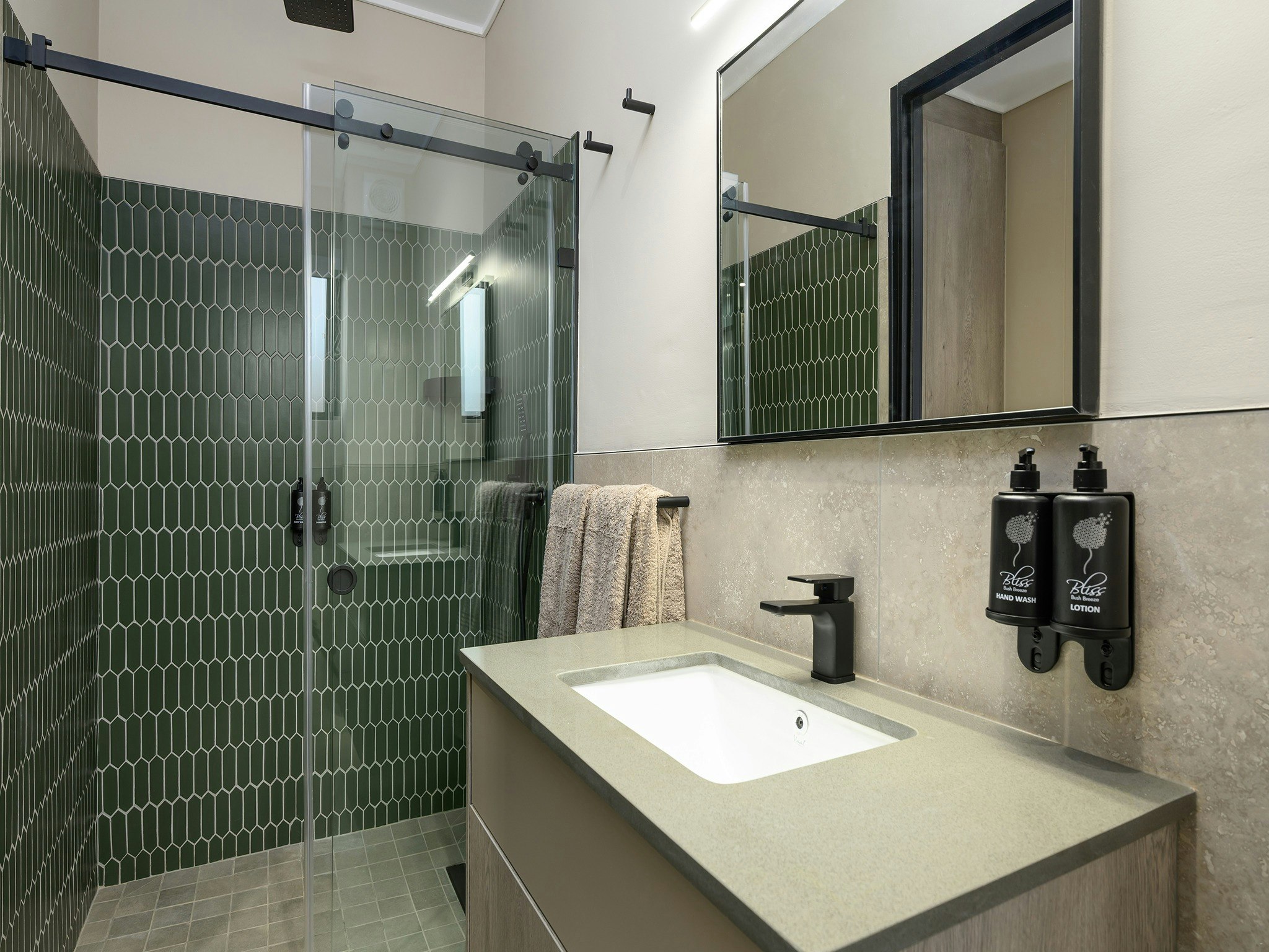 Die woonstelle is gemeubileer met gemaklike beddens en 'n en suite-badkamer met 'n stort, toilet en wasbak.