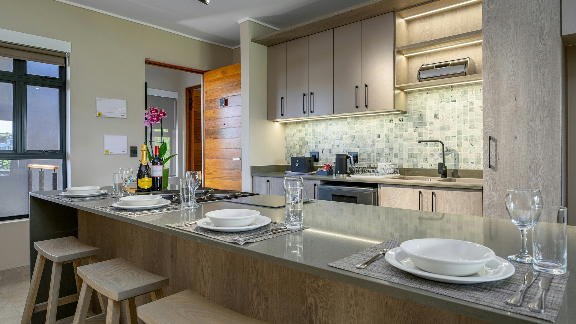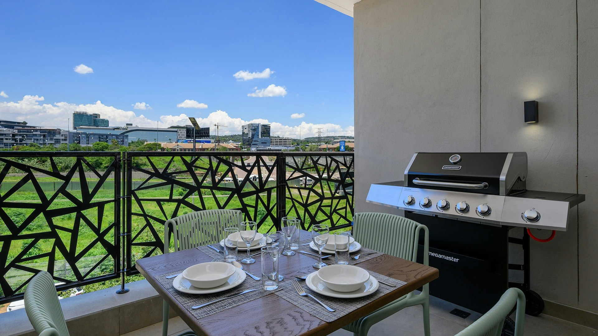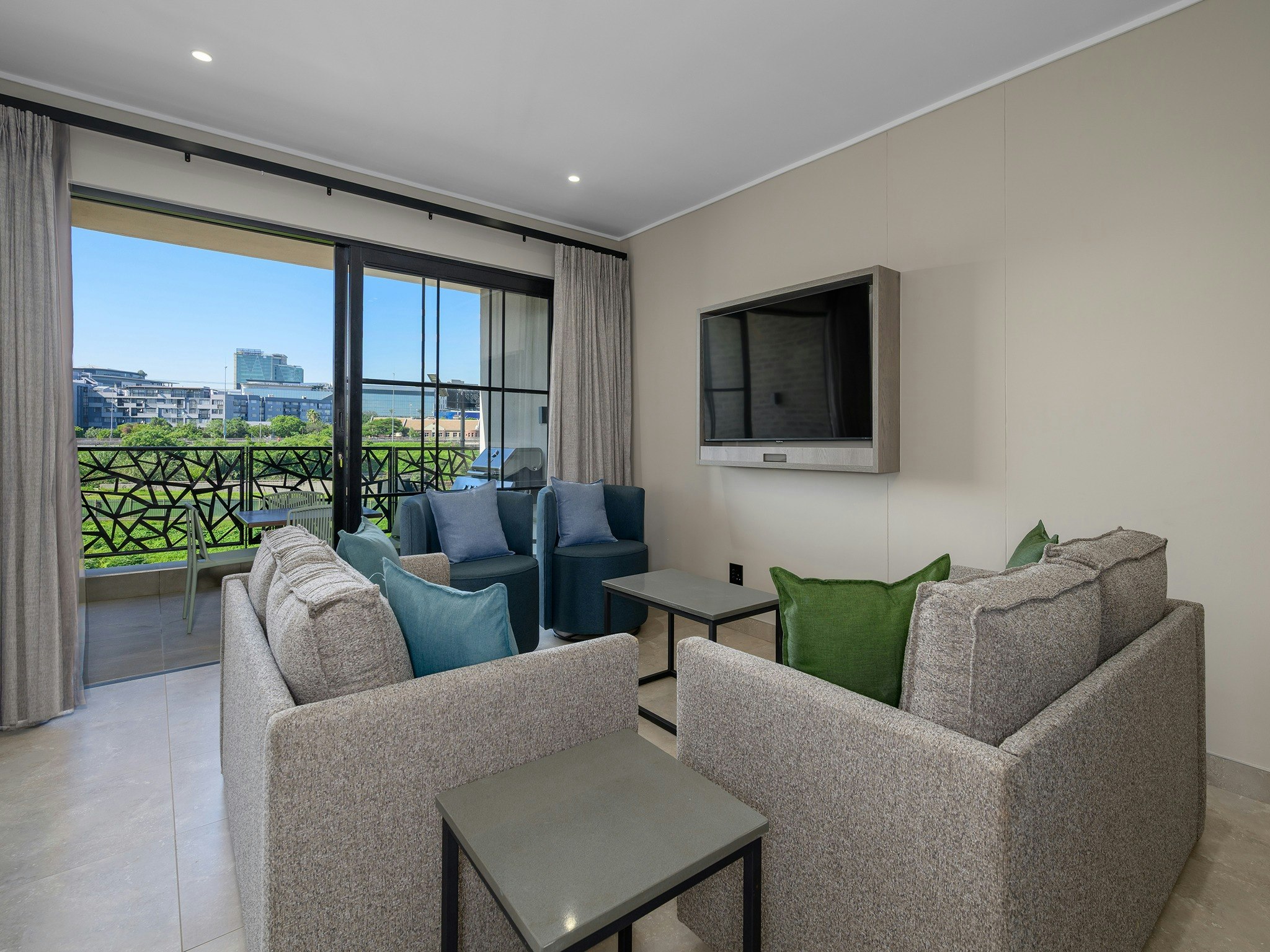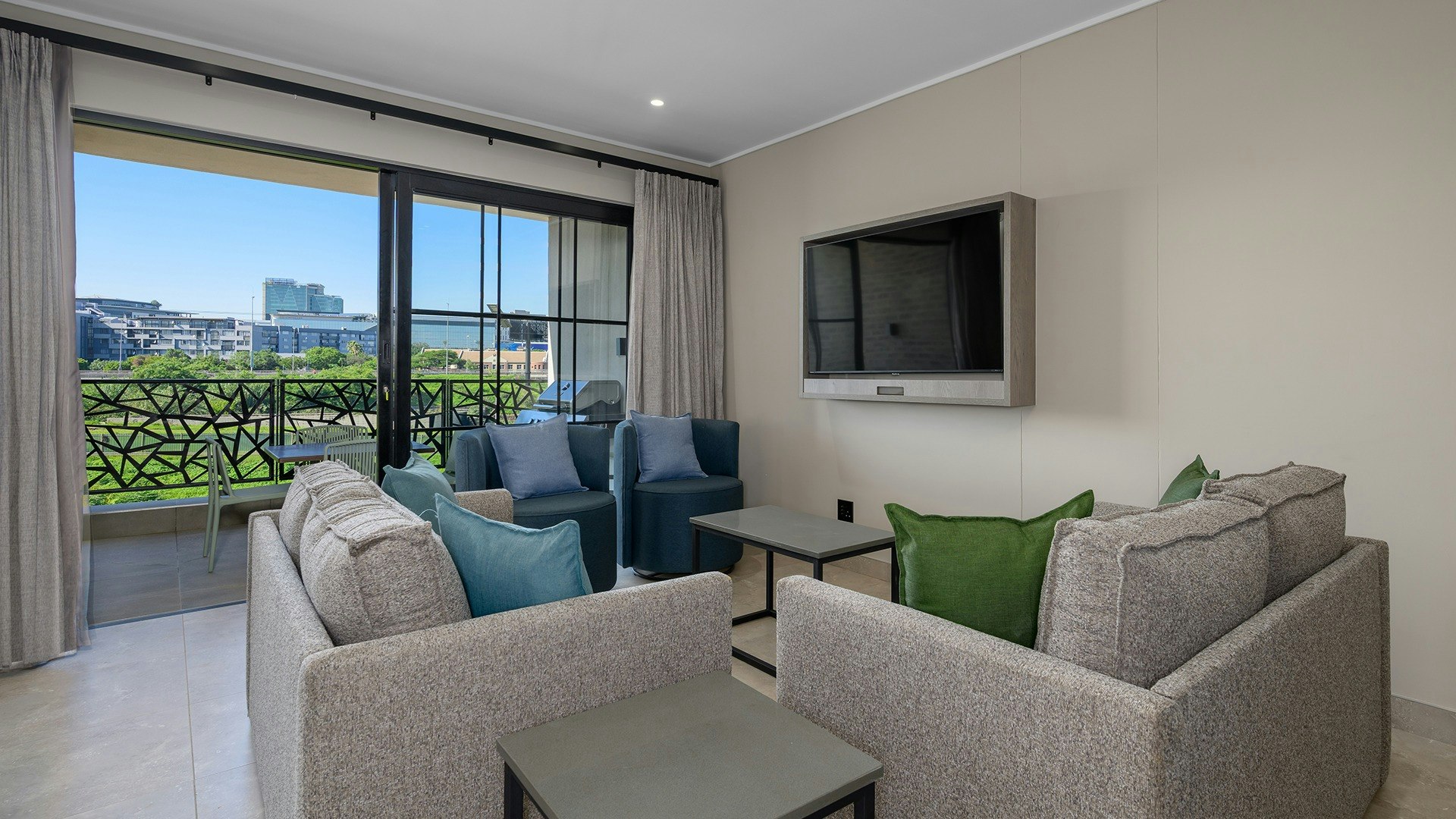 Die oopplan-leefarea beskik oor 'n volledig toegeruste kombuis met 'n stoof, oond, eetgerei, breekware, ketel, mikrogolfoond, yskas-vrieskas, broodrooster en 'n ontbyt-eiland wat in die sitarea vloei. Die sitkamer is gemeubileer met gemaklike sitplek, 'n TV met stroomopsies en WiFi vir u vermaak, en maak oop na 'n balkon met buitemeubels en uitsigte oor die stad.
