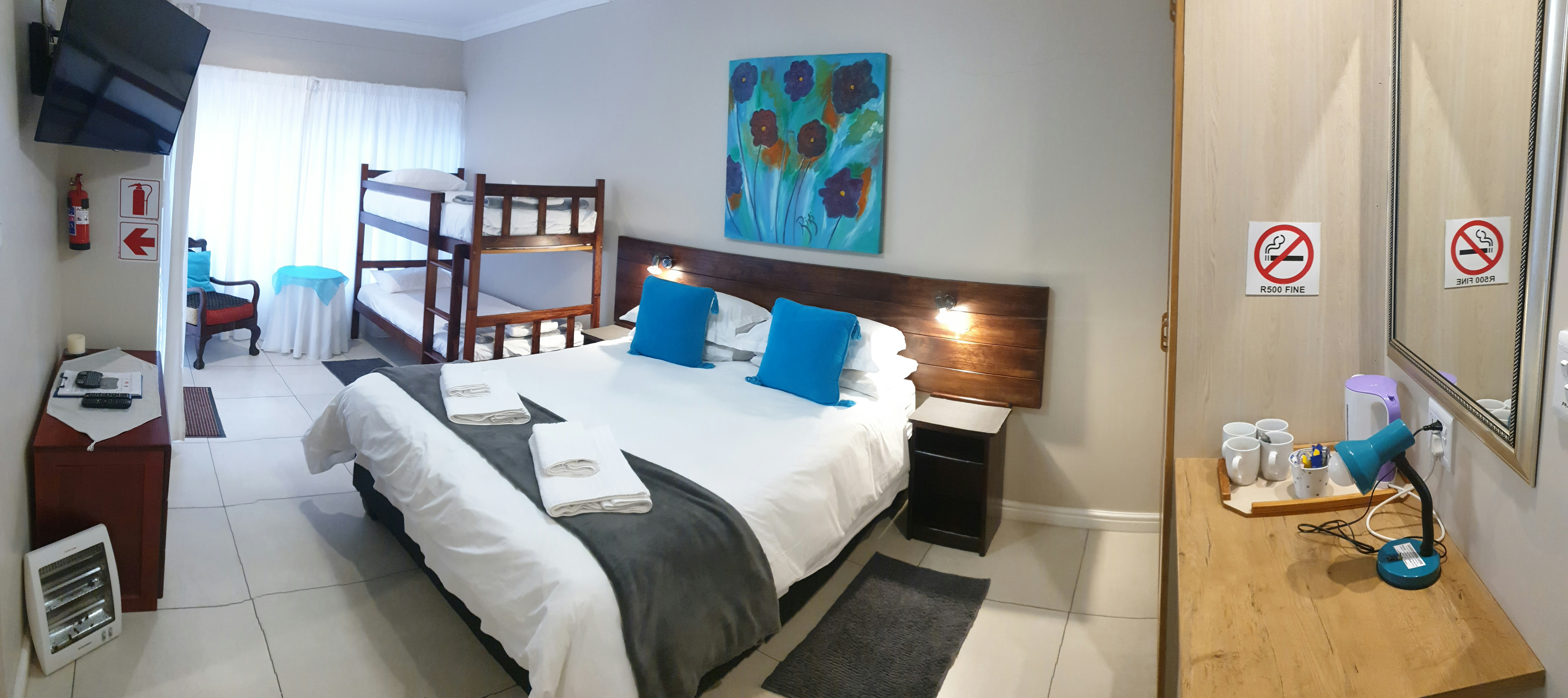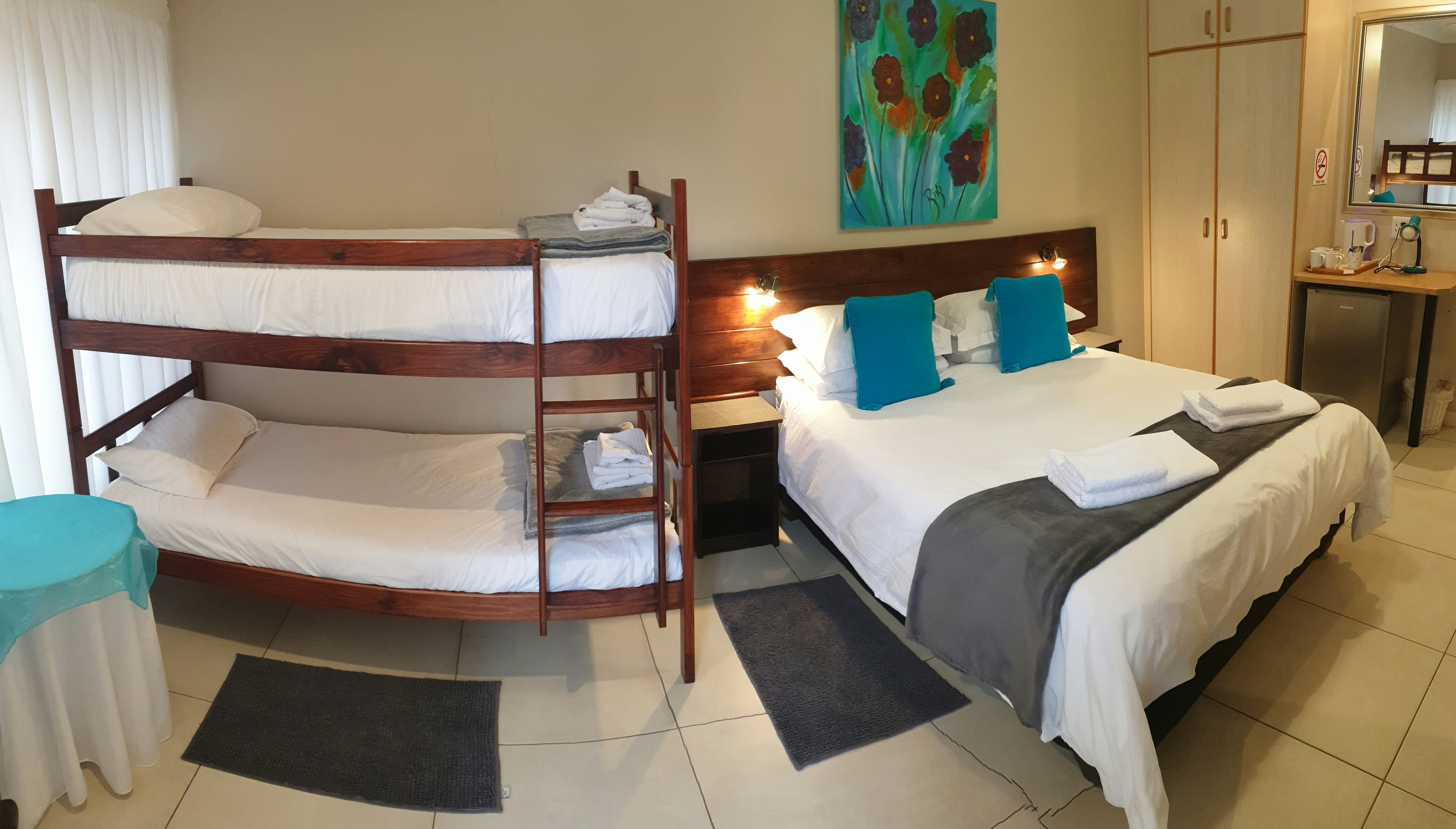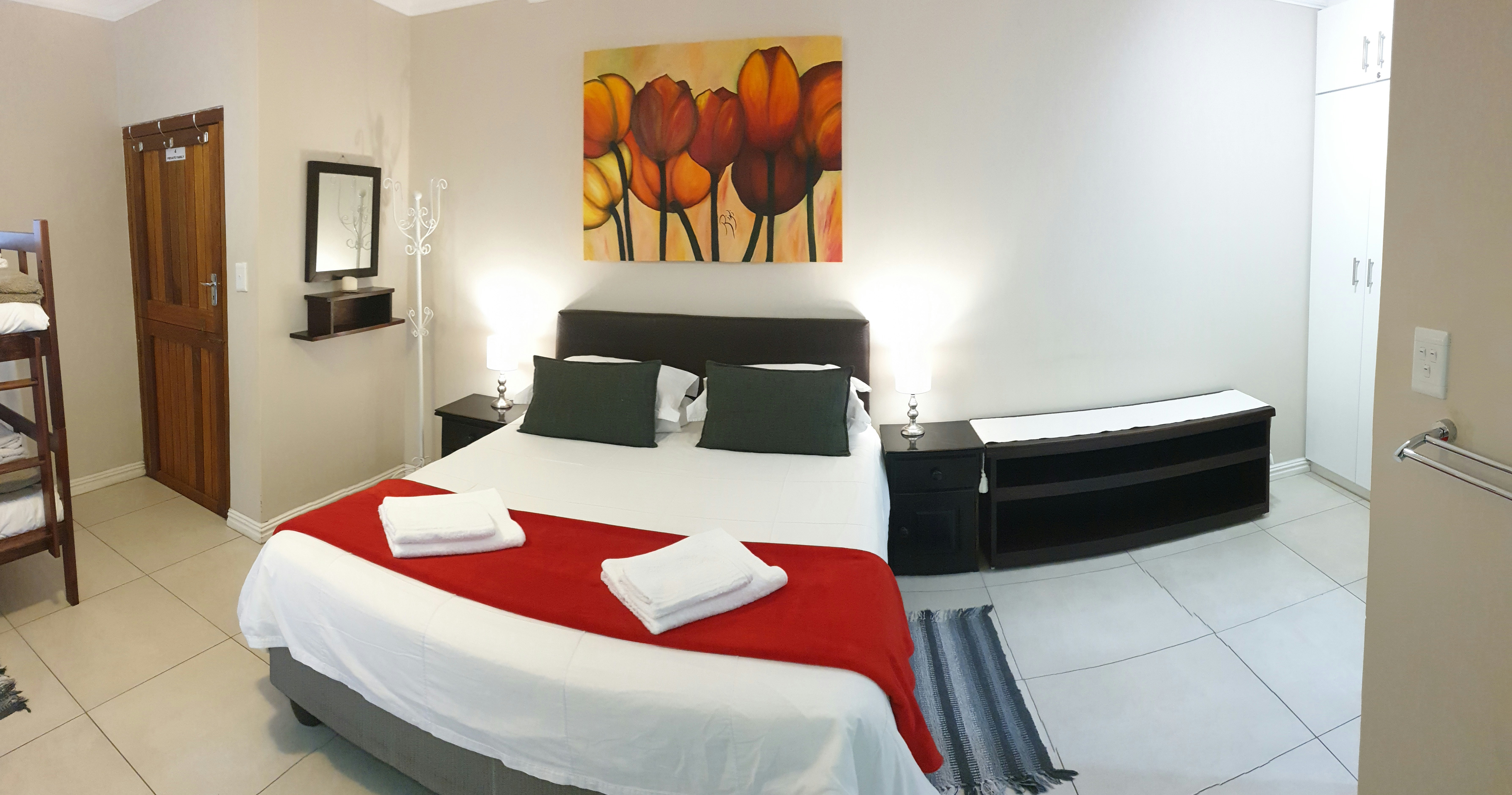 Ons bied verblyf in 3 gesinskamers wat elkeen met 'n koningingrootte-bed en 'n stapelbed ingerig is, en 2 dubbelkamers met 'n koningingrootte- of koninggrootte-bed wat in 2 enkelbeddens omskep kan word. Al die slaapkamers het en suite-badkamers, 'n yskassie, ketel en tee- en koffiemaakgeriewe. Verder is daar 'n toegeruste gemeenskaplike kombuis, sit- en eetarea, en waskamer.