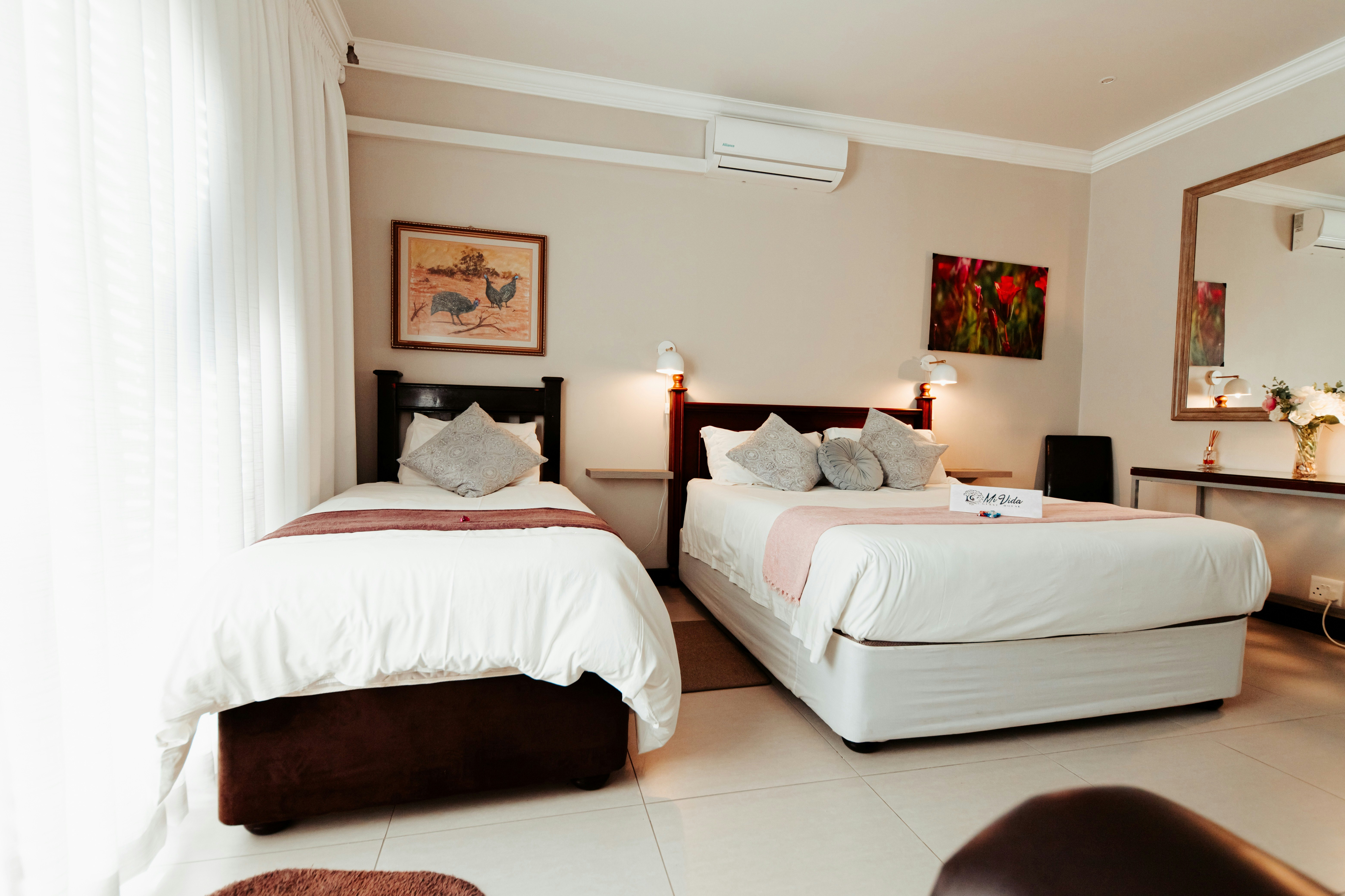 Die kamer is ruim en dit het lugversorging, 'n koningingrootte-bed en 'n driekwartbed. Die en suite-badkamer het 'n bad, shower, wasbak en toilet. Geriewe sluit 'n TV, yskassie, mikrogolf en tee- en koffiemaakgeriewe in. Daar is gratis WiFi.