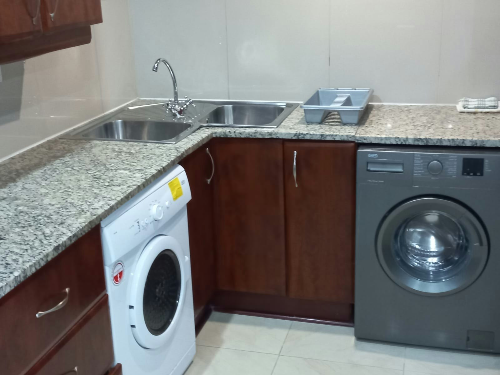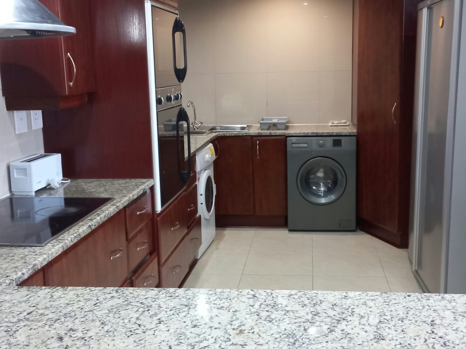 The unit boasts a fully equipped kitchen, including a stove, double oven, microwave, toaster, kettle, fridge-freezer, dishwasher, washing machine, tumble dryer, and a breakfast bar with stools. Guests can enjoy meals at the 6-seater dining table. The adjacent lounge provides comfortable couches to relax on and a flat-screen TV. Free Wi-Fi access is also available.