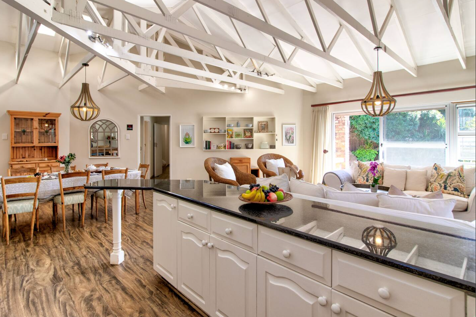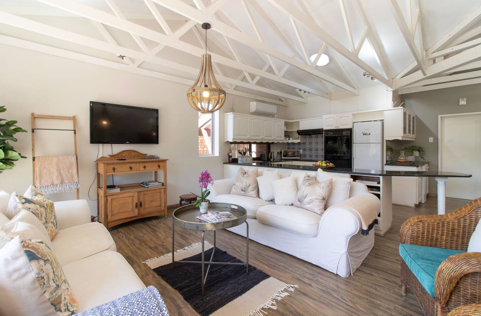 Die leefarea het 'n oopplan-ontwerp met 'n volledig toegeruste kombuis, insluitend 'n stoof, oond op ooghoogte, mikrogolfoond, yskas-vrieskas, eetgerei en breekware. 'n Eetkamertafel met 8 sitplekke strek uit die kombuis — perfek vir gedeelde maaltye. Die sitkamer is gemeubileer met gemaklike sitplek en 'n TV, asook gratis WiFi.