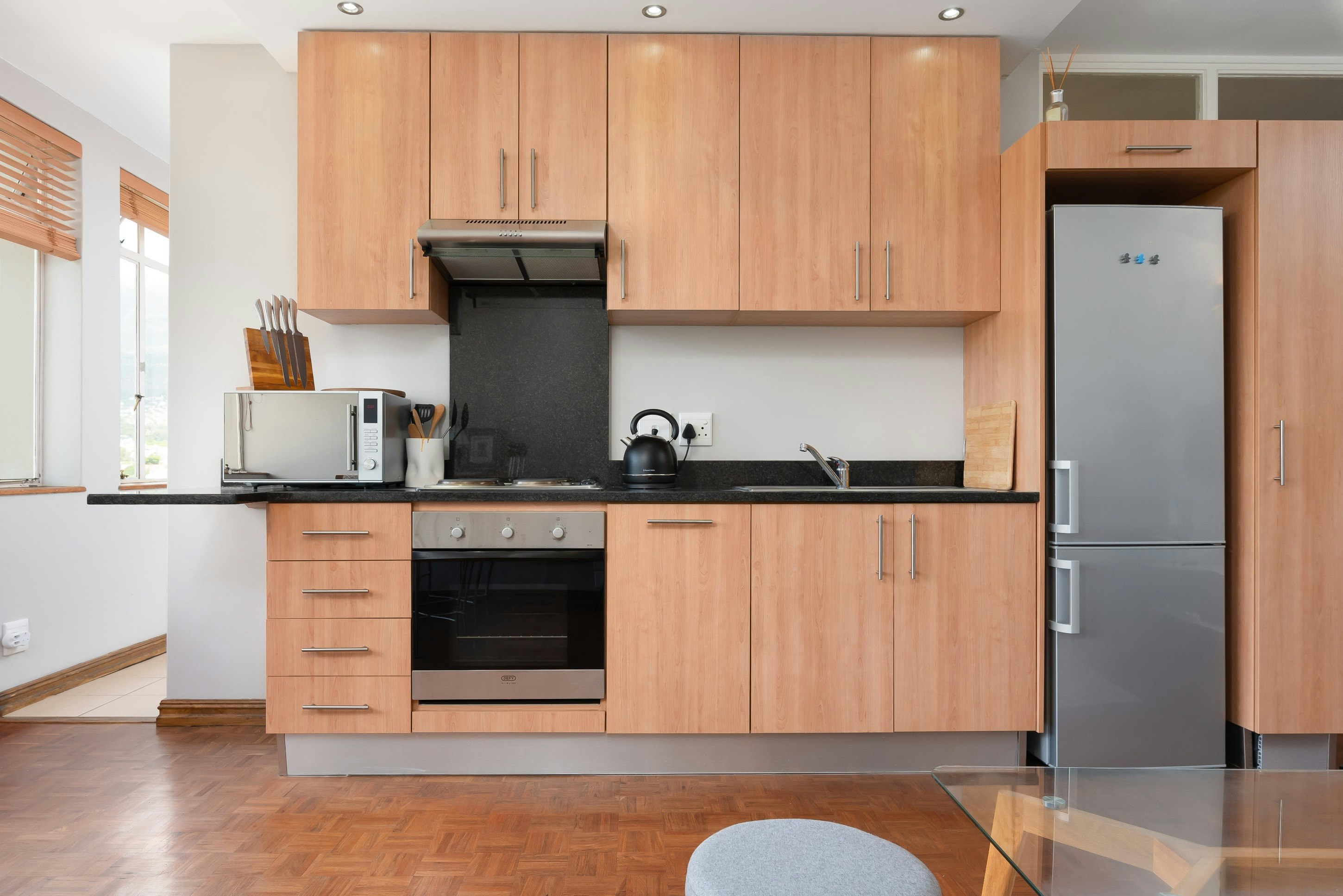 Die oopplan-leefarea beskik oor gemaklike sitplek, 'n TV, 'n eetkamertafel en 'n volledig toegeruste kombuis met 'n yskas-vrieskas, stoof, oond, mikrogolfoond en koffie- en teemaakgeriewe. 'n Wasmasjien is ook in die badkamer beskikbaar.