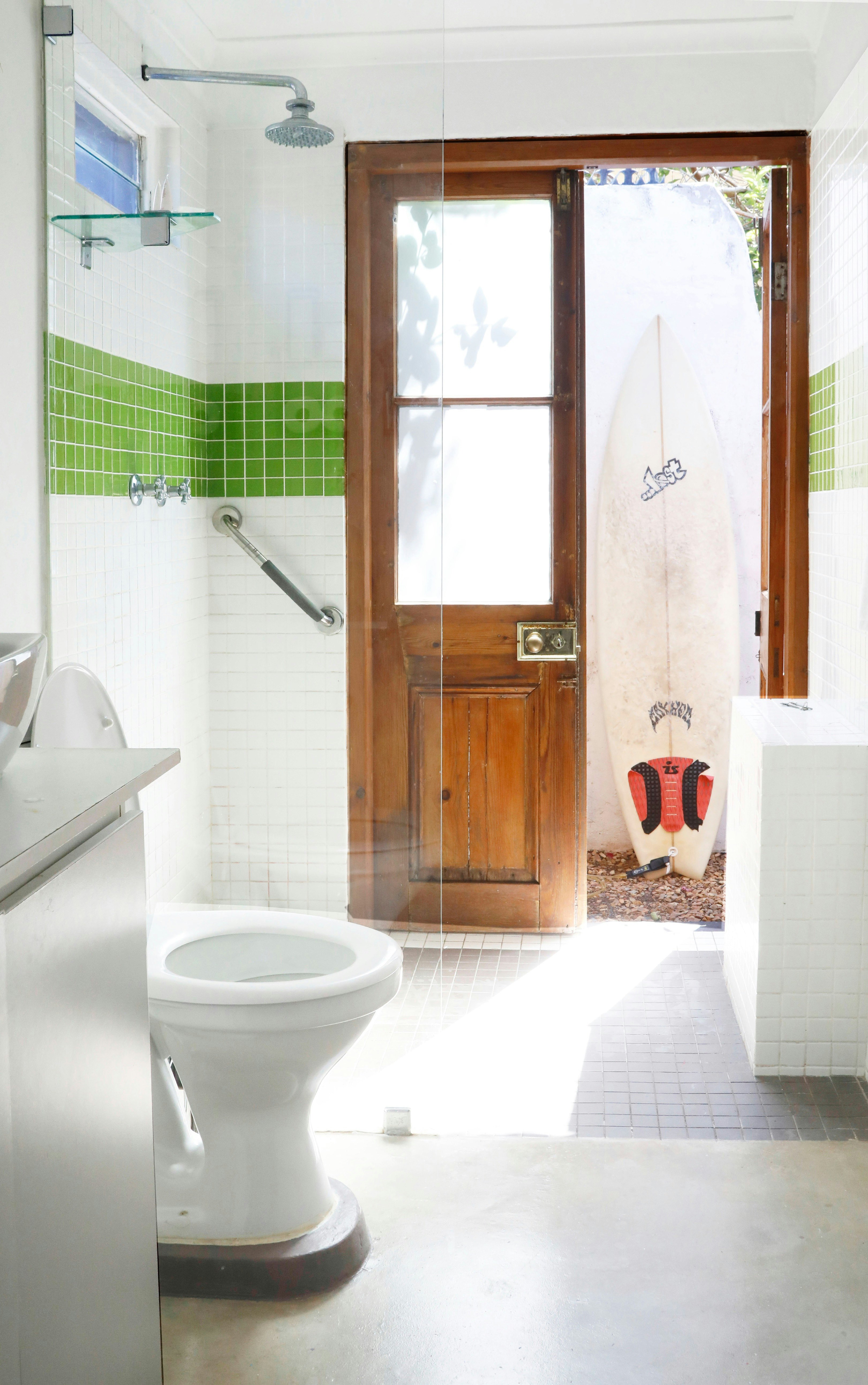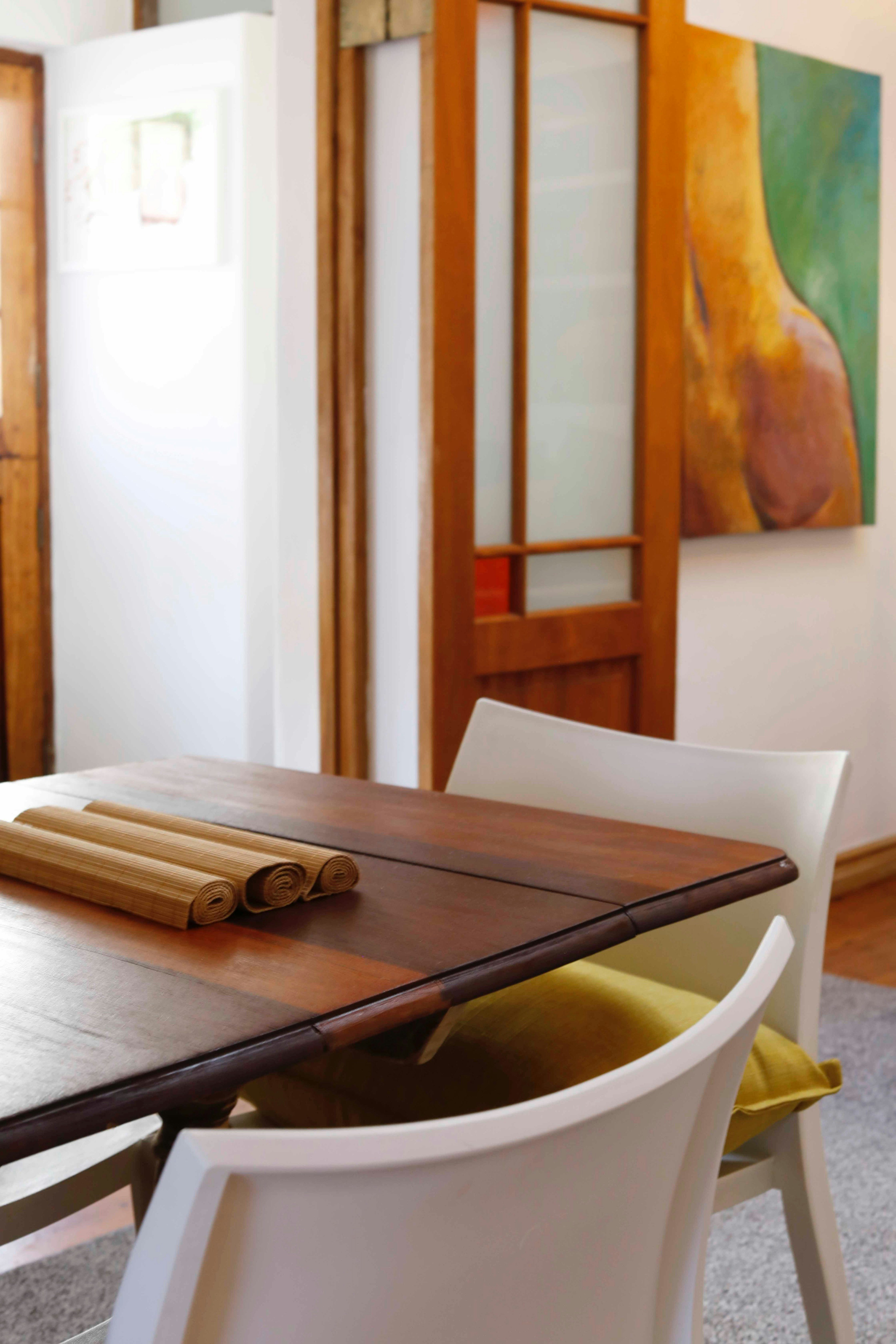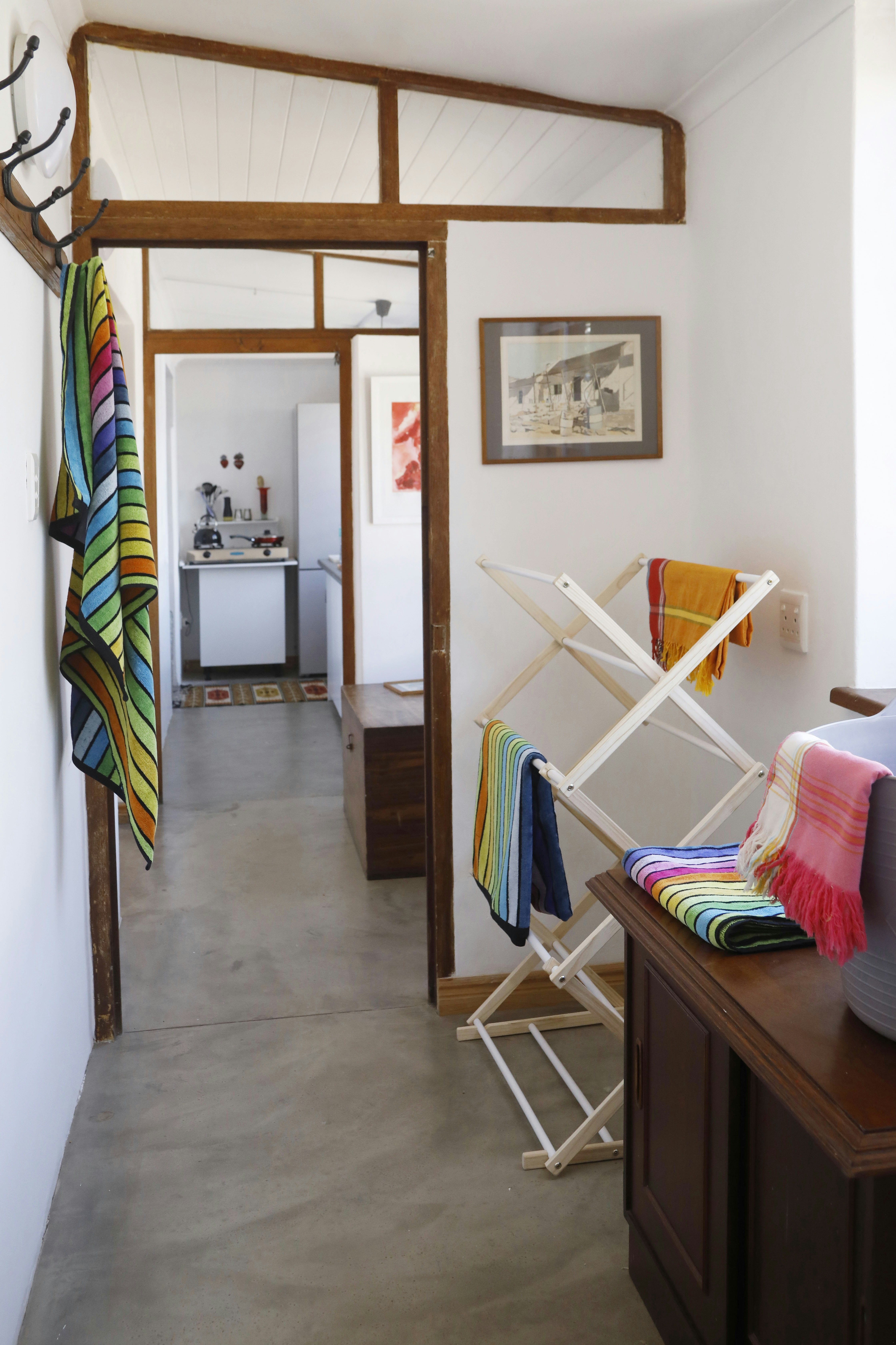 Die sitarea het 'n 2-sitplek eetkamertafel. Deure maak oop na 'n klein buite area waar branderplanke gehou kan word of handdoeke veilig gelaat kan word om droog te word. Die leefarea is oopplan en lei na die wasarea, badkamer en kombuis.