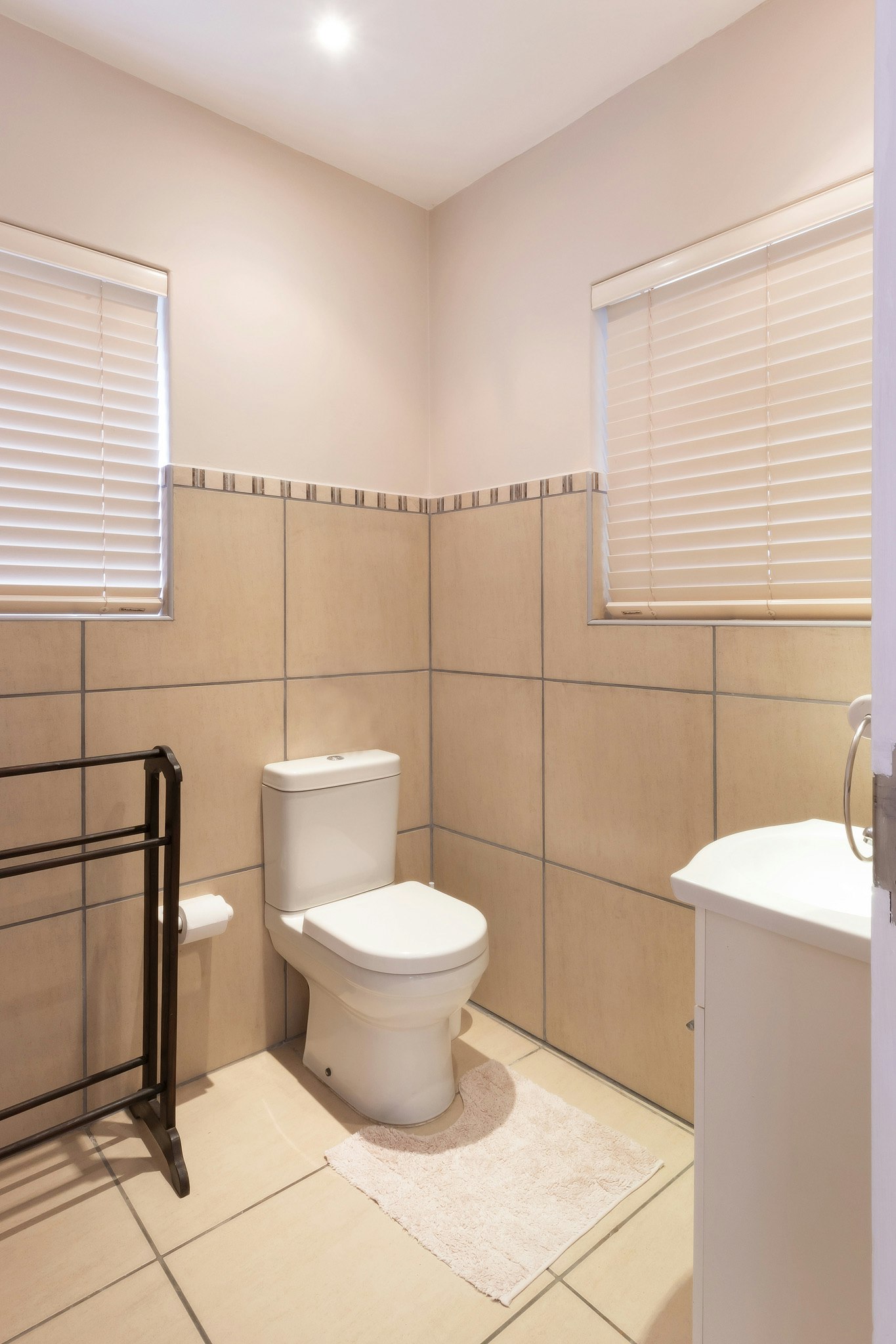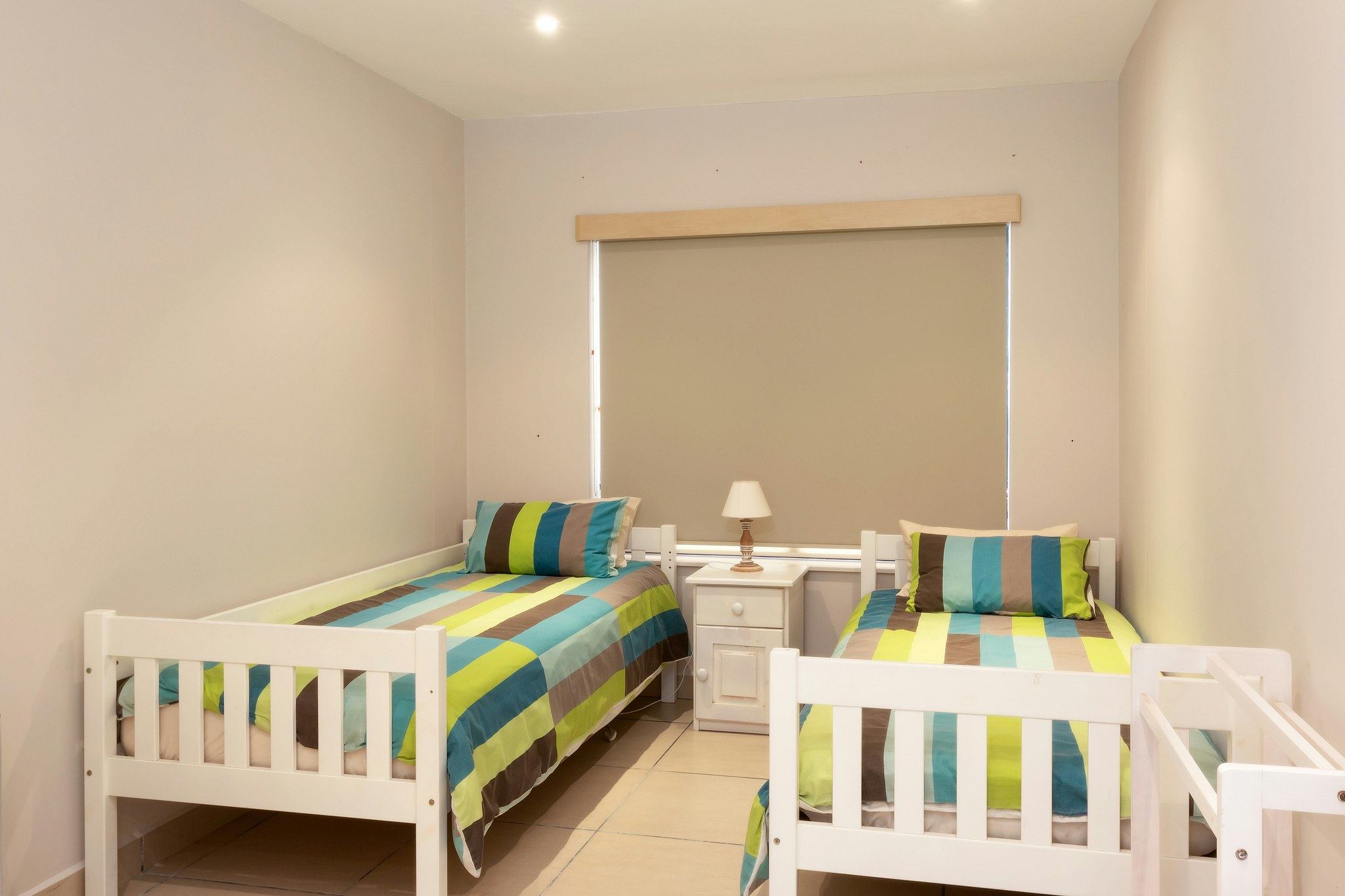 Die hoofslaapkamer het 'n dubbelbed en 'n en suite-badkamer met 'n bad. Die tweede slaapkamer het 'n dubbelbed en die derde slaapkamer het 2 enkelbeddens. Die tweede badkamer het 'n stort, 'n toilet en wasbak. Daar is ook 'n aparte gastetoilet.